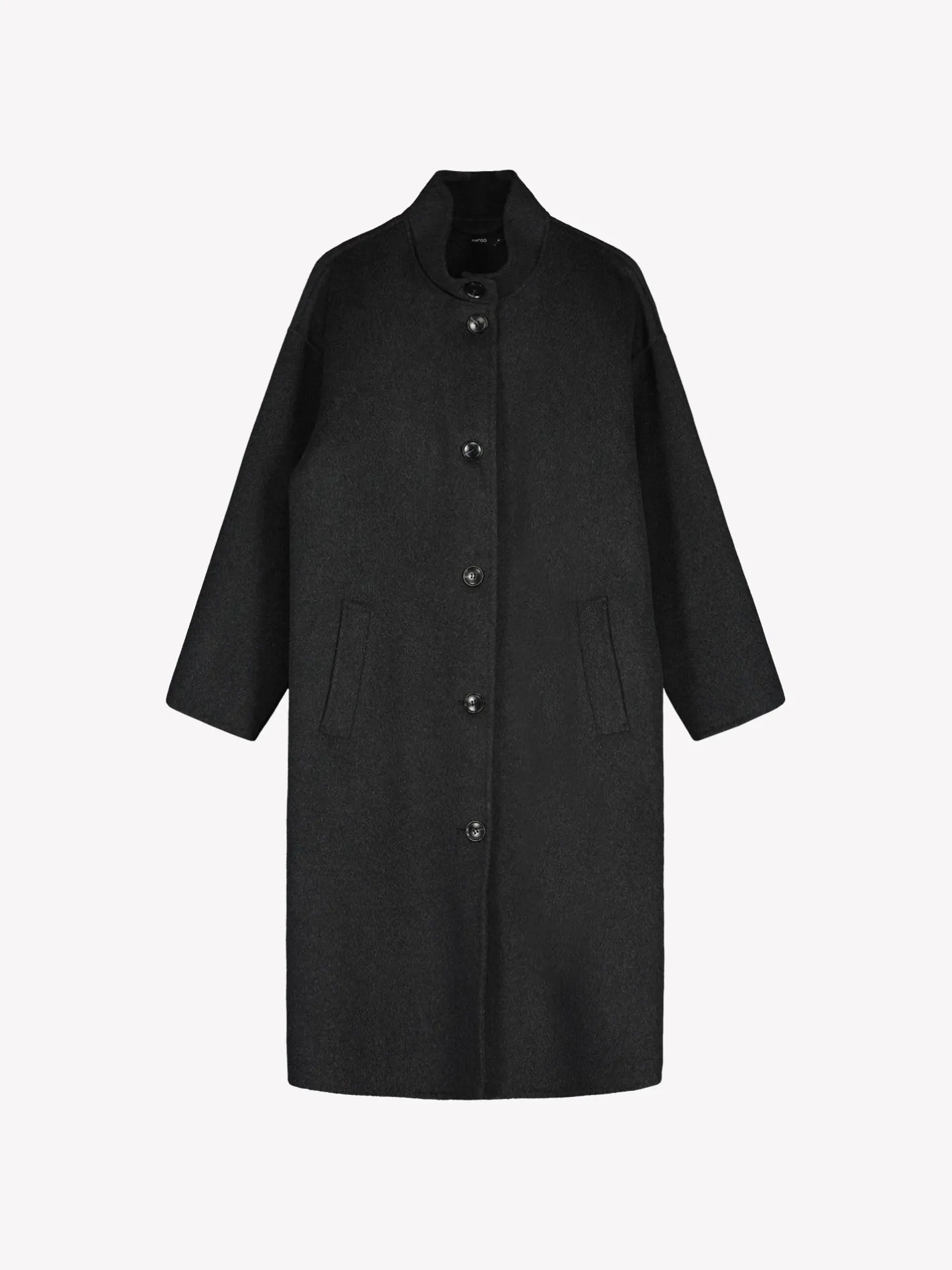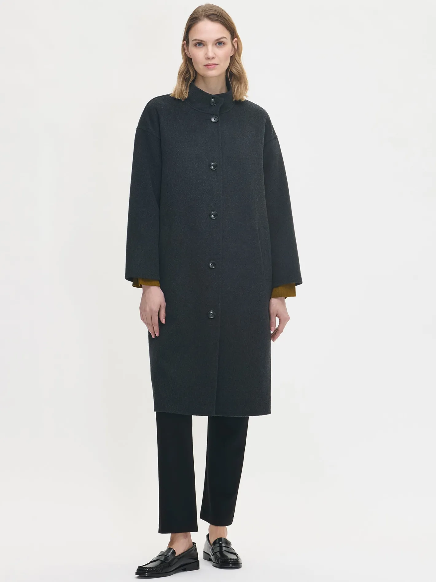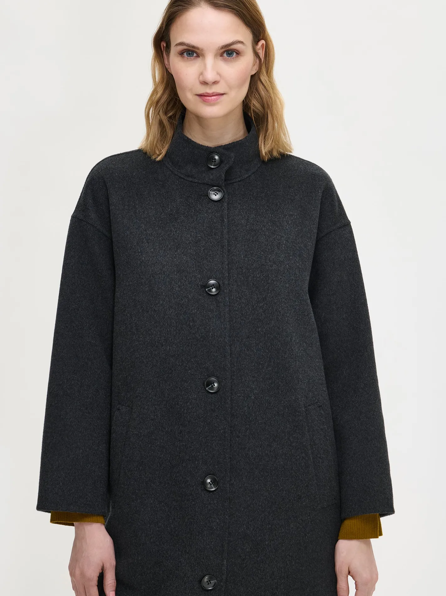 Naisten pitkä tummanharmaa Elle-villakangastakki matalalla pystykauluksella. Ajaton ja elegantti villakangastakki kuuluu jokaiseen vaatekaappiin. Elle-takki tuo tyyliä niin arkipukeutumiseen kuin juhlavampiin tilaisuuksiin. Materiaali on laadukasta villa-polyesteri sekoitetta. Vuorittoman takin saumat ovat kauniisti sisältä ja ulkoa huolitellut. Takissa on edessä nappikiinnitys ja listataskut. Olkalinja on pudotettu ja takki hieman alaspäin kapenevaa mallia. Takin pituus koossa M on noin 110 cm.