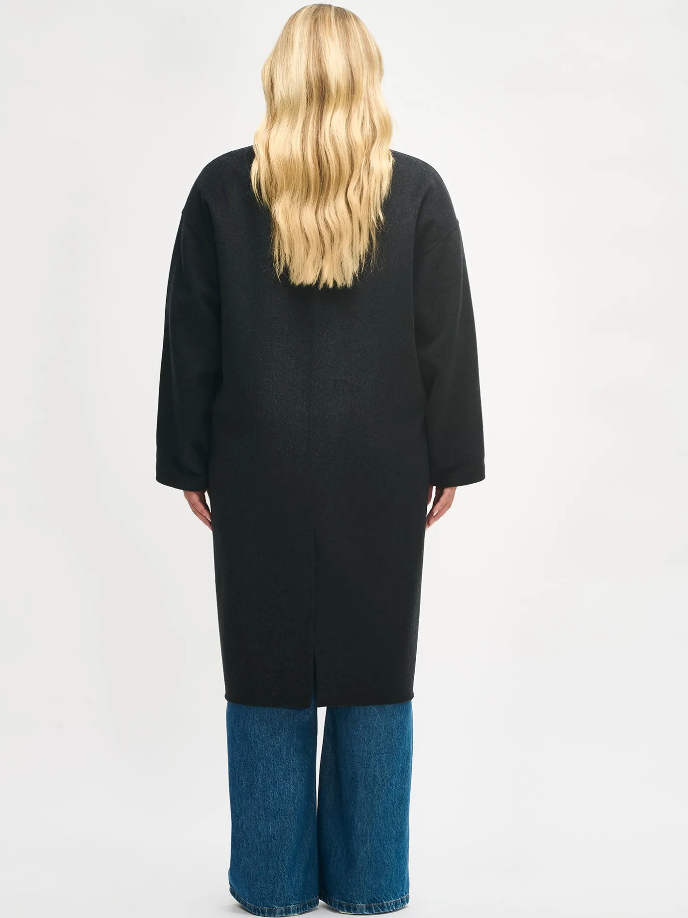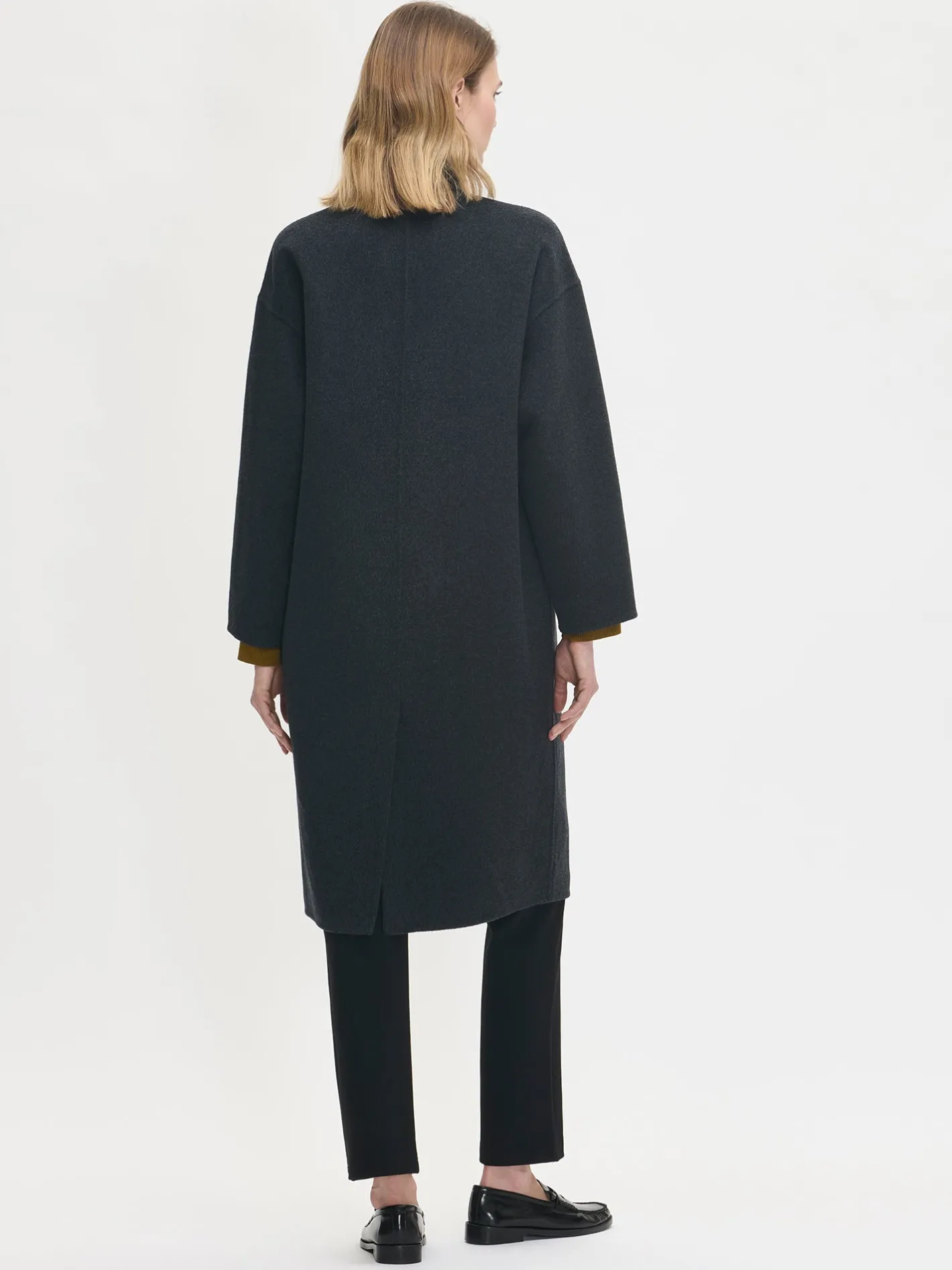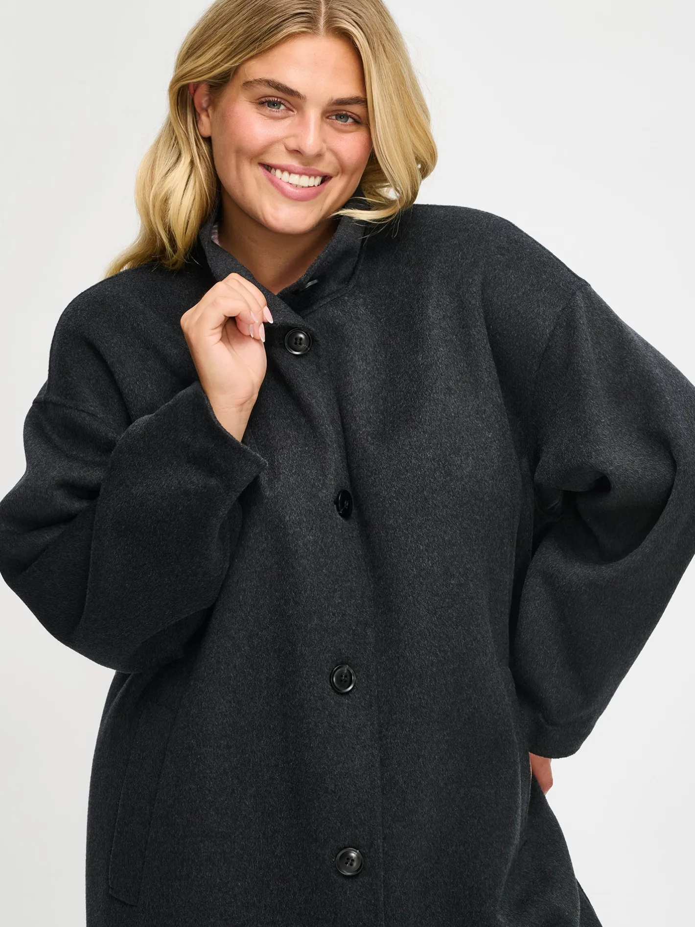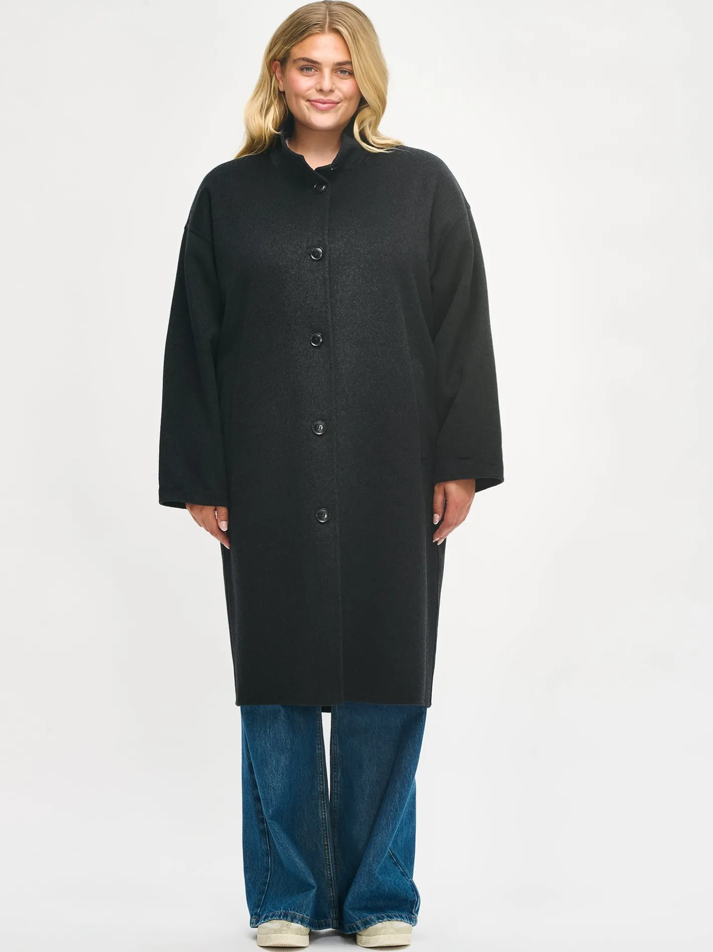 Naisten pitkä tummanharmaa Elle-villakangastakki matalalla pystykauluksella. Ajaton ja elegantti villakangastakki kuuluu jokaiseen vaatekaappiin. Elle-takki tuo tyyliä niin arkipukeutumiseen kuin juhlavampiin tilaisuuksiin. Materiaali on laadukasta villa-polyesteri sekoitetta. Vuorittoman takin saumat ovat kauniisti sisältä ja ulkoa huolitellut. Takissa on edessä nappikiinnitys ja listataskut. Olkalinja on pudotettu ja takki hieman alaspäin kapenevaa mallia. Takin pituus koossa M on noin 110 cm.