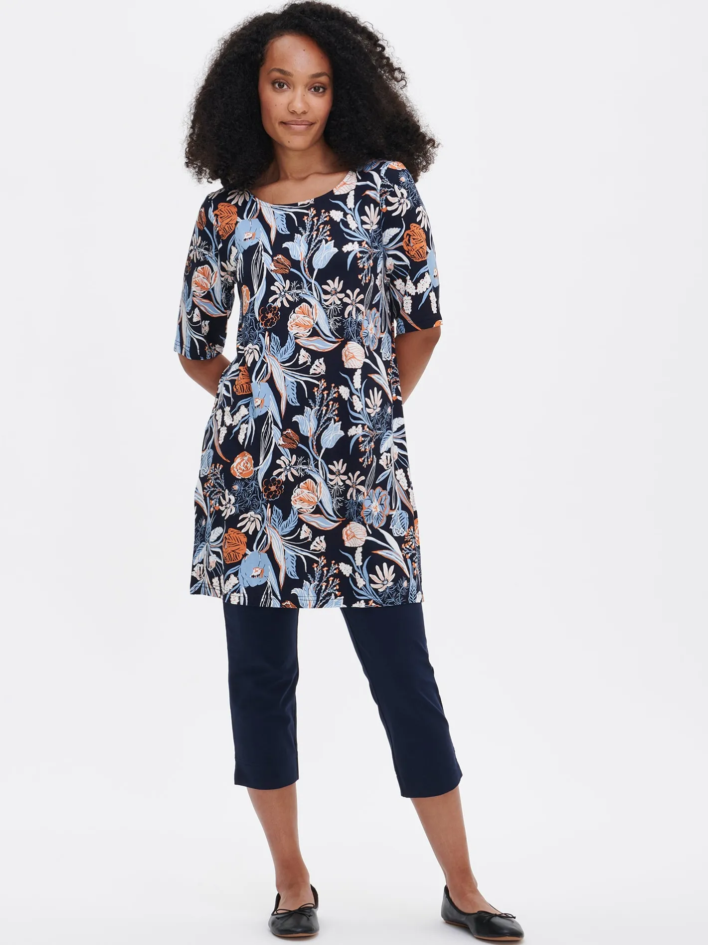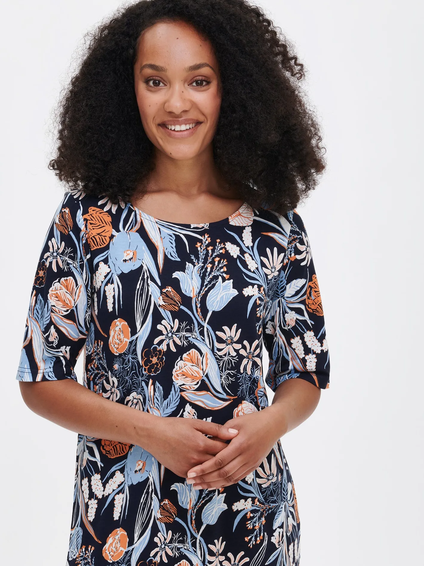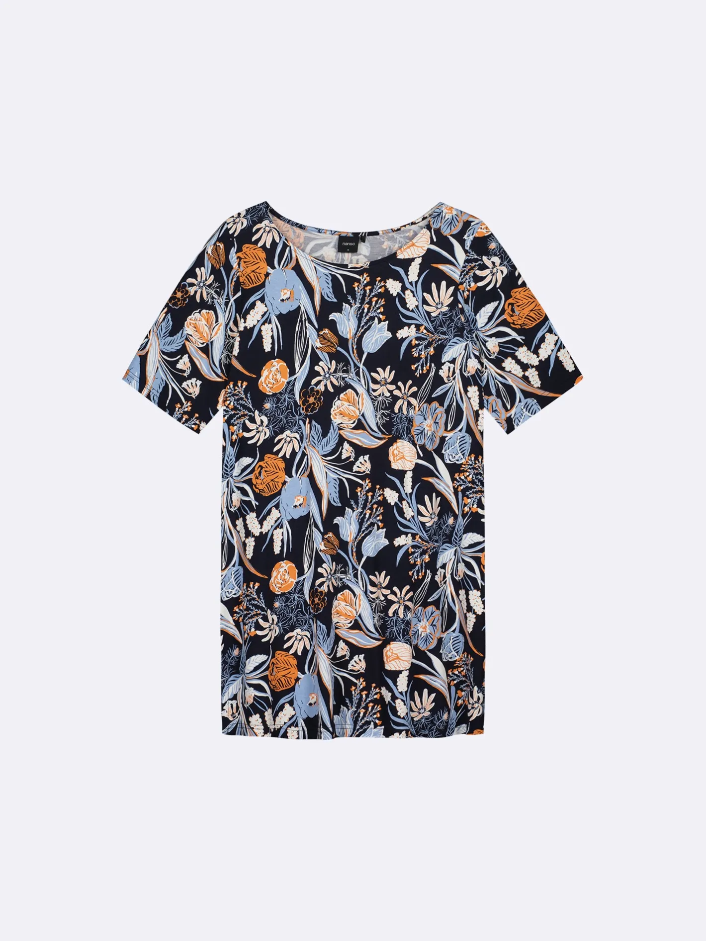 Naisten tummansininen Floristi-tunika kukkakuviolla. Väljässä tunikassa on kantilla viimeistelty ovaali pääntie ja puolipitkät hihat. Helmassa on korkeammat sivuhalkiot Tunikan pituus koossa M on noin 80 cm. Tuote on valmistettu LENZING™ ECOVERO™ -viskoosista. Materiaali on laadukasta ja miellyttävän tuntuista viskoosi-elastaani-neulosta. Viskoosineulos on sähköistymätöntä ja helppohoitoista. Materiaalille on ominaista 3-5 % kutistuminen ensimmäisessä pesussa.