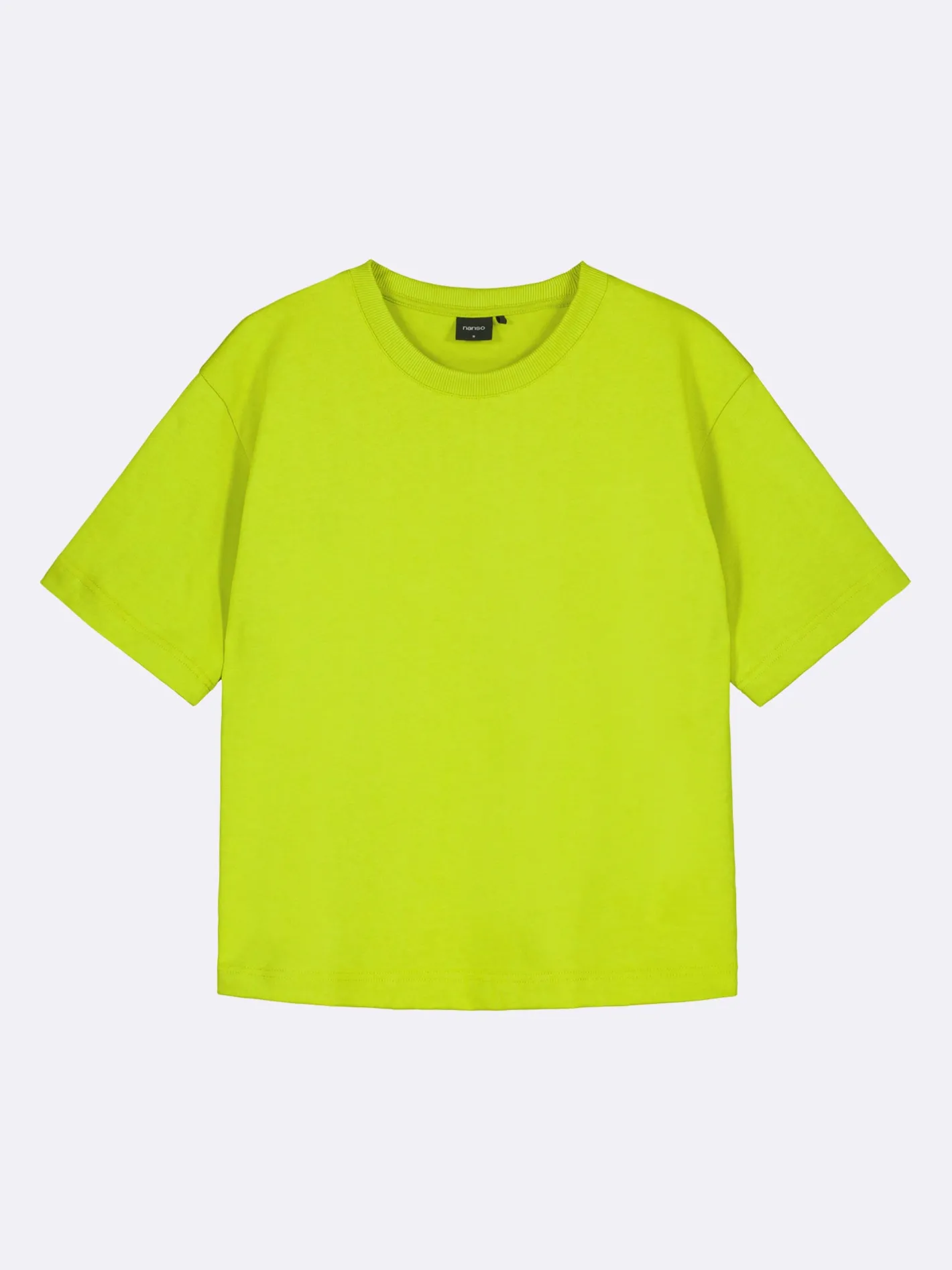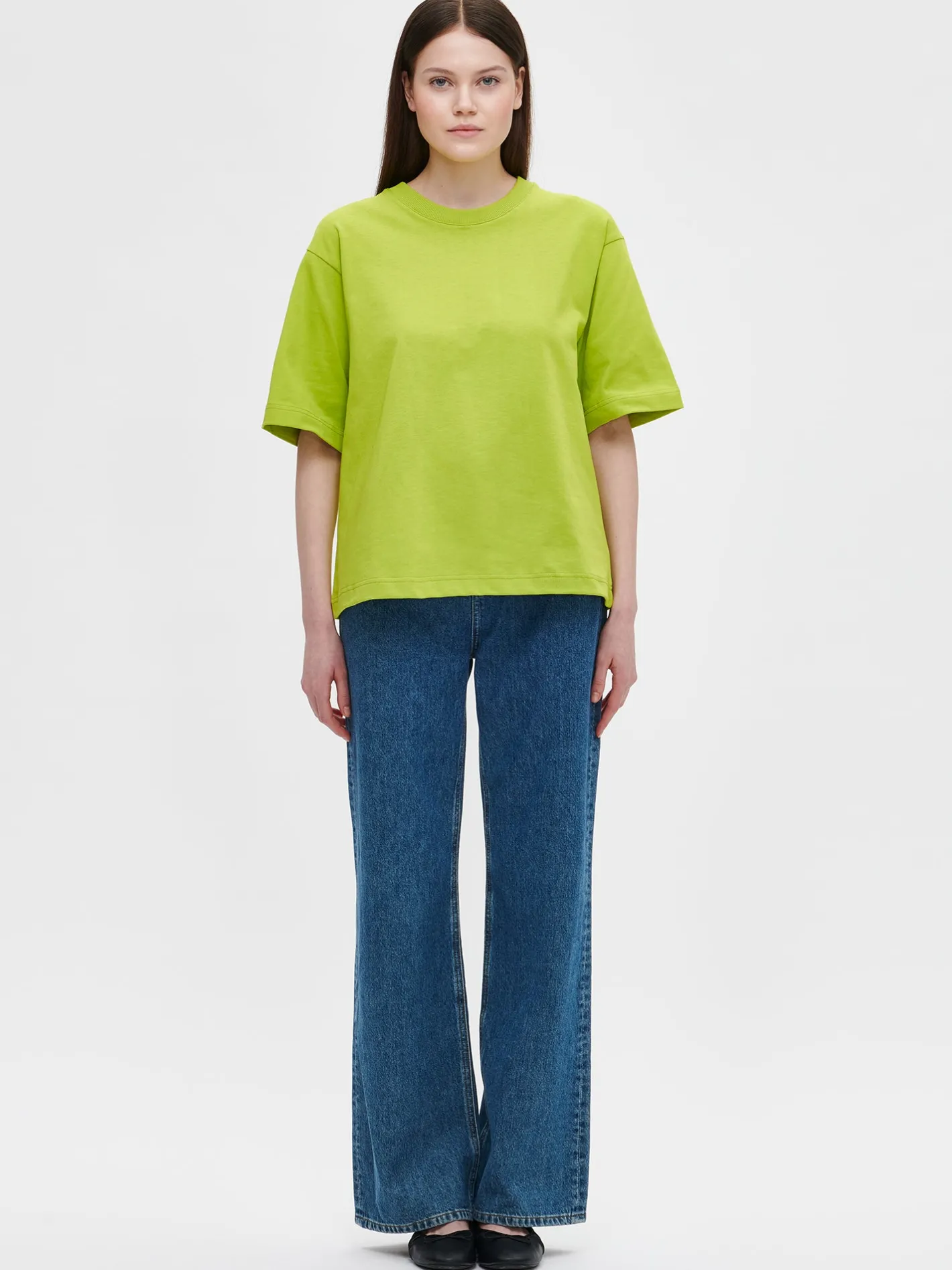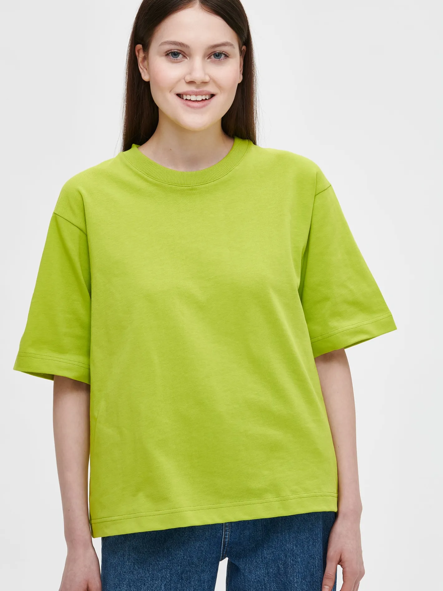 Naisten rento vihreä Forma t-paita. Laatikkomallisessa väljässä t-paidassa on pyöreä ribbipääntie ja 2/4 pituiset väljät hihat. T-paidan pituus koossa M on noin 62 cm. Materiaali on miellyttävää ja ryhdikästä 100% puuvillaneulosta. Materiaalille on ominaista 3-5% kutistuminen ensimmäisessä pesussa. Pesun jälkeen muotoile tuote kosteana.