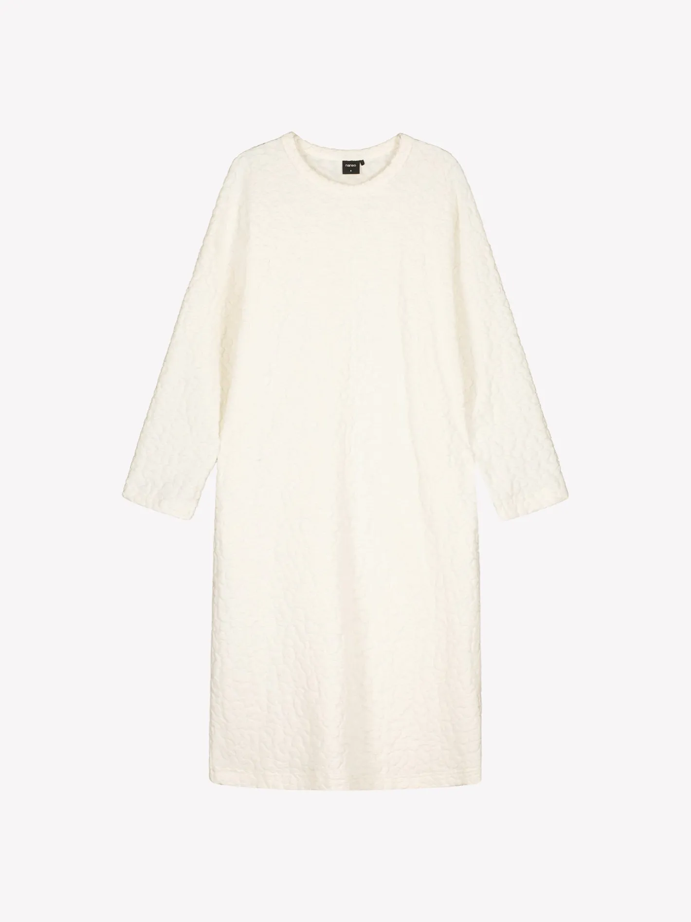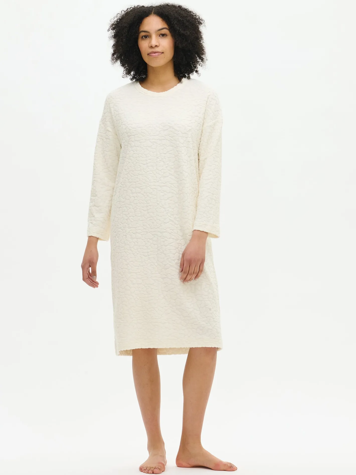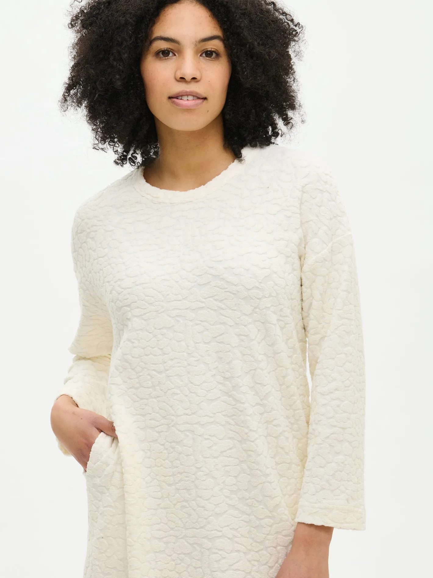 Naisten rento valkoinen Gepardi-oloasu pitkillä hihoilla ja pyöreällä pääntiellä. Mekon pituus koossa M on noin 110 cm. Pintakuvioitu materiaali on miellyttävää puuvilla-polyesteri jaquard-neulosta, jossa on hieman elastaania tuomassa joustoa. Pintastruktuuri tuo ylellistä tuntumaa ja tekee mekosta kauniin yksityiskohtaisen.