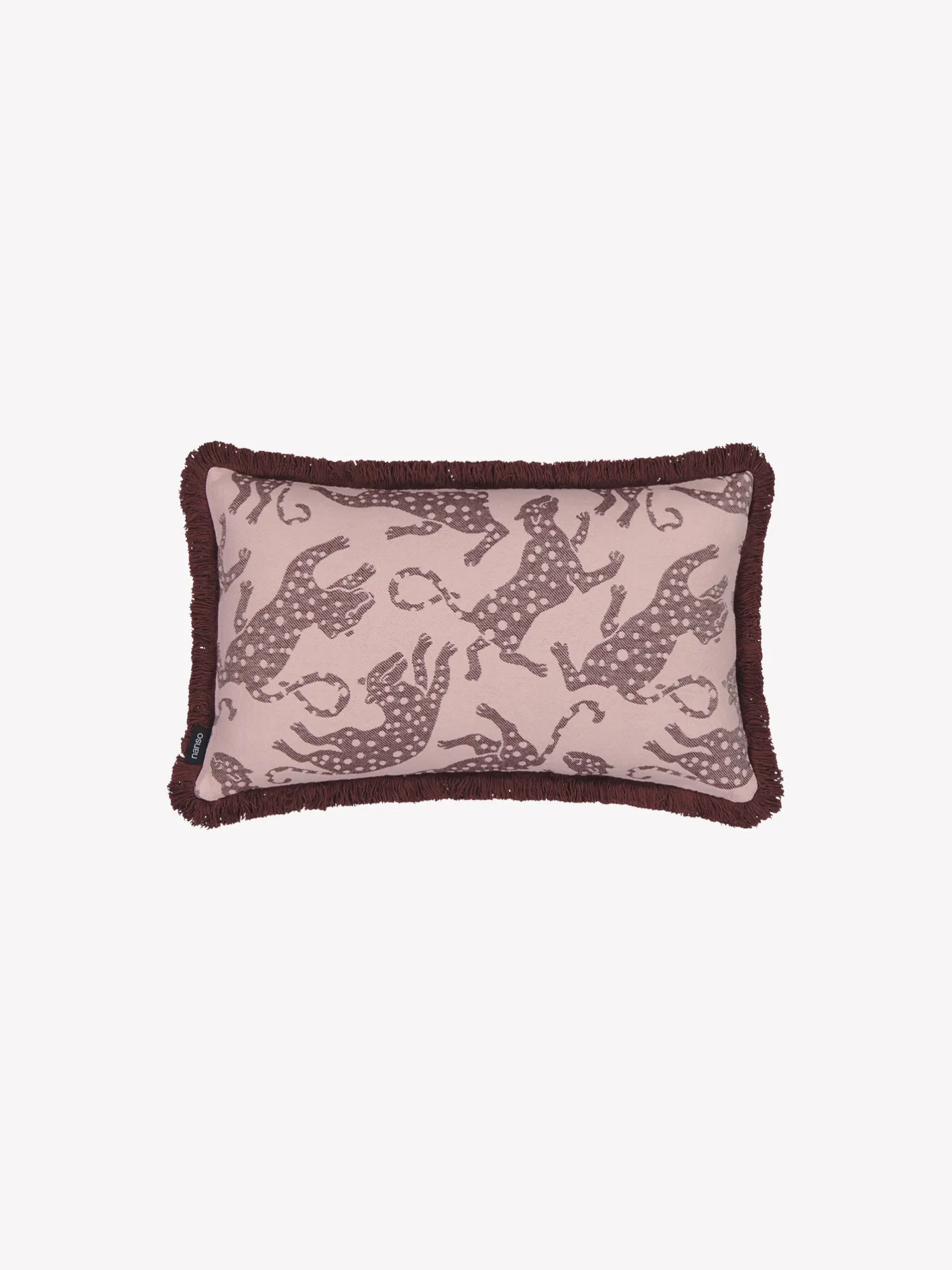 Leopardikuvioinen Hapsu-tyynyliina vaaleanpunaisessa sävyssä on rohkea valinta, joka tuo sisustukseen näyttävää ilmettä. Kestävä puuvillamateriaali ja jacquard-kudonta takaavat laadun, kun taas reunoissa olevat punaiset hapsut viimeistelevät kokonaisuuden. Vetoketju alareunassa tekee tyynyn vaihtamisesta vaivatonta. Kompakti 50 x 30 cm koko sopii täydellisesti tuomaan särmää sisustukseen.