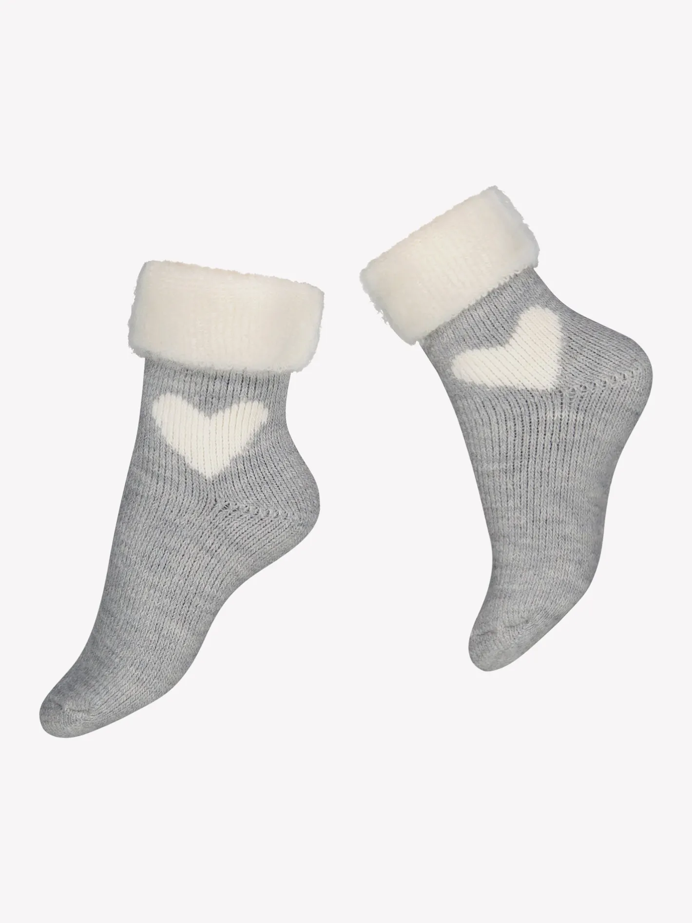 Valmistaudu kylmiin talvi-iltoihin pehmeillä alpakkasekoitenilkkasukilla, joissa on kaunis sydänkuvio. Sukkien villasekoitteessa on alpakkaa ja sisäosa on harjattu pehmopörröiseksi. Nämä sukat ovat ihanteelliset rentoon kotona oleskeluun.