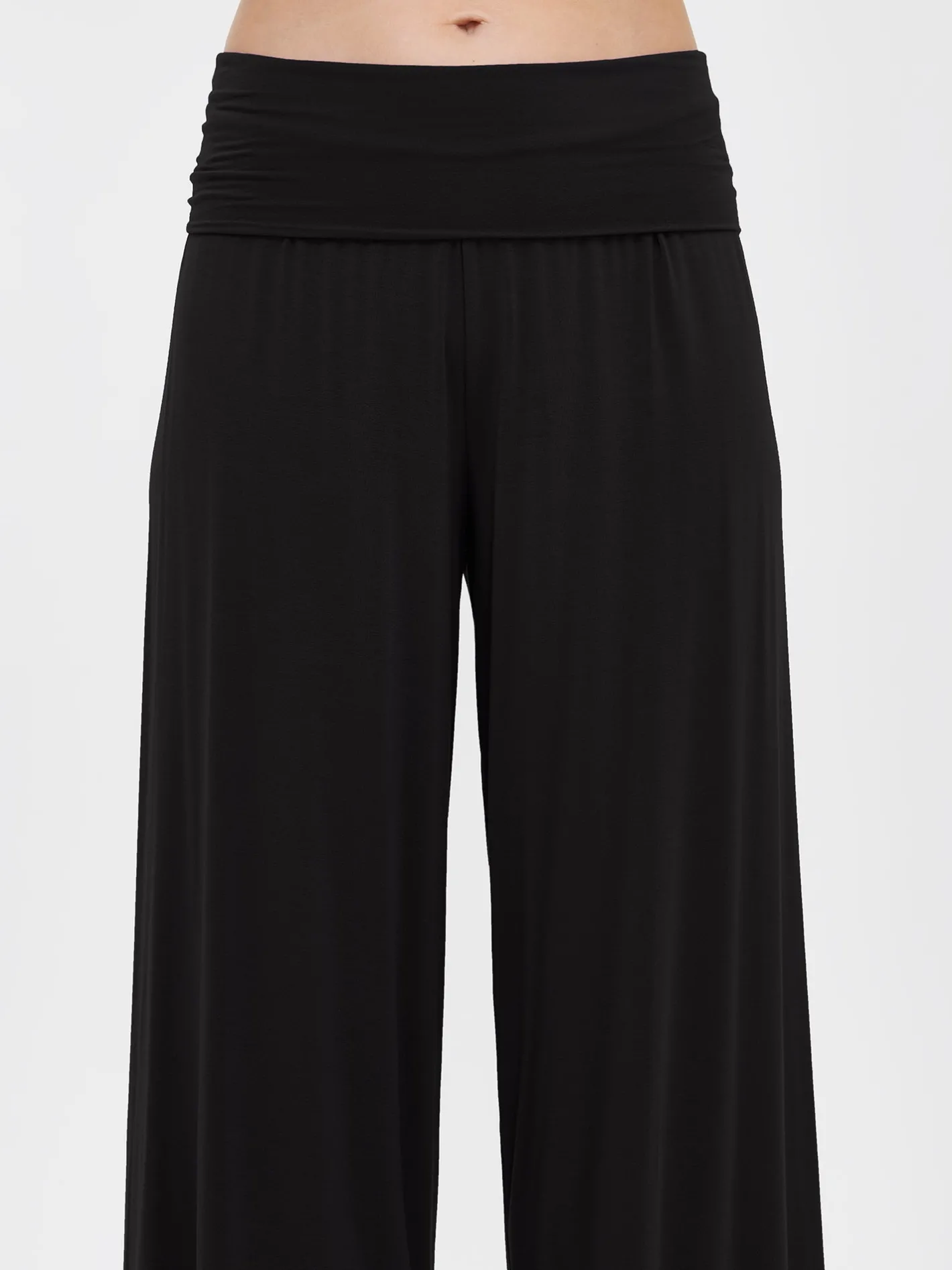 Naisten ylellisen pehmeät mustat Hento-housut. Housuissa on mukava vyötärörakenne leveällä ja tukevalla tuplakaistaleella. Rennot housut ovat tyylikkäästi 7/8-pituiset. Materiaali on laadukasta, silkkisen pehmeää modaali-elastaania, joka tarjoaa ihanan pehmeän ja joustavan tuntuman.