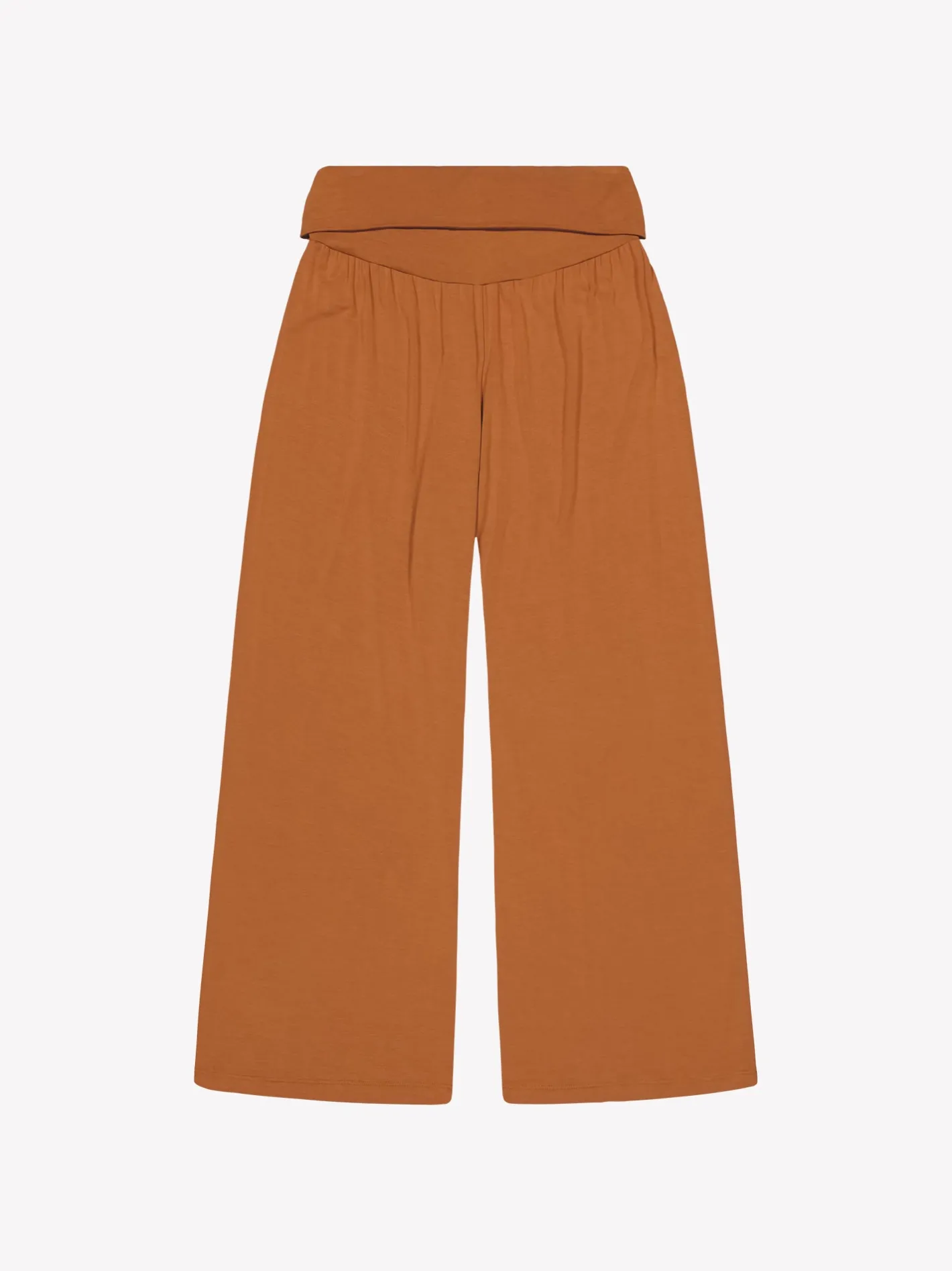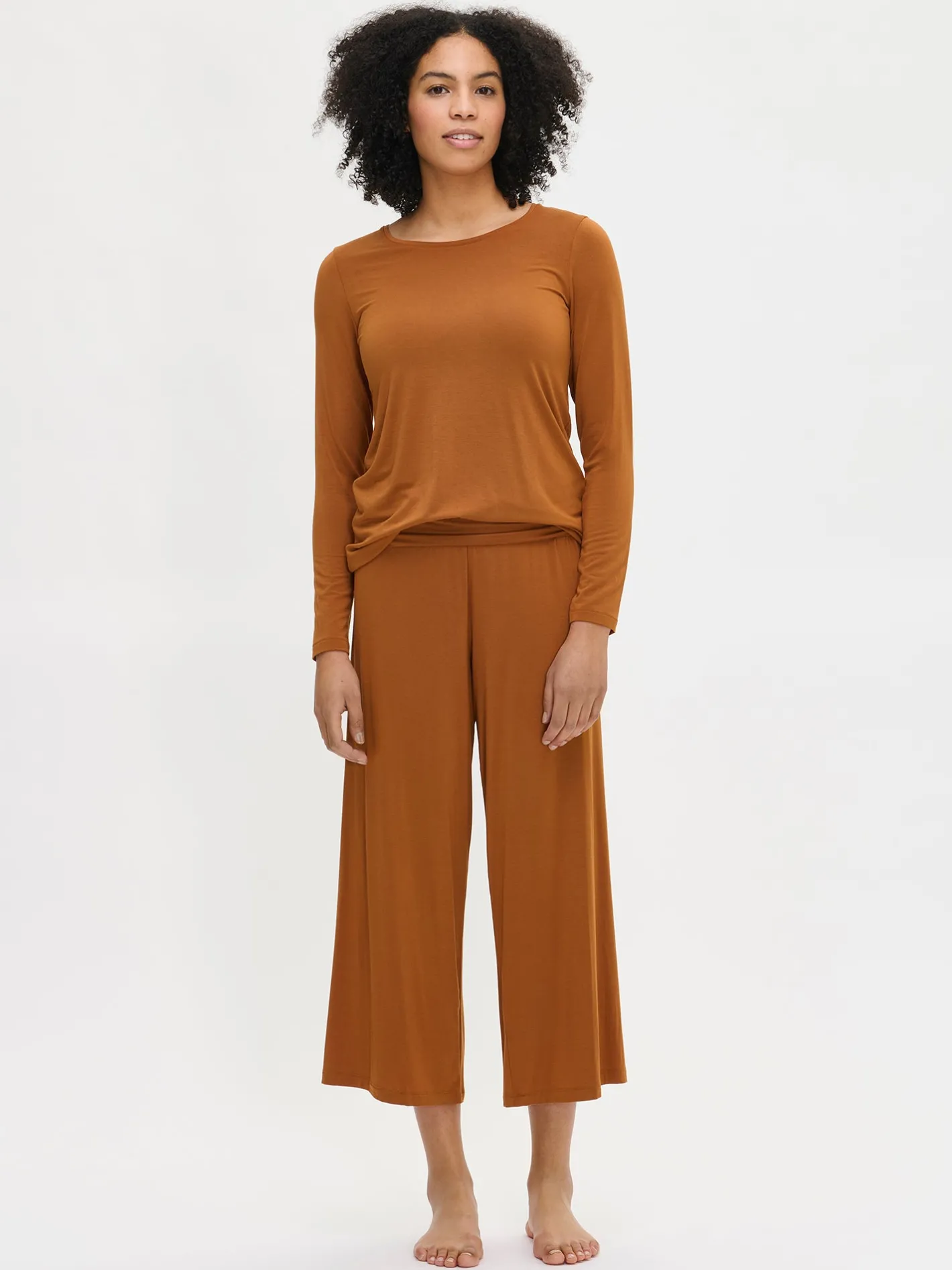 Naisten ylellisen pehmeät yksiväriset Hento-housut ruskeassa sävyssä. Housuissa on mukava vyötärörakenne leveällä ja tukevalla tuplakaistaleella. Rennot housut ovat tyylikkäästi 7/8 pituiset. Materiaali on laadukasta, iholla miellyttävän pehmeältä tuntuvaa modaali-elastaania.