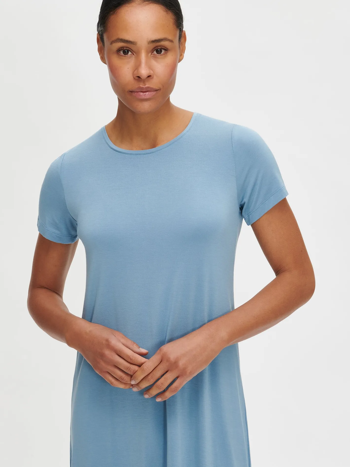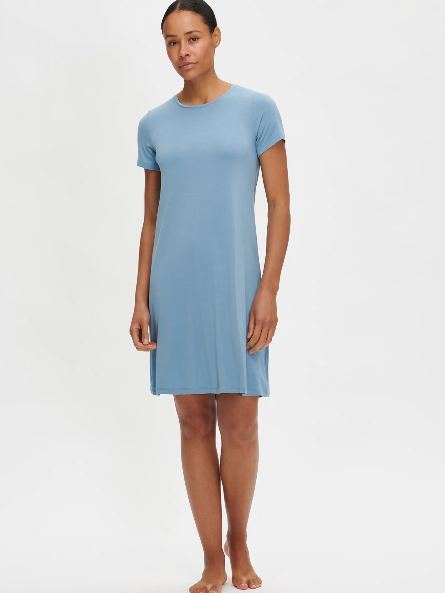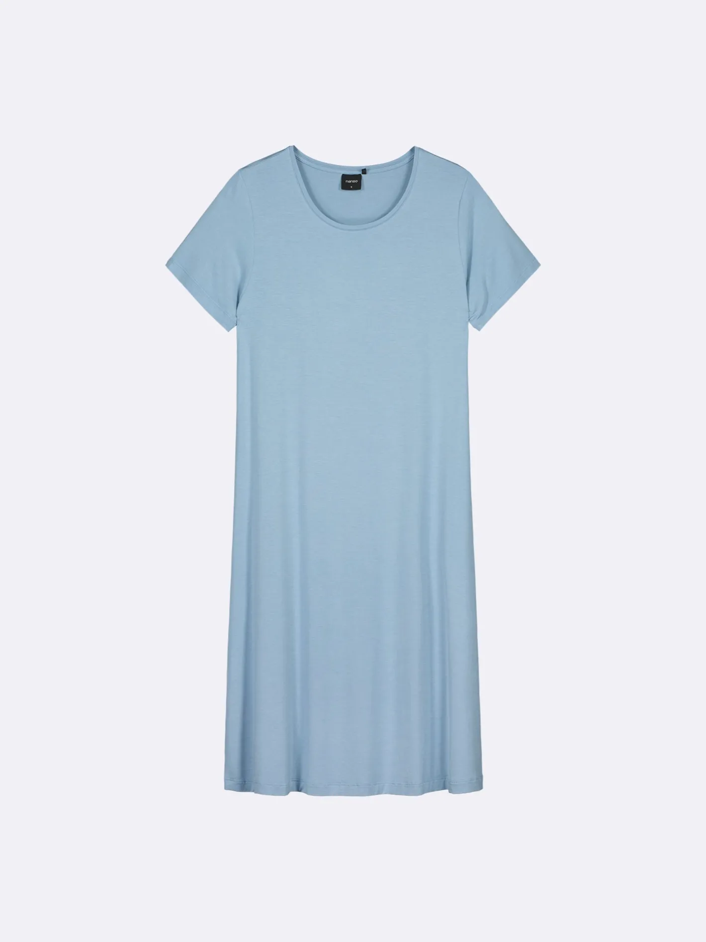 Naisten yksivärinen sininen Hento-yöpaita lyhyillä hihoilla ja pyöreällä pääntiellä. Mekon pituus koossa M on noin 95 cm. Materiaali on laadukasta, iholla miellyttävän pehmeältä tuntuvaa modaali-elastaania.