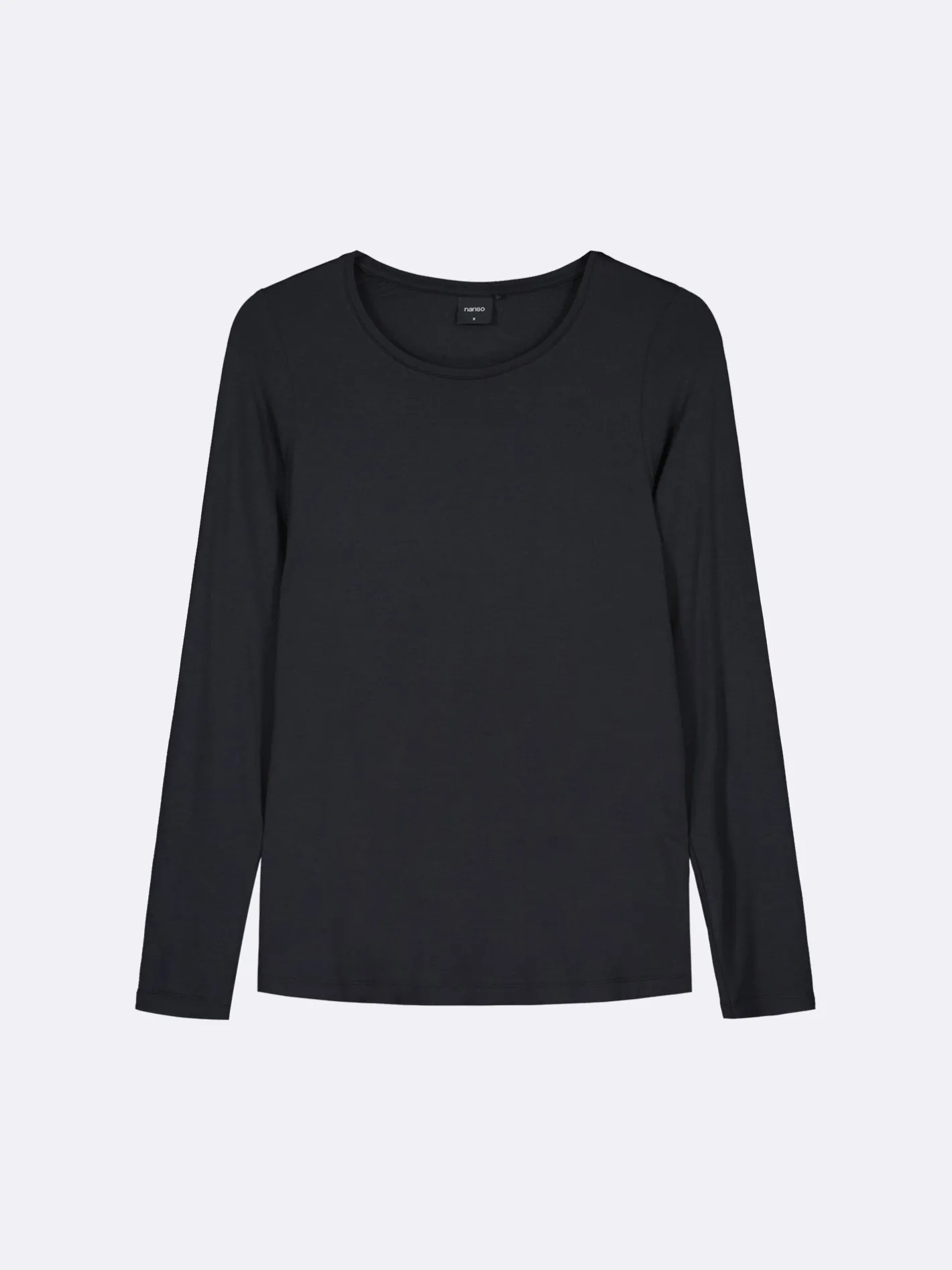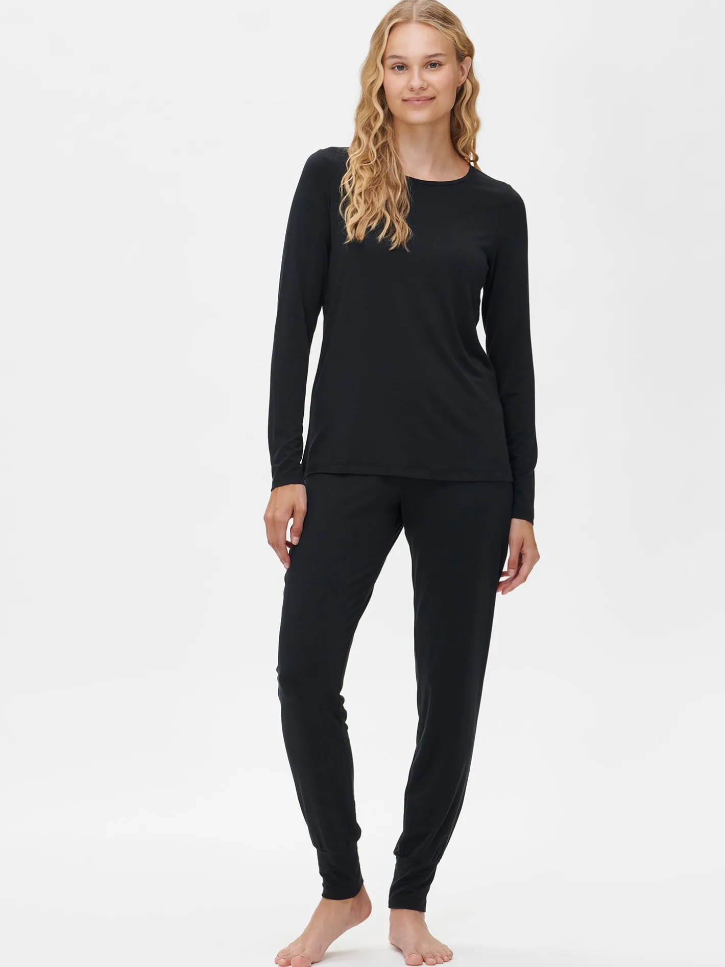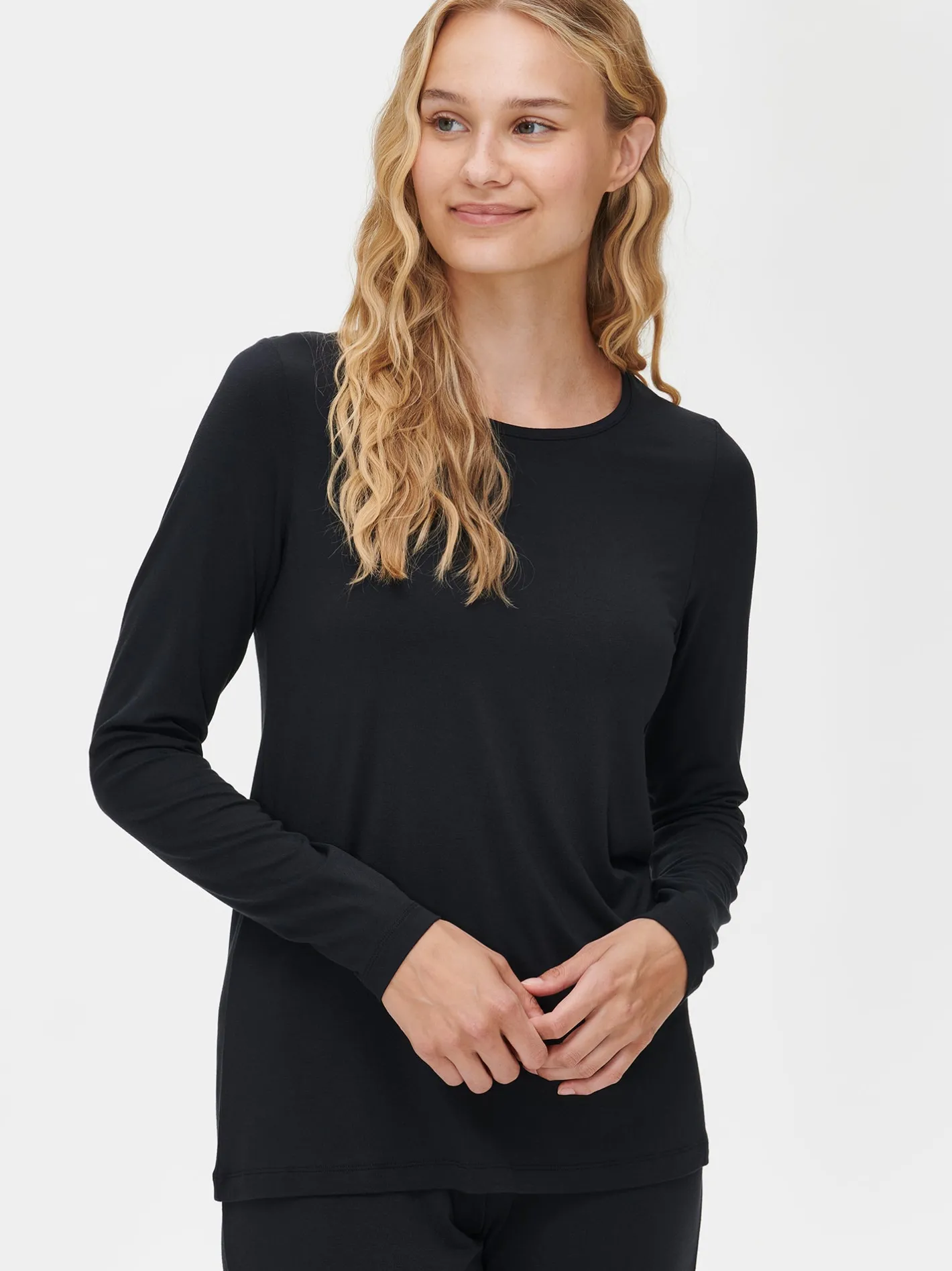 Naisten ylellisen pehmeä musta Hento-pusero pitkillä hihoilla ja pyöreällä pääntiellä. Puseron pituus koossa M on noin 67 cm. Materiaali on laadukasta, ihanan pehmeää modaali-elastaania, joka tuntuu miellyttävältä iholla. Tämä tyylikäs ja ajaton pusero on ihana valinta rentoihin hetkiin kotona.