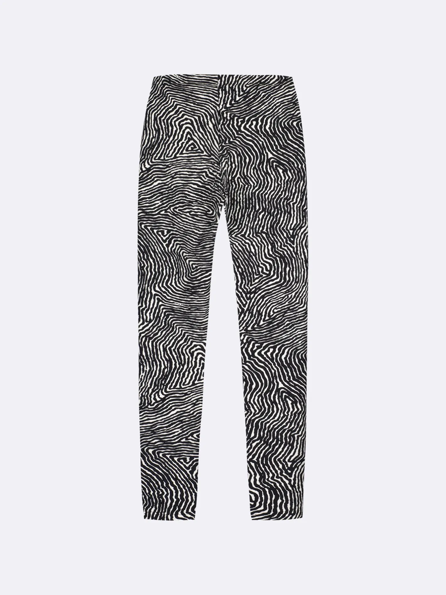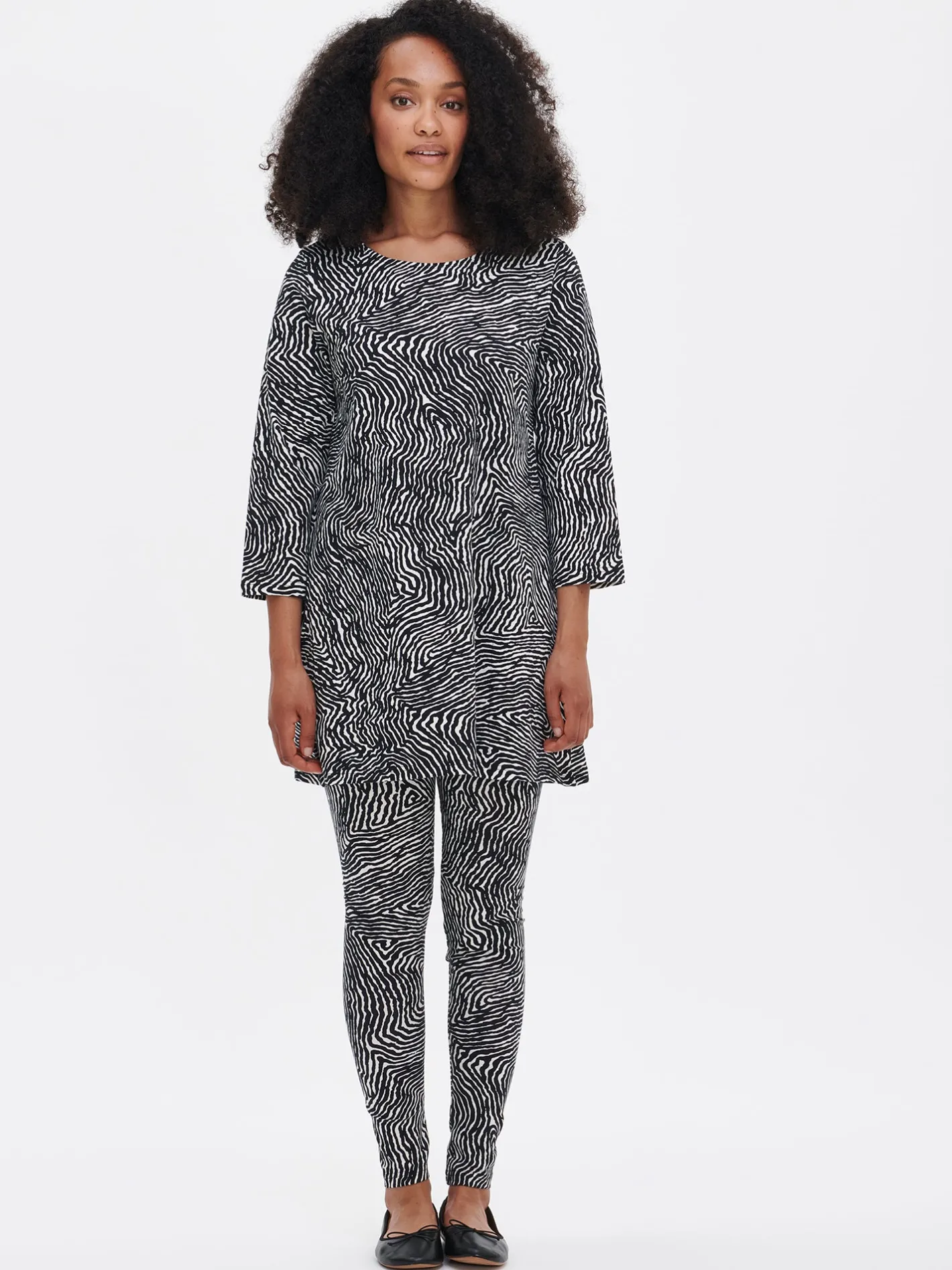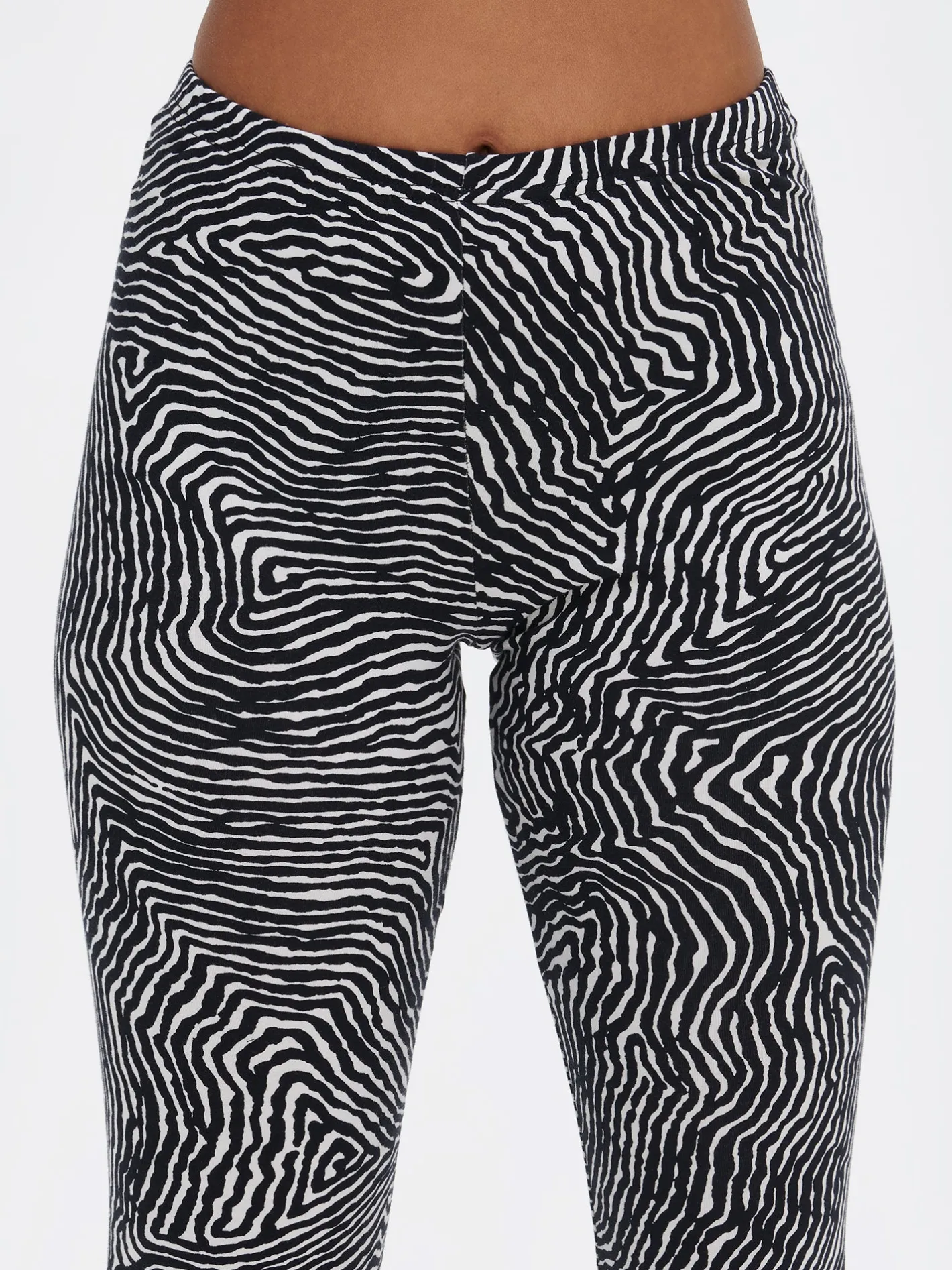 Naisten mukavat mustavalkoiset Jälki-leggingsit. Yhdistä kuosilliset leggingsit samanväriseen Jälki-t-paitaan tai Jälki-tunikaan. Mukavien joustavien leggingsien vyötäröllä on saumattu kuminauha ja lahkeet ovat täyspitkät. Materiaali on miellyttävää ja joustavaa puuvilla-elastaani neulosta.