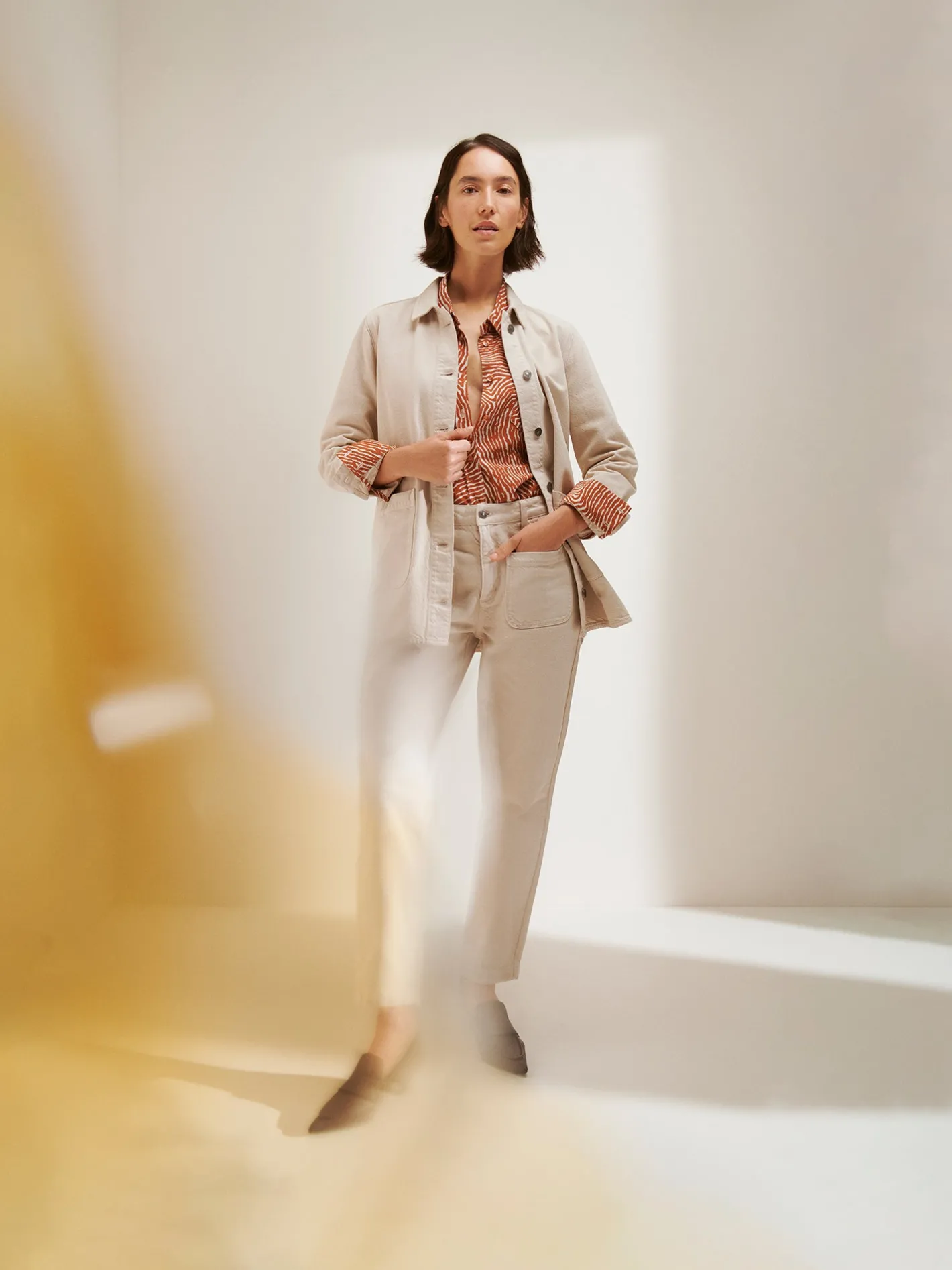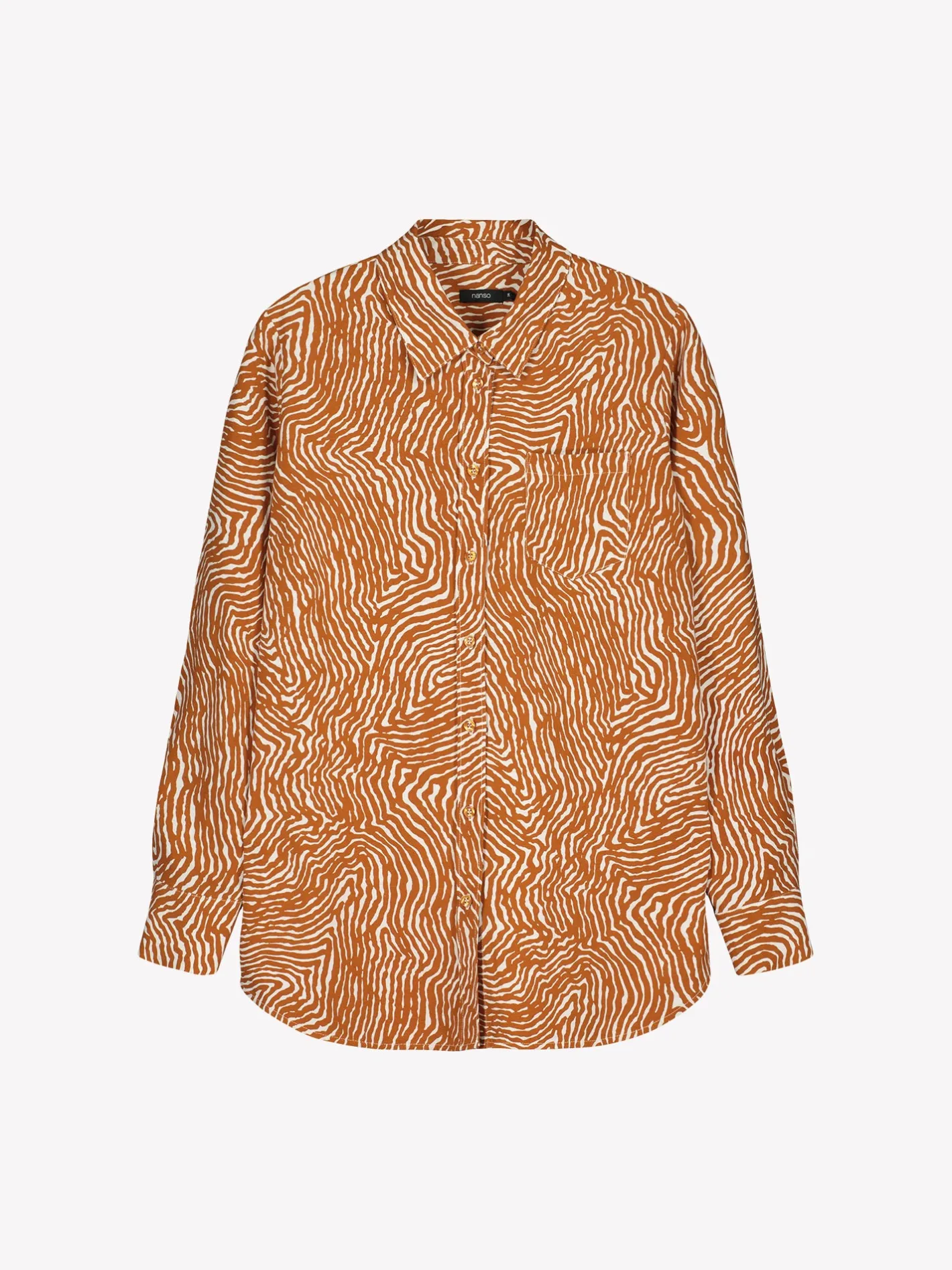 Naisten väljä pitkähihainen ruskea Jälki-paitapusero. Kauniissa kuosillisessa puserossa on klassinen kaulusmalli, napitus edessä, pyöristetty helma ja rintatasku edessä. Puserossa on täyspitkät hihat ja hihansuissa laskokset nappikalvosimien yläpuolella. Puseron pituus koossa 38 on noin 80 cm. Tuote on valmistettu kevyestä viskoosi-pellavasekoitteesta. Materiaalille on ominaista 3-5 % kutistuminen ensimmäisessä pesussa.