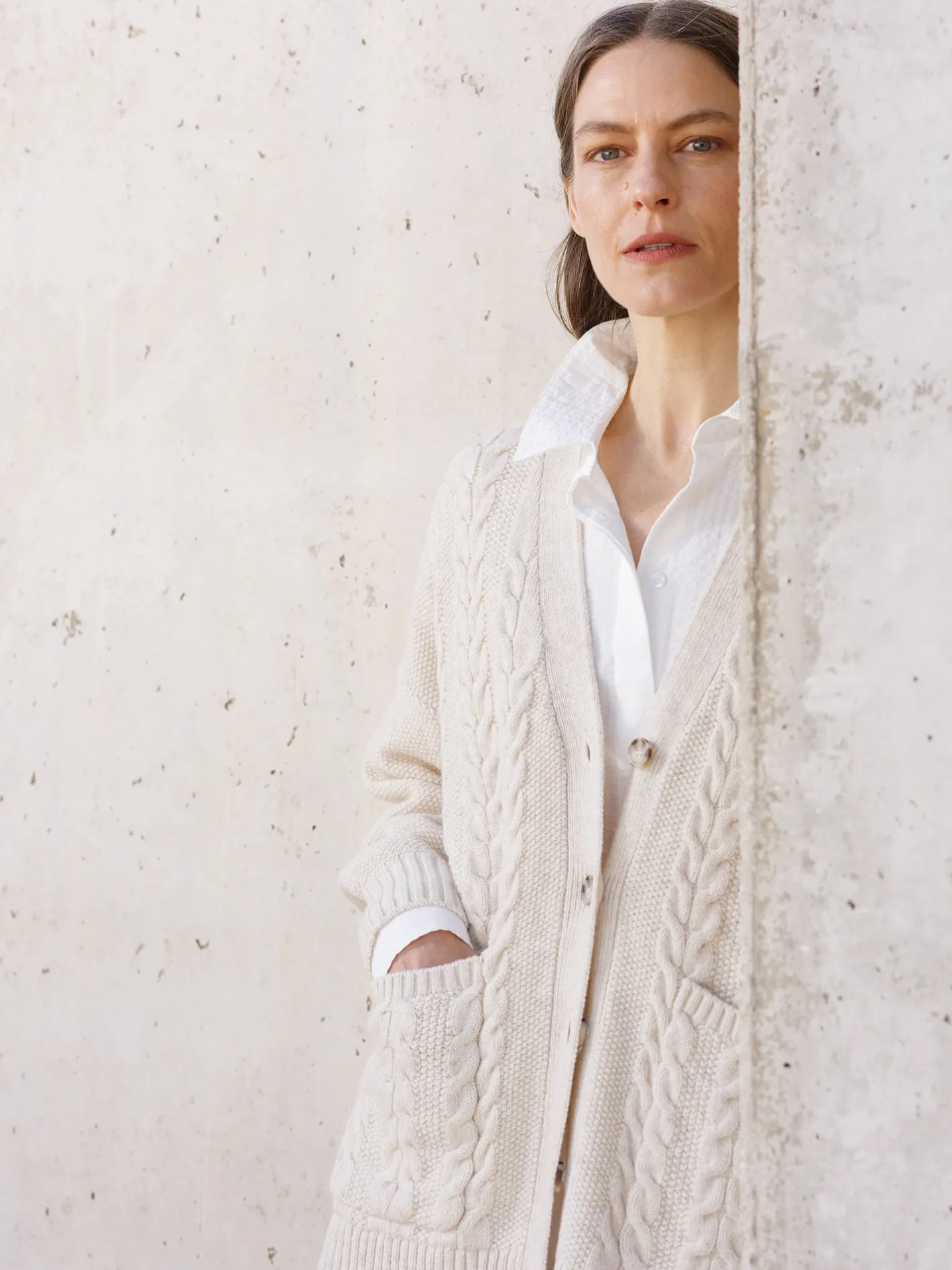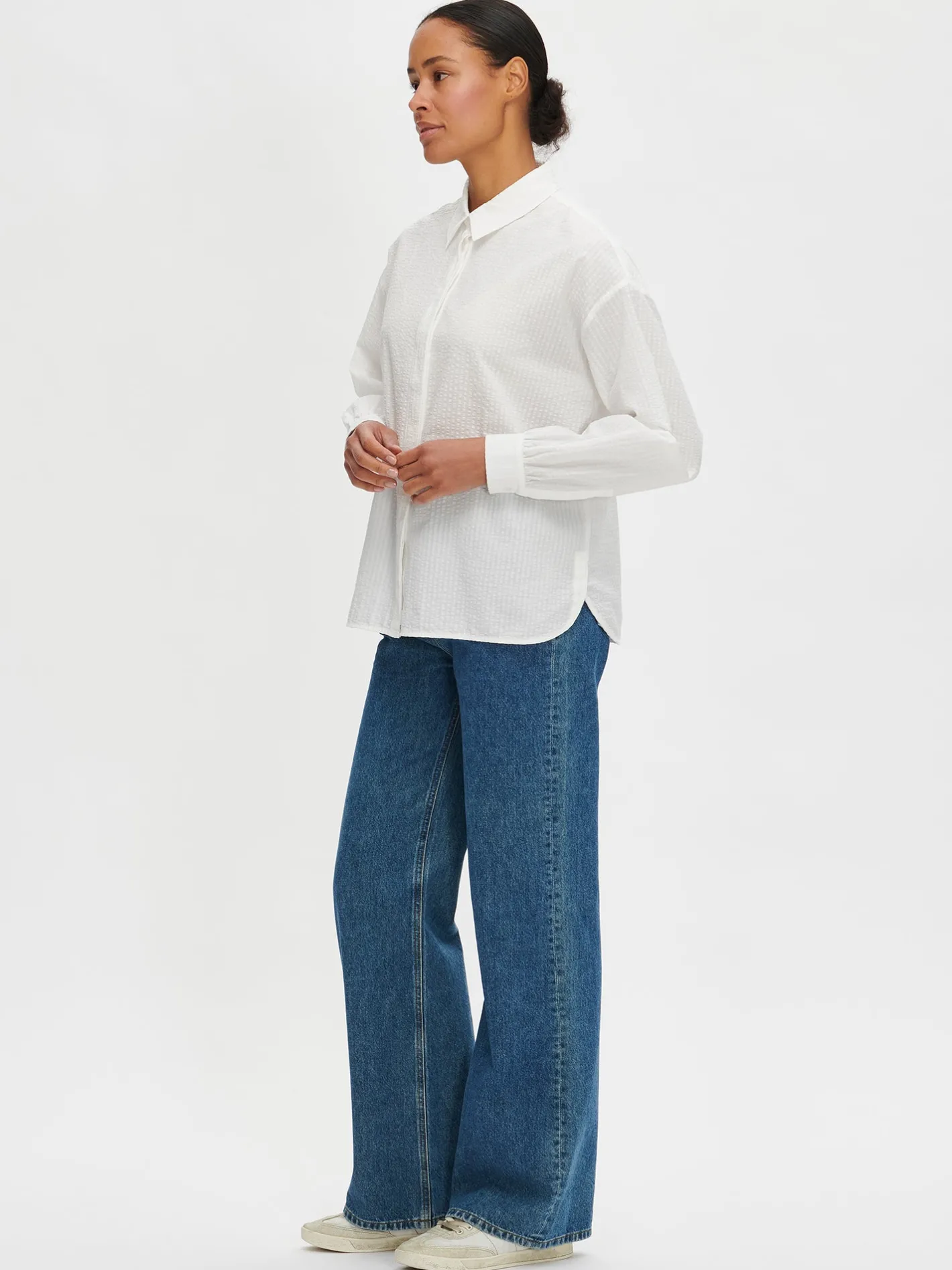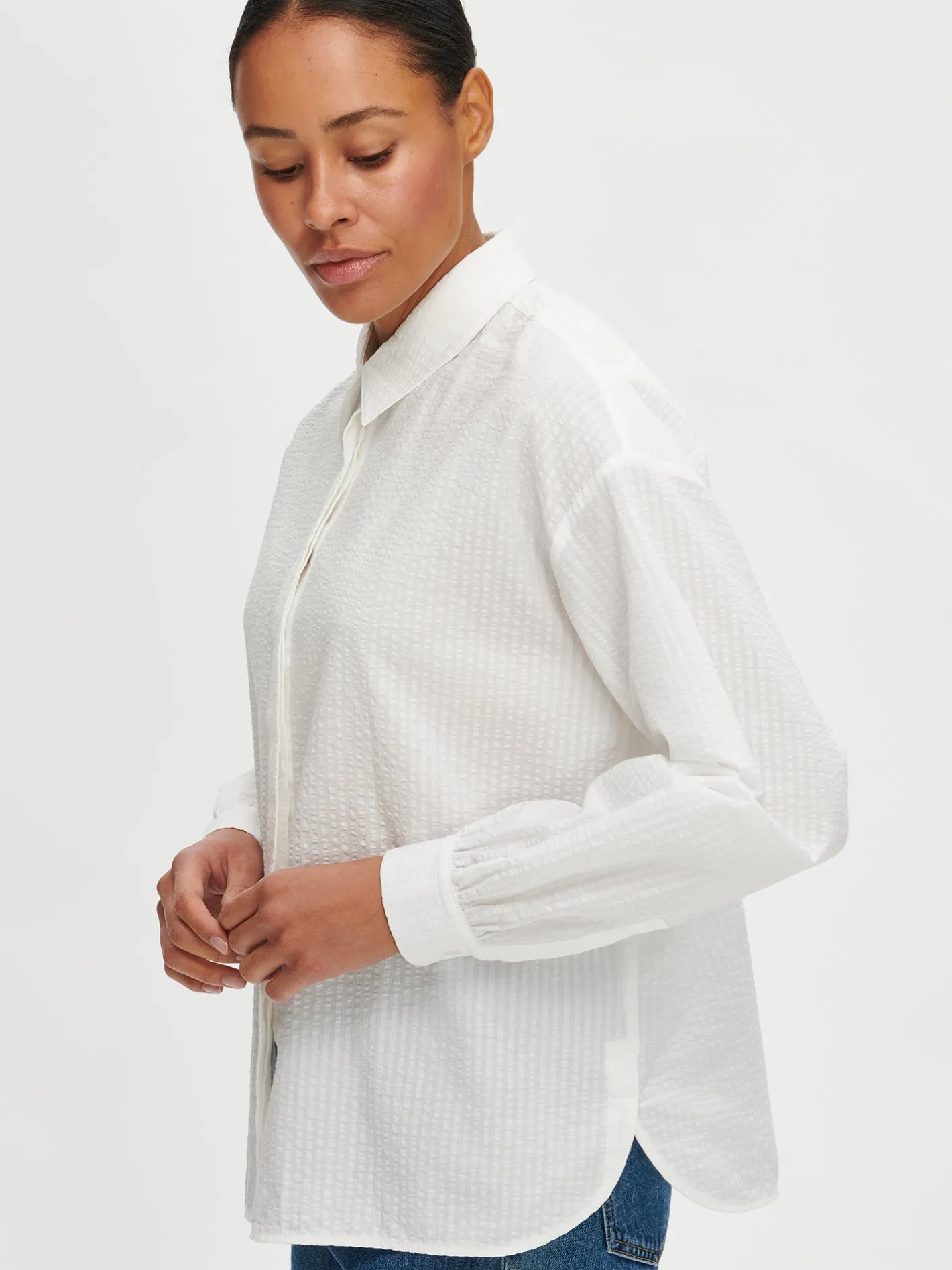 Naisten valkoinen Justiinsa kauluspaita. Väljässä paitapuserossa on kaulus, edessä piilonapitus ja pyöristetty helma sivuhalkioilla. Paitapuserossa on pudotettu olka ja täyspitkät hihat poimuttuvat hihansuussa nappikalvosimien yläpuolelle. Puseron pituus koossa 38 on noin 67 cm. Tuote on valmistettu kudotusta seersucker puuvillakankaasta, jossa on kaunis pintastruktuuri. Materiaalissa käytetty puuvilla on sertifioitua. Materiaalille on ominaista 3-5% kutistuminen ensimmäisessä pesussa.