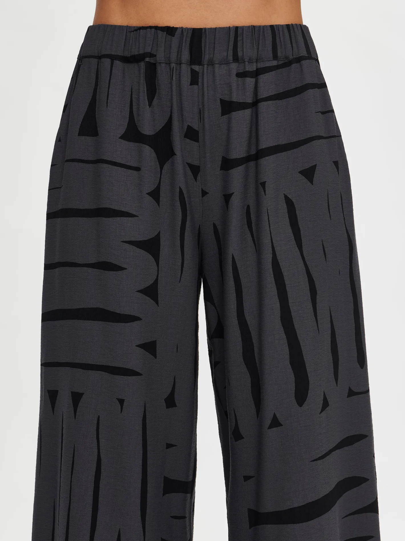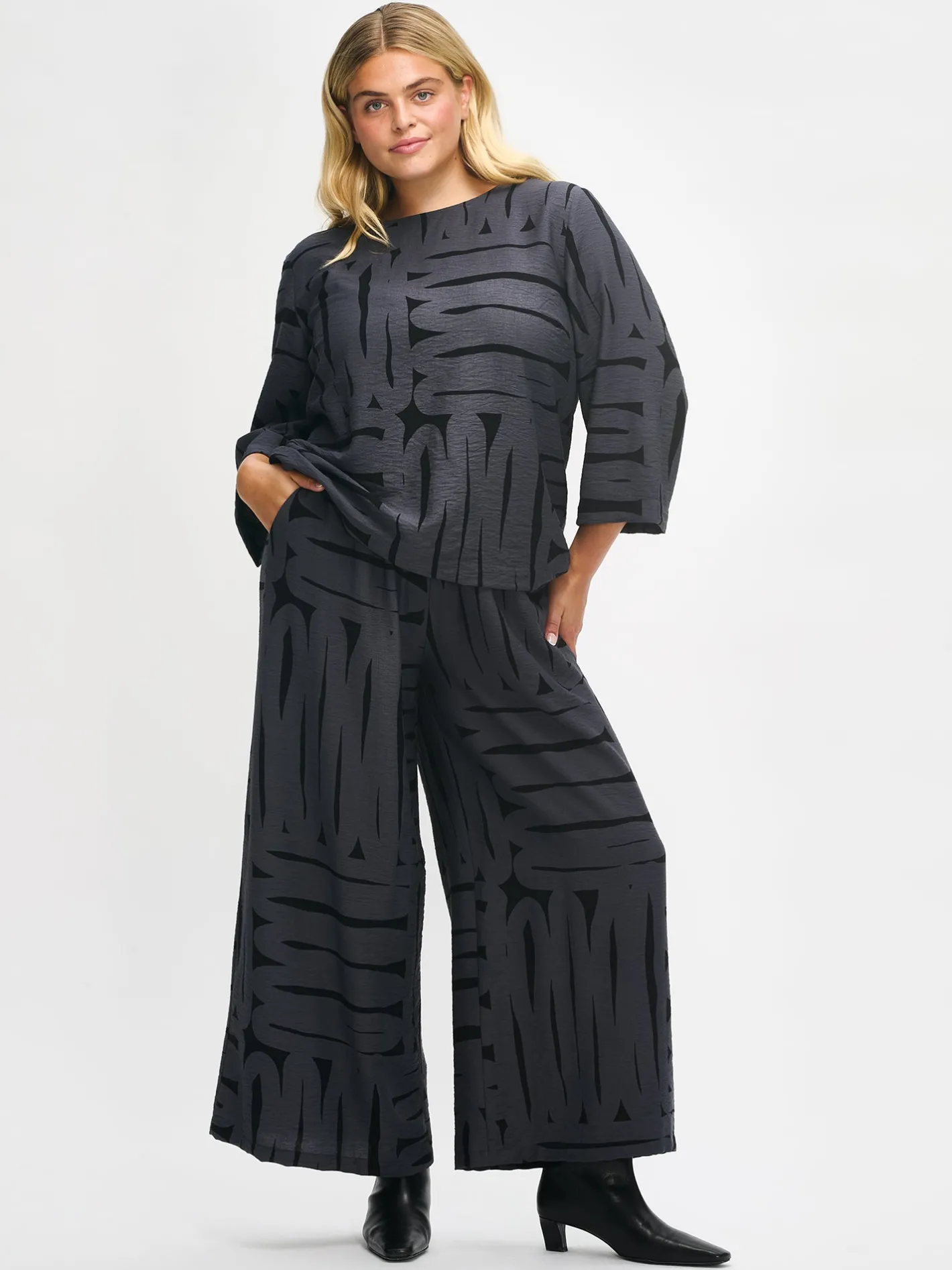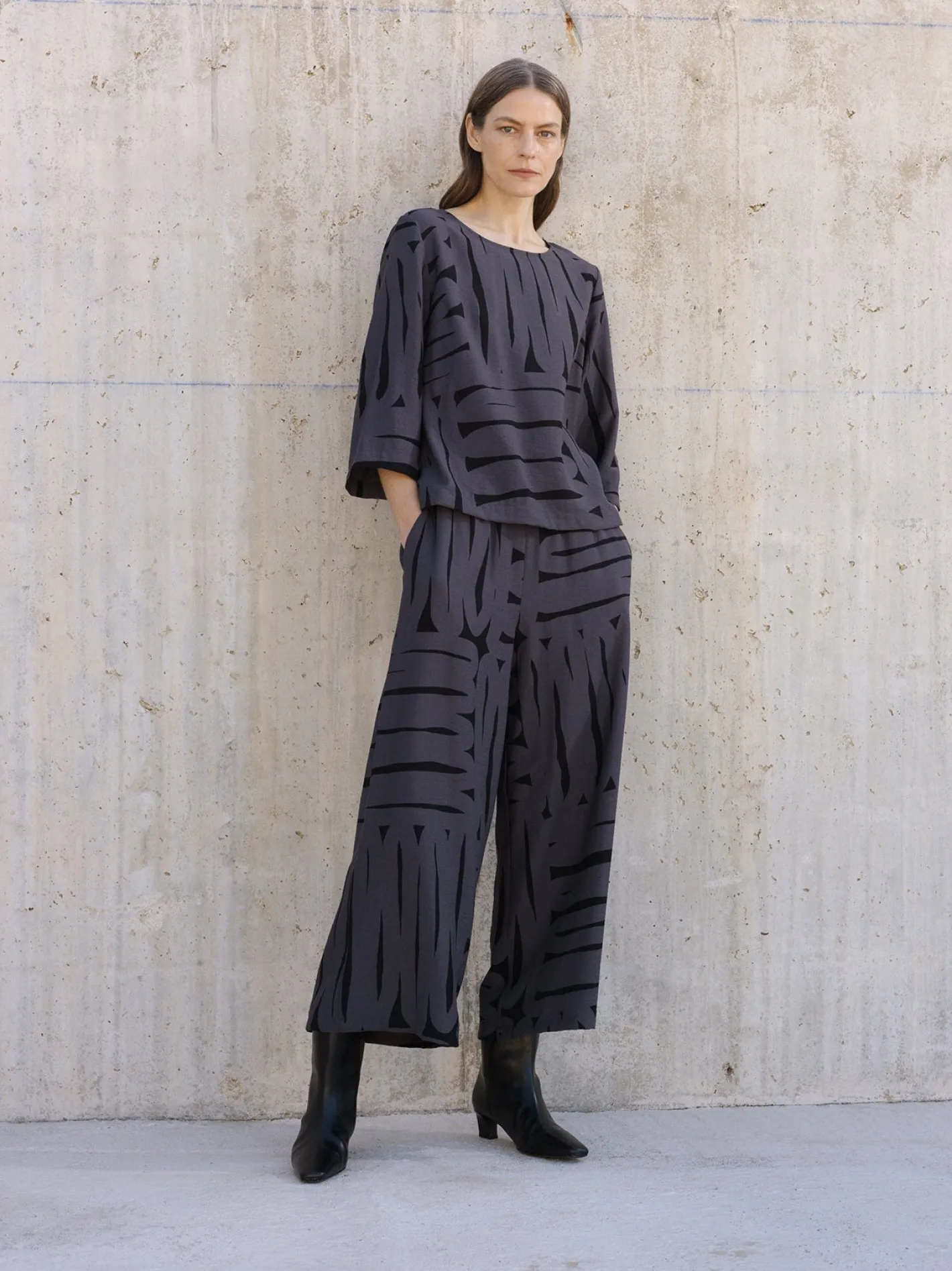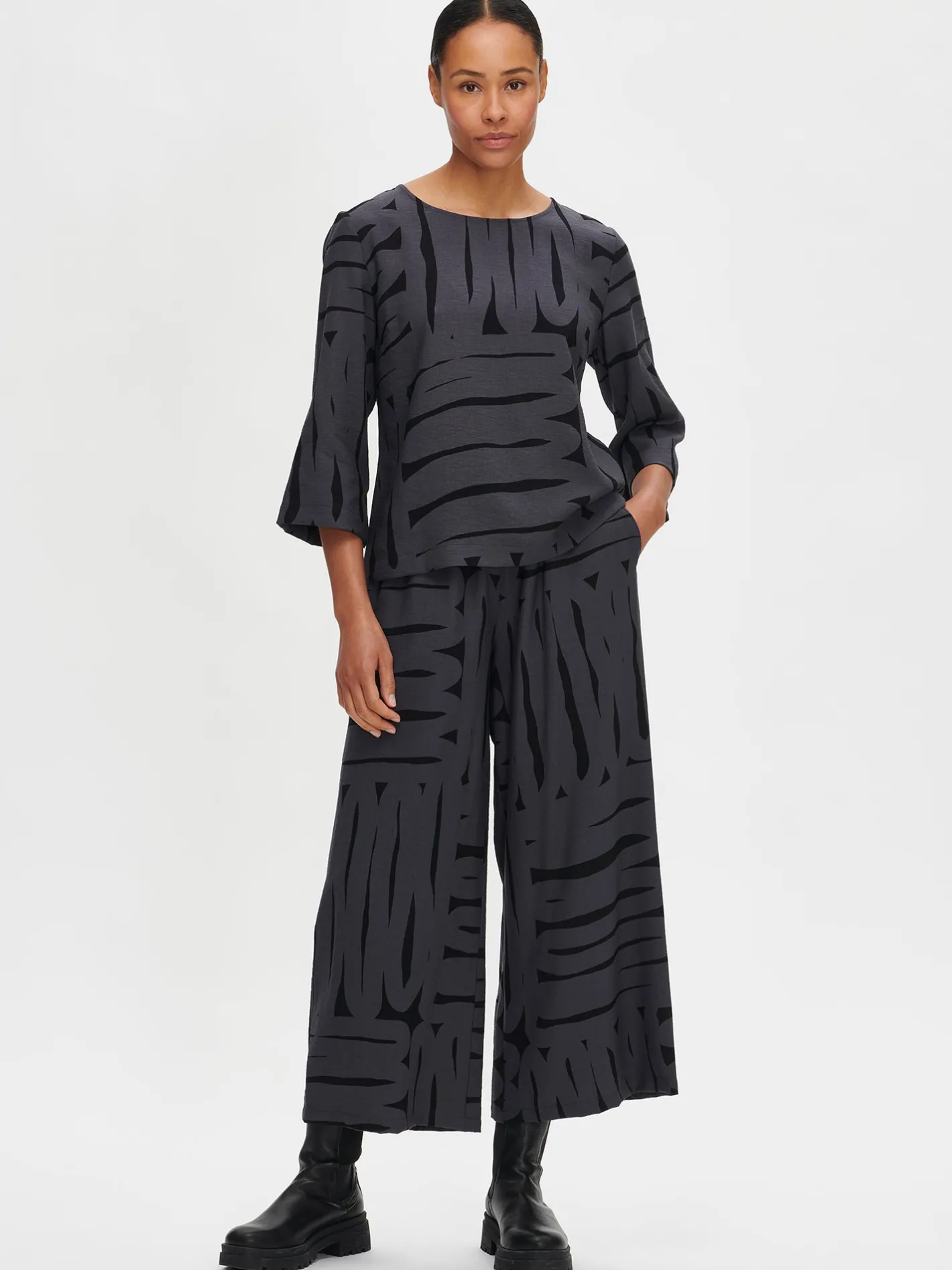 Naisten kuosilliset harmaat Kaiku-housut. Housut sopivat täydellisesti yhteen samanvärisen Kaiku-puseron kanssa. Housuissa on leveät lahkeet, sivuissa taskut ja joustava vyötärö. Housut ovat 7/8 pituiset ja lahkeen sisäpituus koossa 38 on noin 67 cm. Materiaali on laadukasta ja miellyttävän tuntuista, kevyttä twill-sidoksista viskoosi-polyamidikangasta.