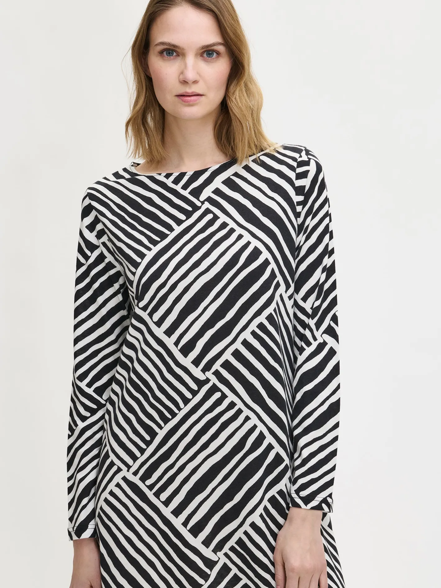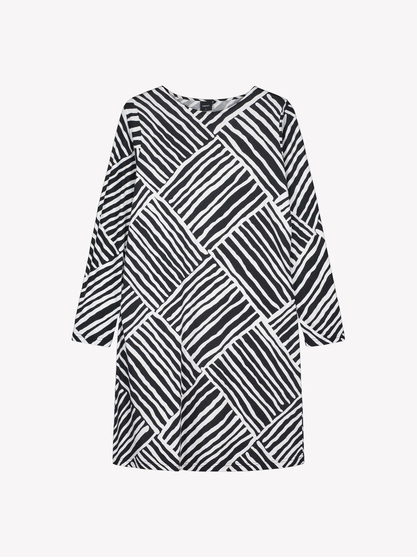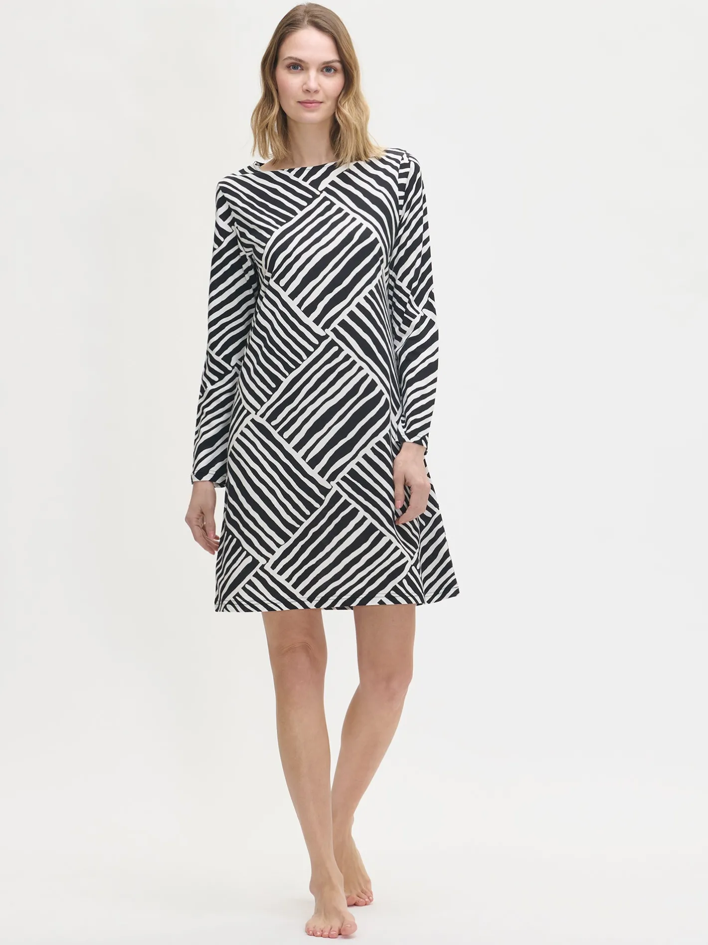Naisten kuosillinen Kaisli-yöpaita pitkillä hihoilla ja ovaalilla pääntiellä mustavalkoisessa värissä. Yöpaidan pituus koossa M on noin 95 cm. Materiaali on laadukasta, iholla miellyttävän pehmeältä tuntuvaa ja helppohoitoista puuvilla-modaalia, joka pysyy hyvänä pesusta toiseen.