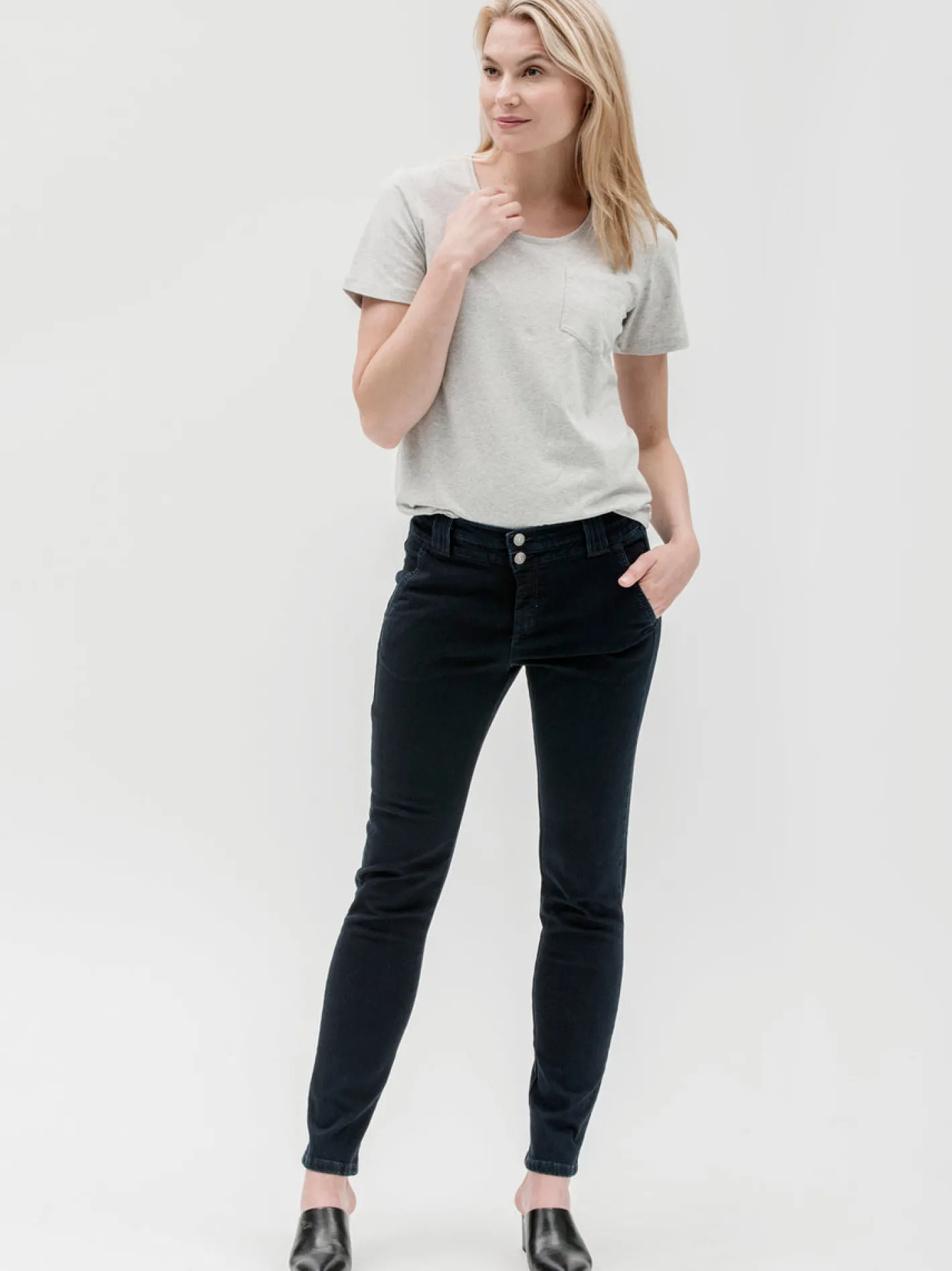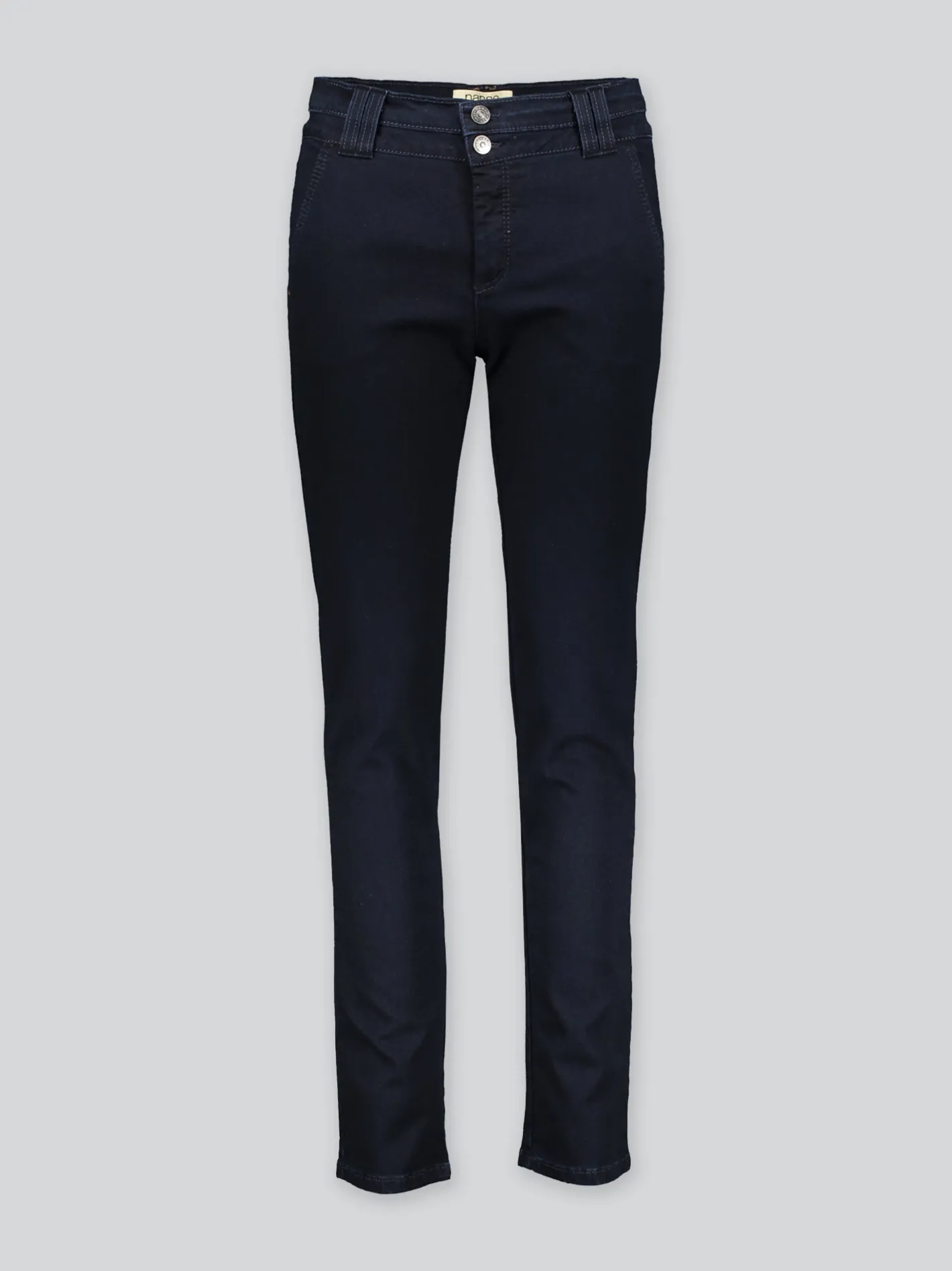 Naisten mukavat tummansiniset Kantti-farkut. Suoralinjaisissa housuissa on leveämpi tupla vyötärökaitale sekä vyölenkit. Edessä on taskut sekä takana valetaskulistat ilmettä antamassa. Tikkaukset sävysävyyn. Materiaali on mattapintaista, joustavaa ja miellyttävän tuntuista puuvilla-sekoitetta. Lahkeen sisäpituus koossa 38 on noin 81 cm.