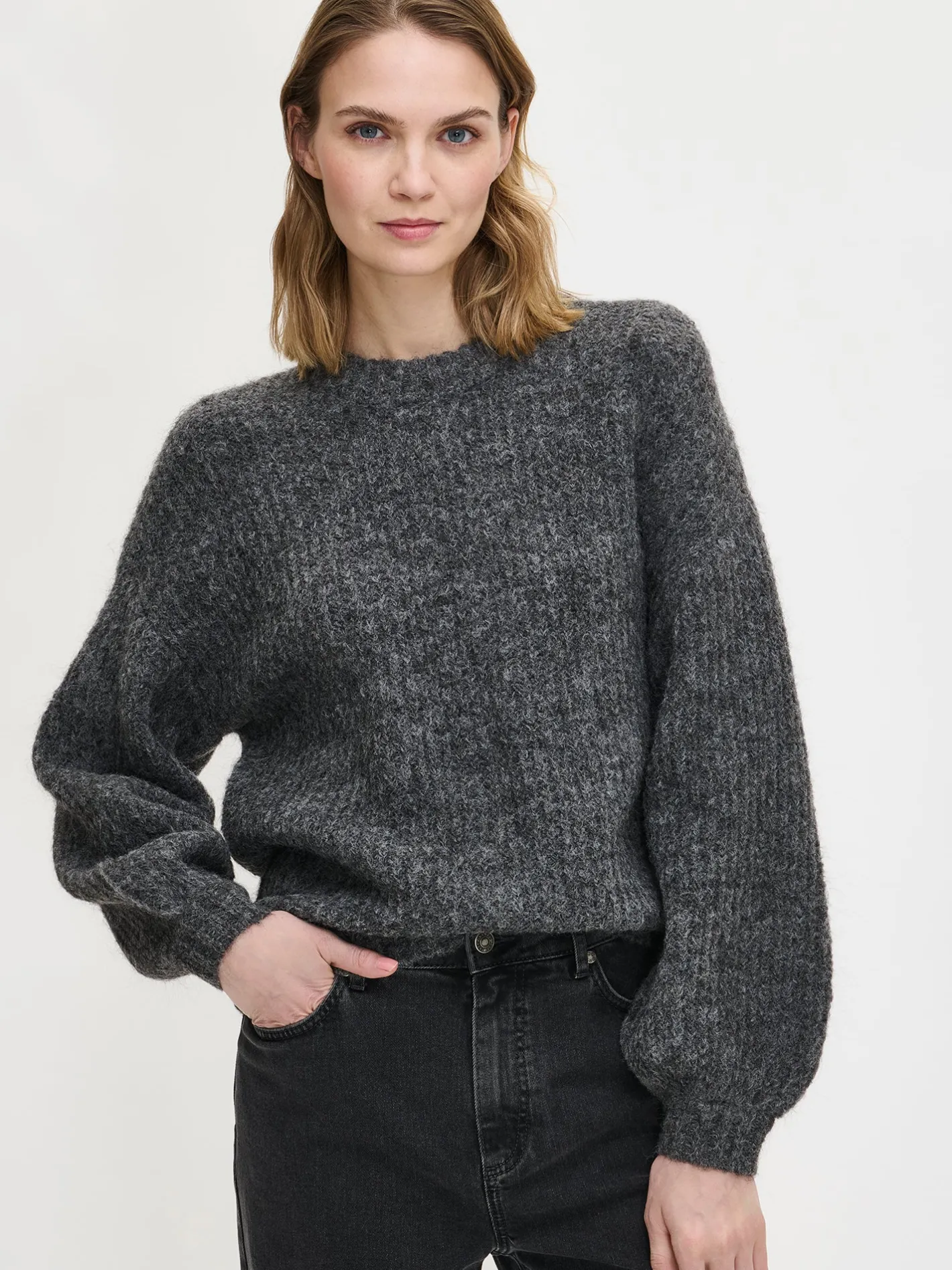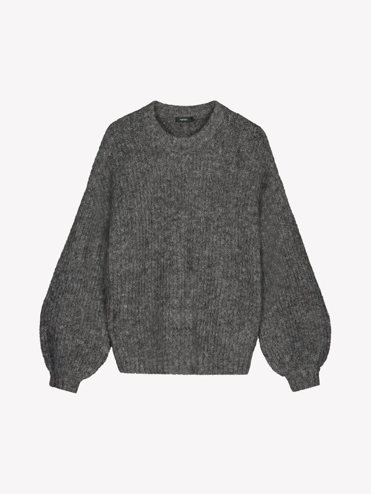 Naisten ylellinen harmaa Karamelli-neulepusero pyöreällä pääntiellä. Lämmin ja muhkea neulepusero on syksyn ehdoton suosikkivaate, sillä pehmeään neulepuseroon on aina ihanaa pukeutua. Neulepaidan neulos on sekoite, jossa on osaksi sertifioitua mohairia, sertifioitua villaa, polyamidia ja hieman elastaania. Muotoonneulotussa neulepuserossa on pyöreä pääntie ja täyspitkät hihat. Neulepuseron pituus koossa M on noin 59 cm. Neuleen hoito-ohjeet löydät .