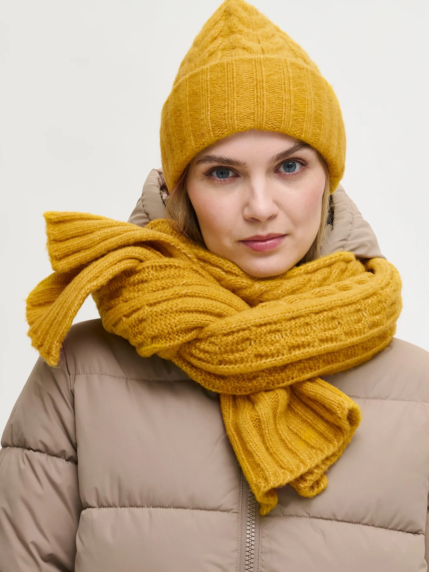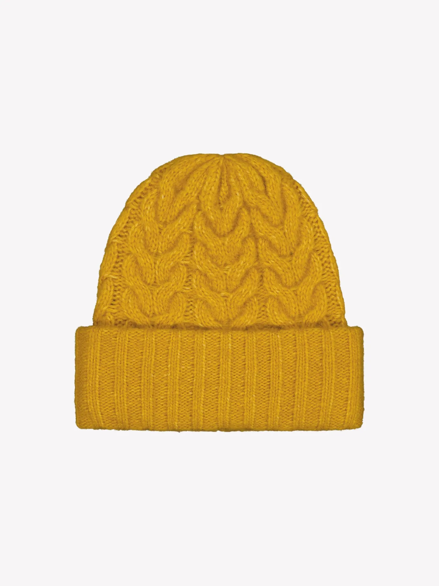 Naisten muhkea keltainen Kierre-neulepipo kauniilla palmikko kuviolla. Pipon reunassa on käännettävä, joustava ribbineulos. Neulos on laadukasta sertifioitua villa-polyamidisekoitetta. Neuleen hoito-ohjeet löydät