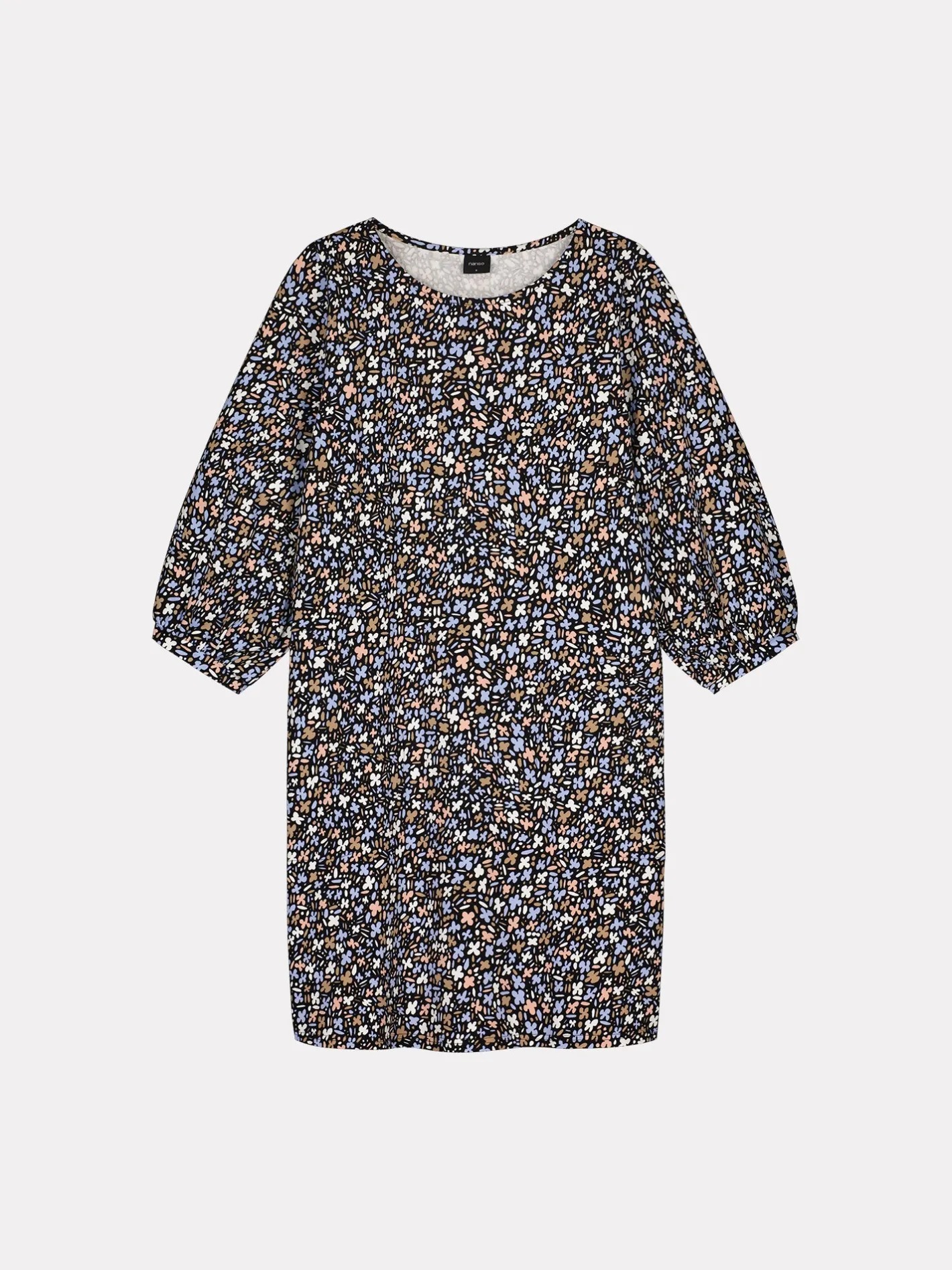 Naisten kuosillinen monivärinen Krassi-mekko. Mukavassa mekossa on venepääntie, taskut sivuissa ja suora helma. Mekossa on 3/4 pituiset hihat, jotka poimuttuvat hihansuusta. Mekon pituus koossa M on noin 95 cm. Materiaali on laadukasta ja helppohoitoista puuvilla-elastaani -neulosta, joka pysyy hyvänä pesusta toiseen.