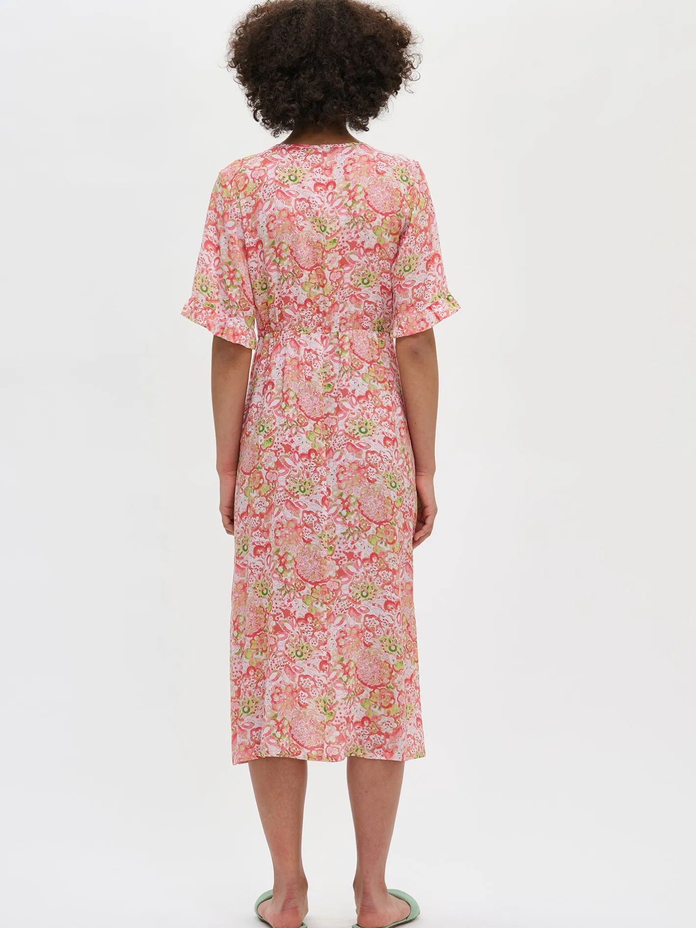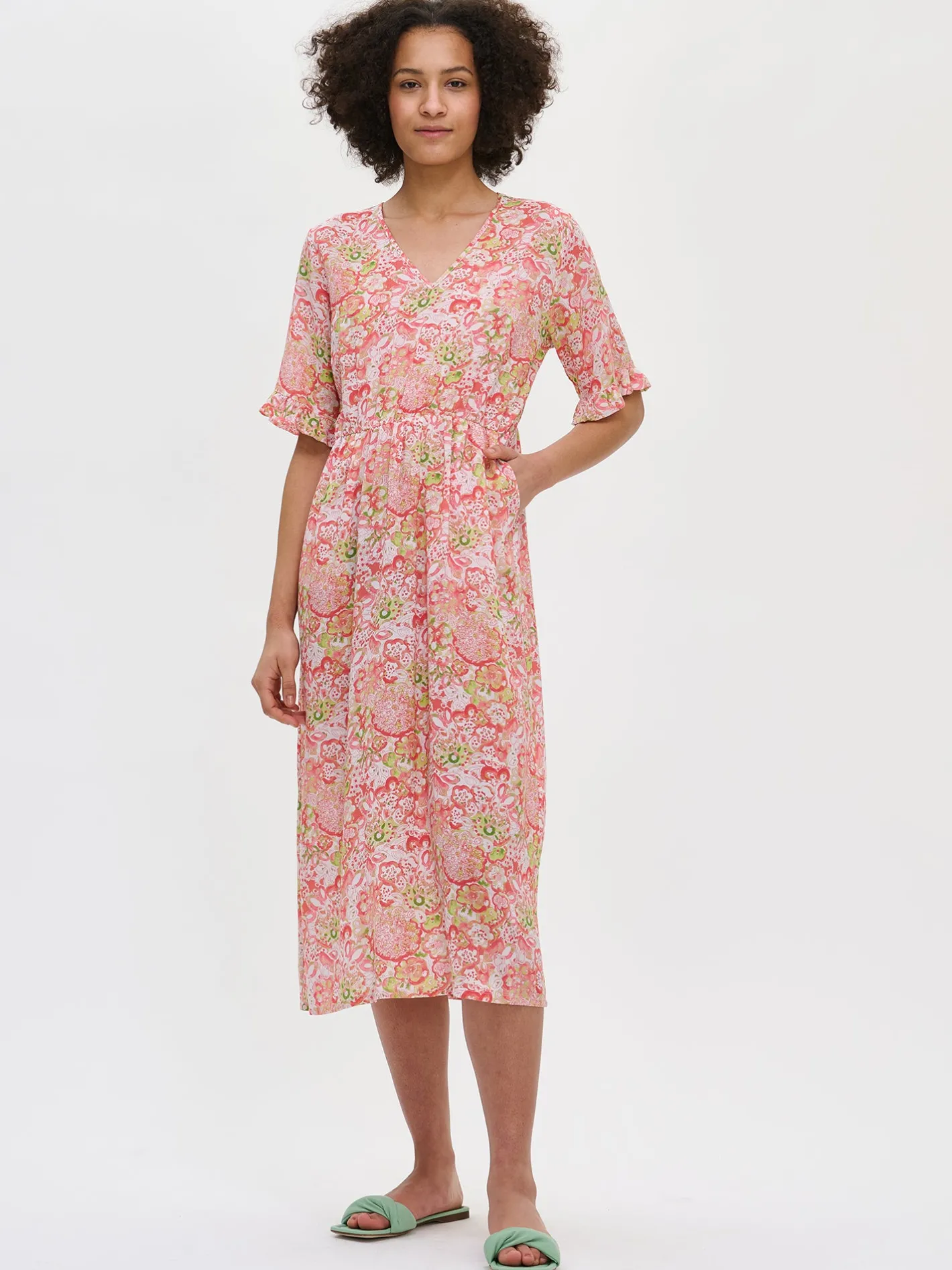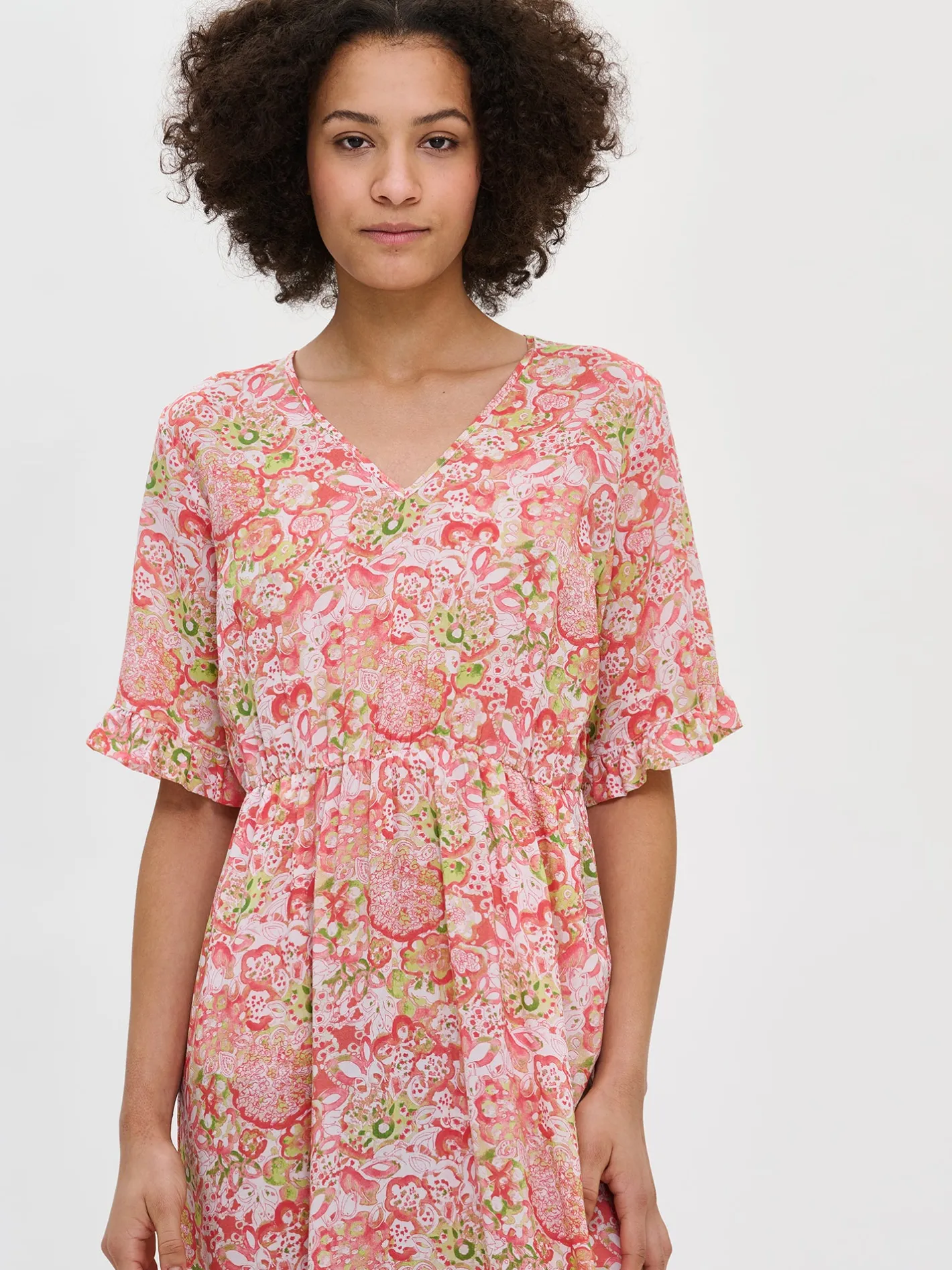 Naisten ihastuttava monivärinen Kreeta-mekko. Rento ja kevyt kangasmekko on mukava valinta kesään. Kauniissa vuorittomassa mekossa on v-pääntie ja lyhyet hihat, joiden hihansuissa on poimutus. Mekon vyötäröllä on kuminauha ja sivuissa on taskut. Mekon helma kellottuu kauniisti. Mekon pituus koossa 38 on noin 125 cm. Materiaali on kevyttä ja läpikuultavaa miellyttävän tuntuista LYOCELL TENCEL™ -kangasta. Materiaalille on ominaista 3-5% kutistuminen ensimmäisessä pesussa.