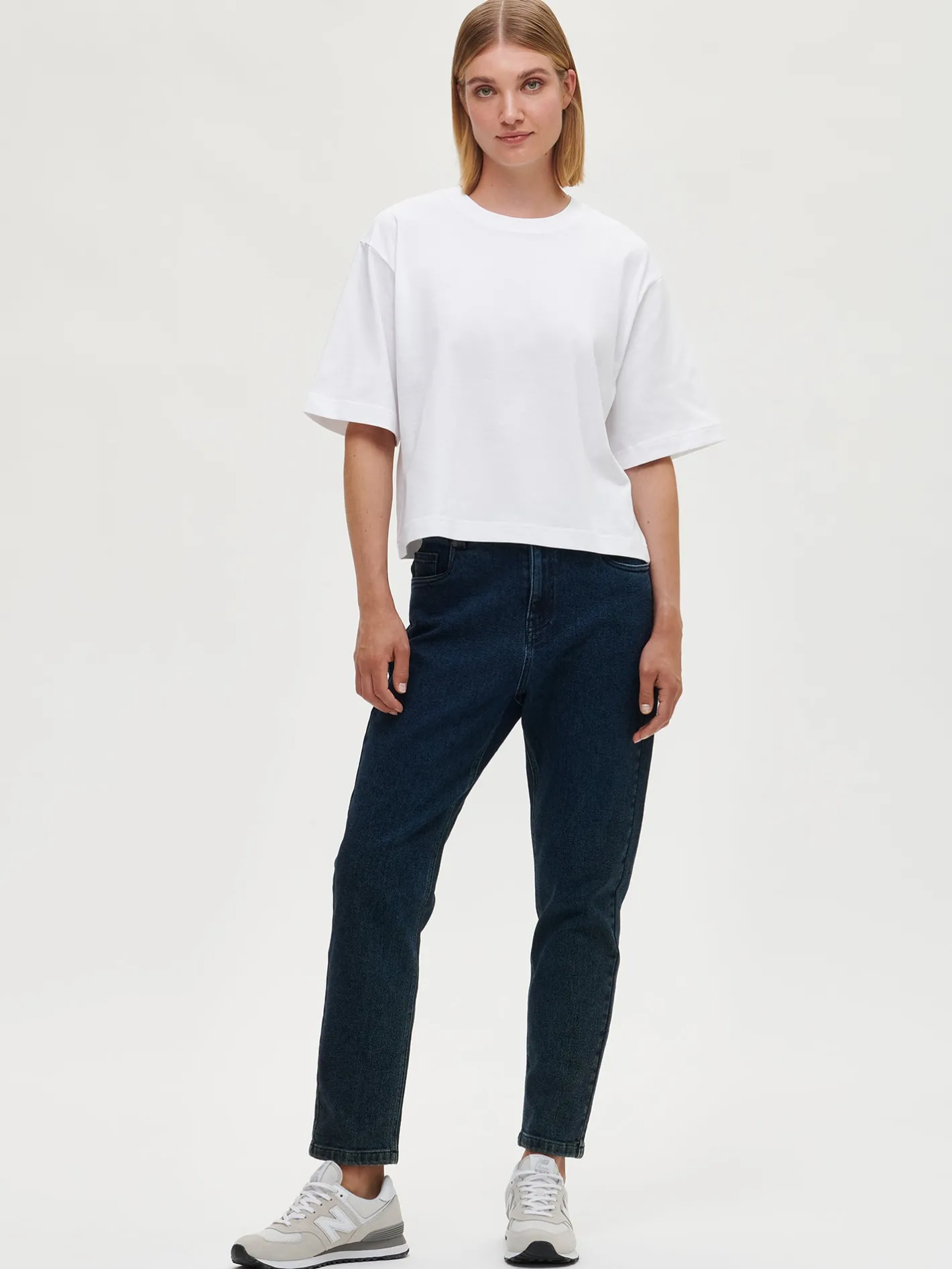 Naisten laadukas valkoinen Kroppi-t-paita. Klassinen t-paita sopii jokaiseen asuun ja siksi se on ajaton luottovaate. Laatikkomallisessa väljässä ja lyhyessä t-paidassa on pyöreä ribbi pääntie ja 2/4 pituiset väljät hihat. T-paidan pituus koossa M on noin 57 cm. Materiaali on 100% laadukasta luomupuuvillaa, joka pysyy hyvänä käytössä.
