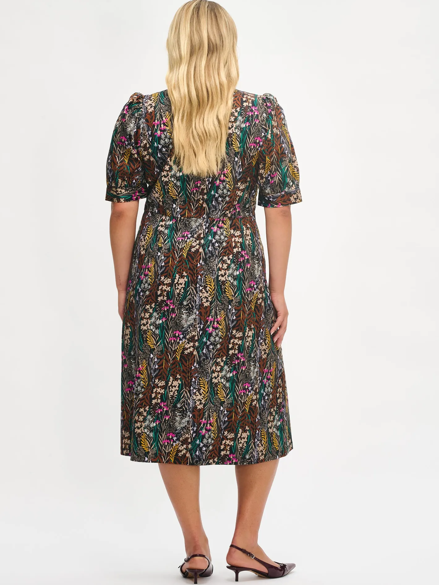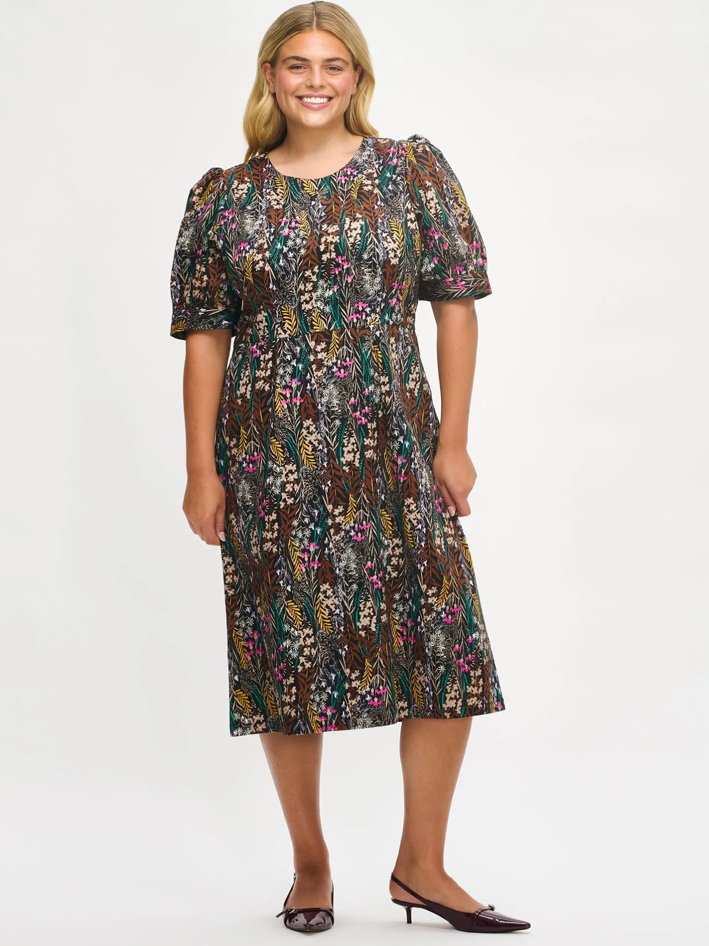 Naisten tyylikäs kuosillinen monivärinen Kuutamo-mekko. Mekossa on pyöreä pääntie, piilovetoketju selässä ja vuori. Mekossa on väljät ja muhkeat 2/4 pituiset hihat, jotka poimuttuvat kauniisti olalle sekä kalvosimen yläpuolelle. Hihansuissa on nappihalkiot. Mekon sivuissa on taskut, vyötäröllä leikkaussauma ja muotolaskokset sekä edessä että takana. Mekon pituus koossa 38 on noin 115 cm. Materiaali on mattapintaista kudottua puuvilla-satiinia, jossa mukana elastaania antamassa joustoa. Vuoren materiaali on laskeutuvaa polyester-kangasta.