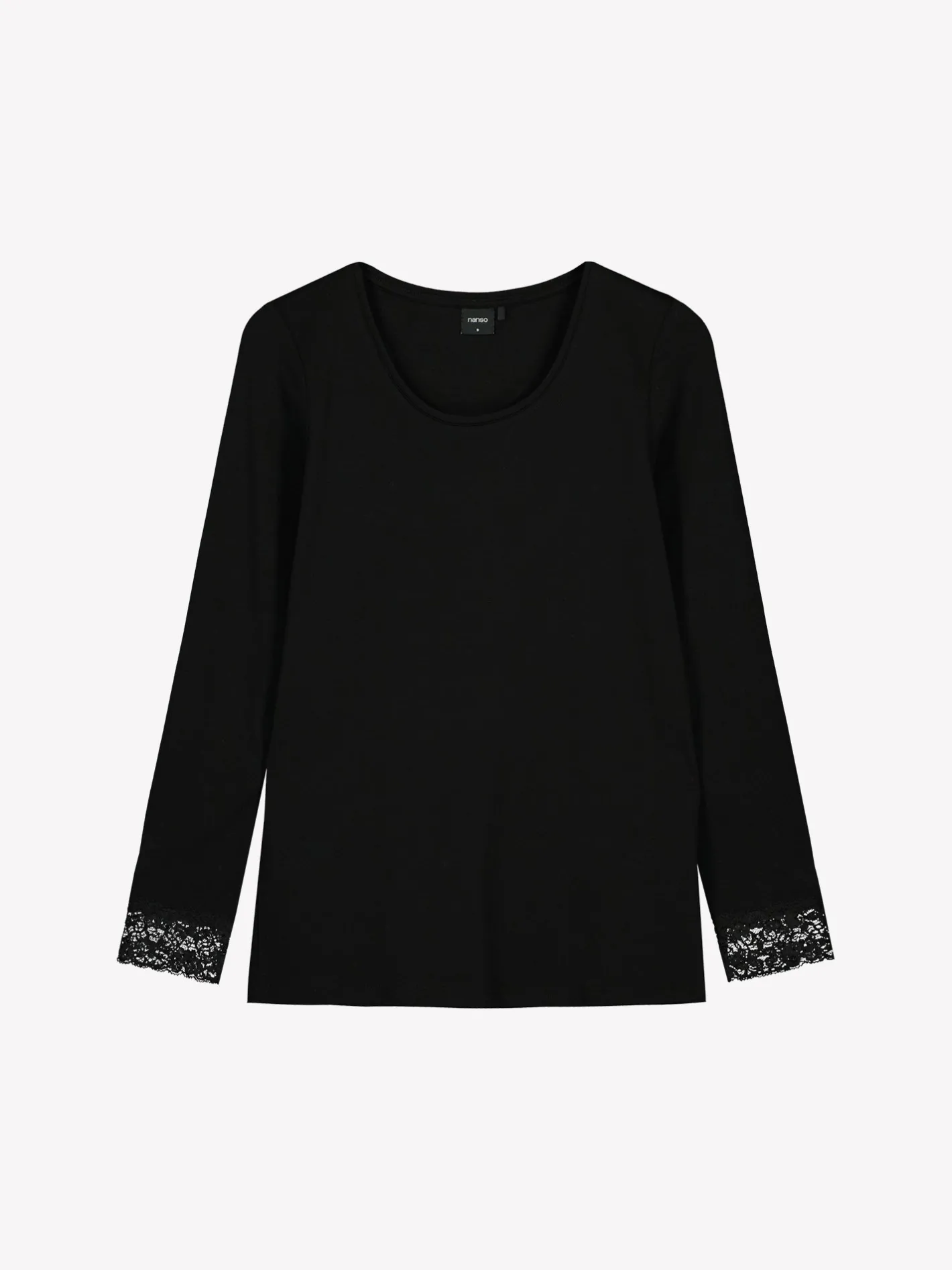 Naisten klassinen musta, pitkähihainen Lempi pusero pyöreällä pääntiellä. Hihat ovat täyspitkät ja hihansuussa on kauniit pitsikoristeet. Puseron pituus koossa M on noin 68 cm. Materiaali on miellyttävää ja joustavaa luomupuuvilla-elastaani-neulosta.