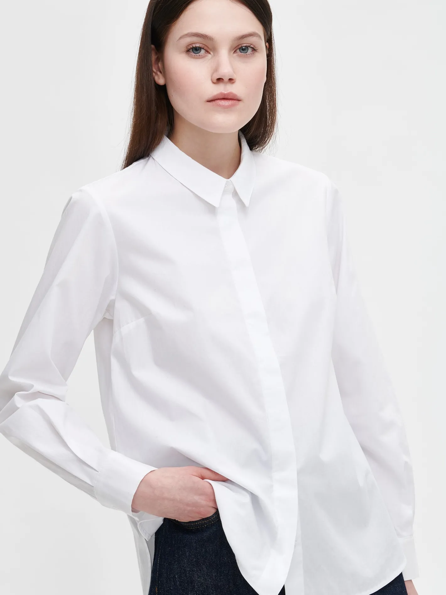 Naisten klassinen valkoinen Lena-paitapusero. Ajaton valkoinen kauluspaita hurmaa monikäyttöisyydellään ja siksi se on varma valinta kerta toisensa jälkeen. Tyylikkäässä paitapuserossa on edessä piilonapitus sekä helmassa sivuissa pyöristetyt halkiot. Puserossa on täyspitkät hihat, joiden hihansuissa on nappikalvosimet. Puseron pituus koossa 38 on noin 70 cm. Tuote on valmistettu laadukkaasta ja ryhdikkäästä kudotusta puuvilla-popliinikankaasta, jonka puuvilla on sertifioitua.