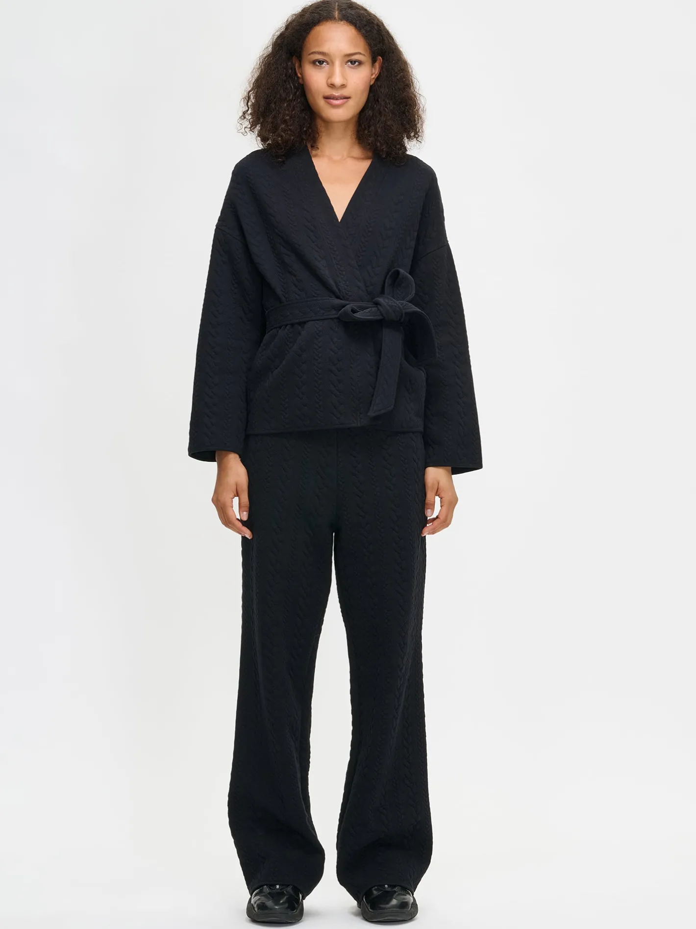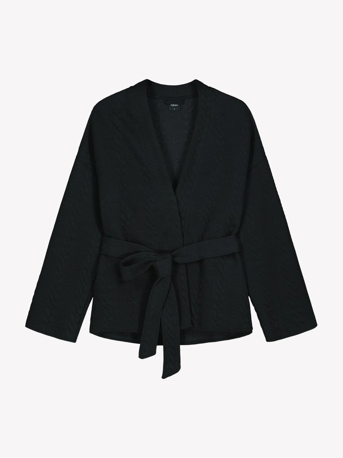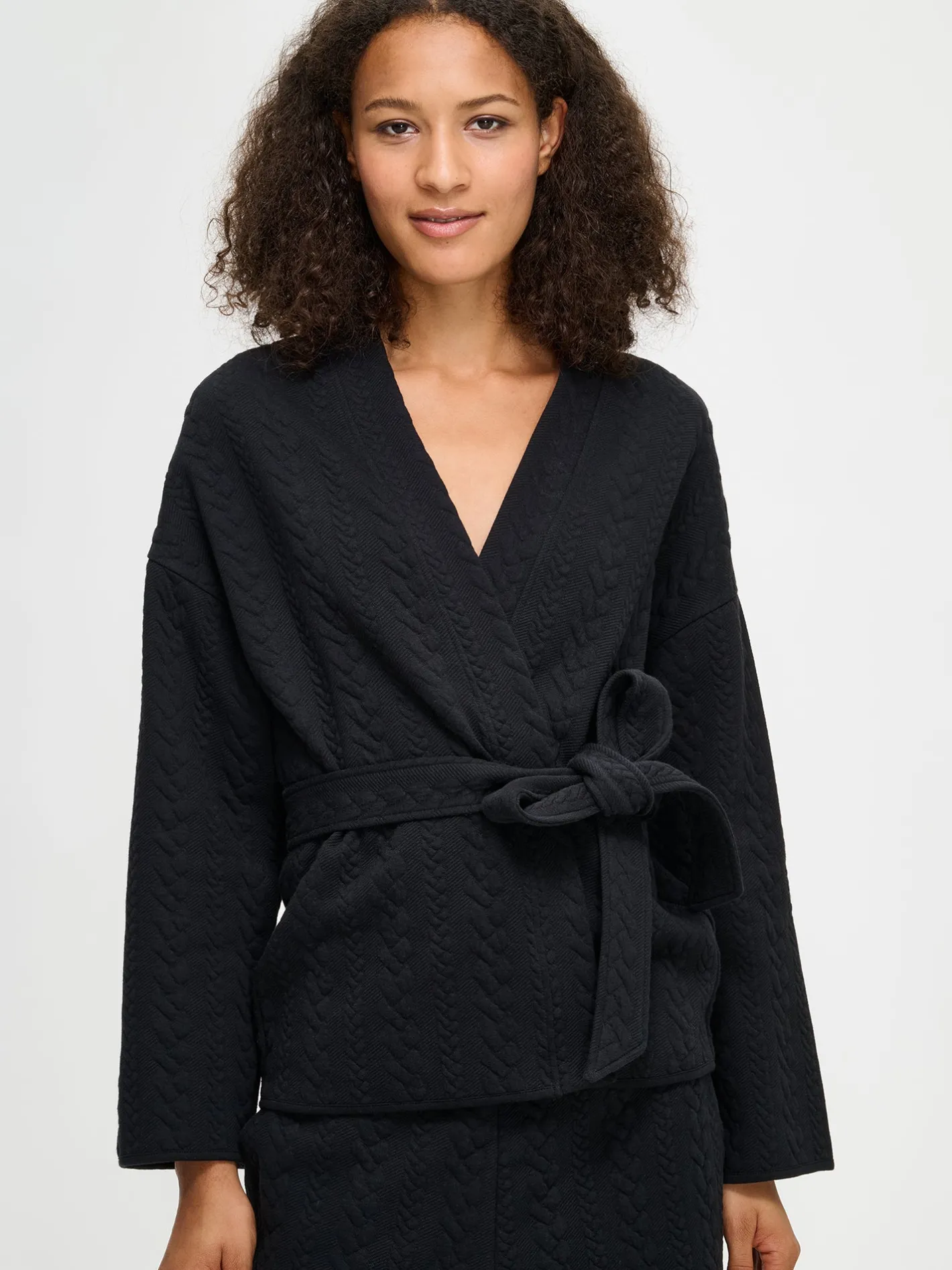 Naisten mukava musta Letti-jakku irtovyöllä. Suoralinjaisen jakun etureuna on huoliteltu leveällä kaitaleella, joka nousee niskassa kaulukseksi. Hihat ovat täyspitkät. Jakun pituus koossa M on noin 69 cm. Ryhdikäs palmikkomaisesti pintakuvioitu materiaali on miellyttävää puuvilla-elastaanineulosta. Materiaalille on ominaista 3-5 % kutistuminen ensimmäisessä pesussa.
