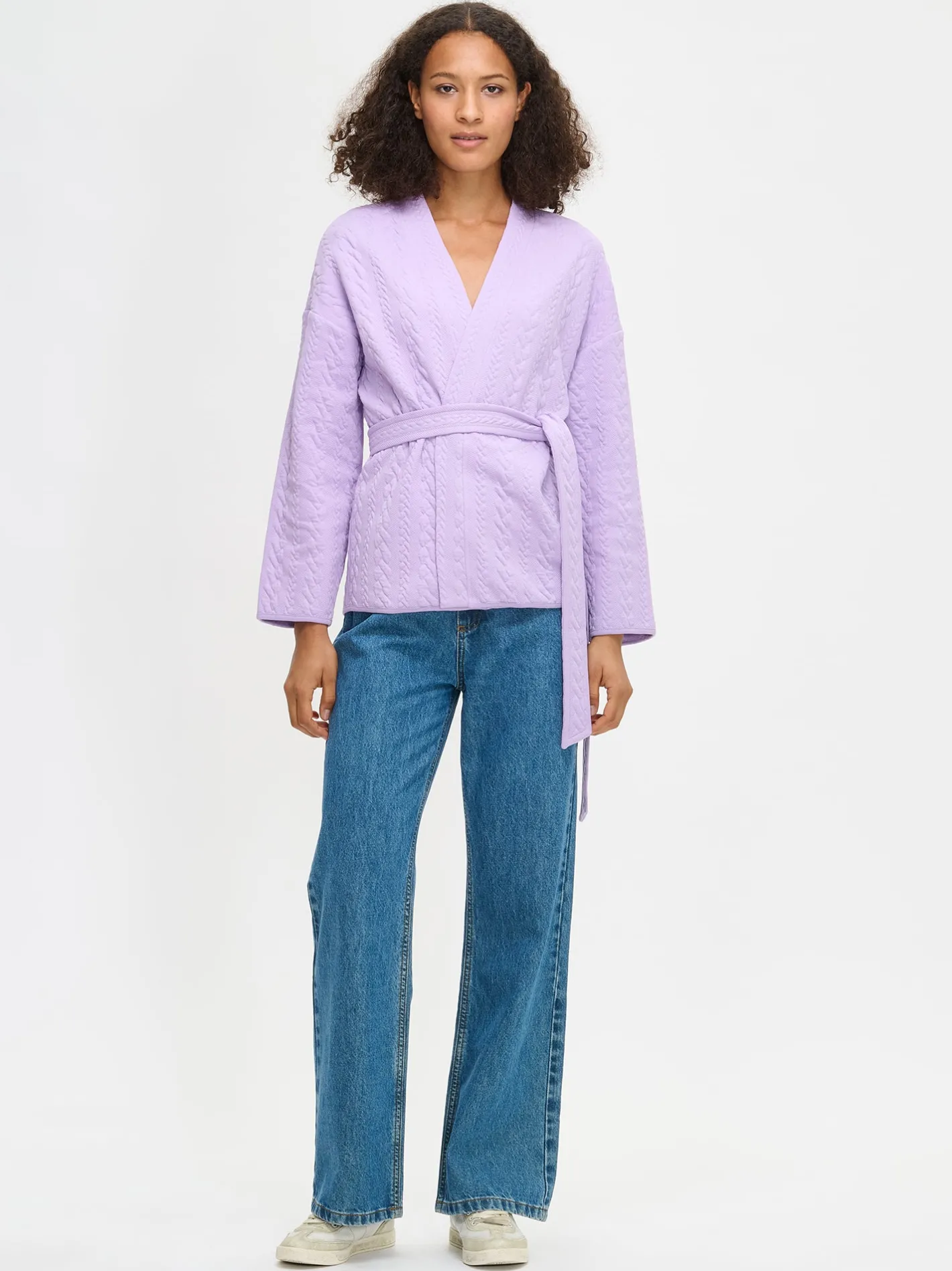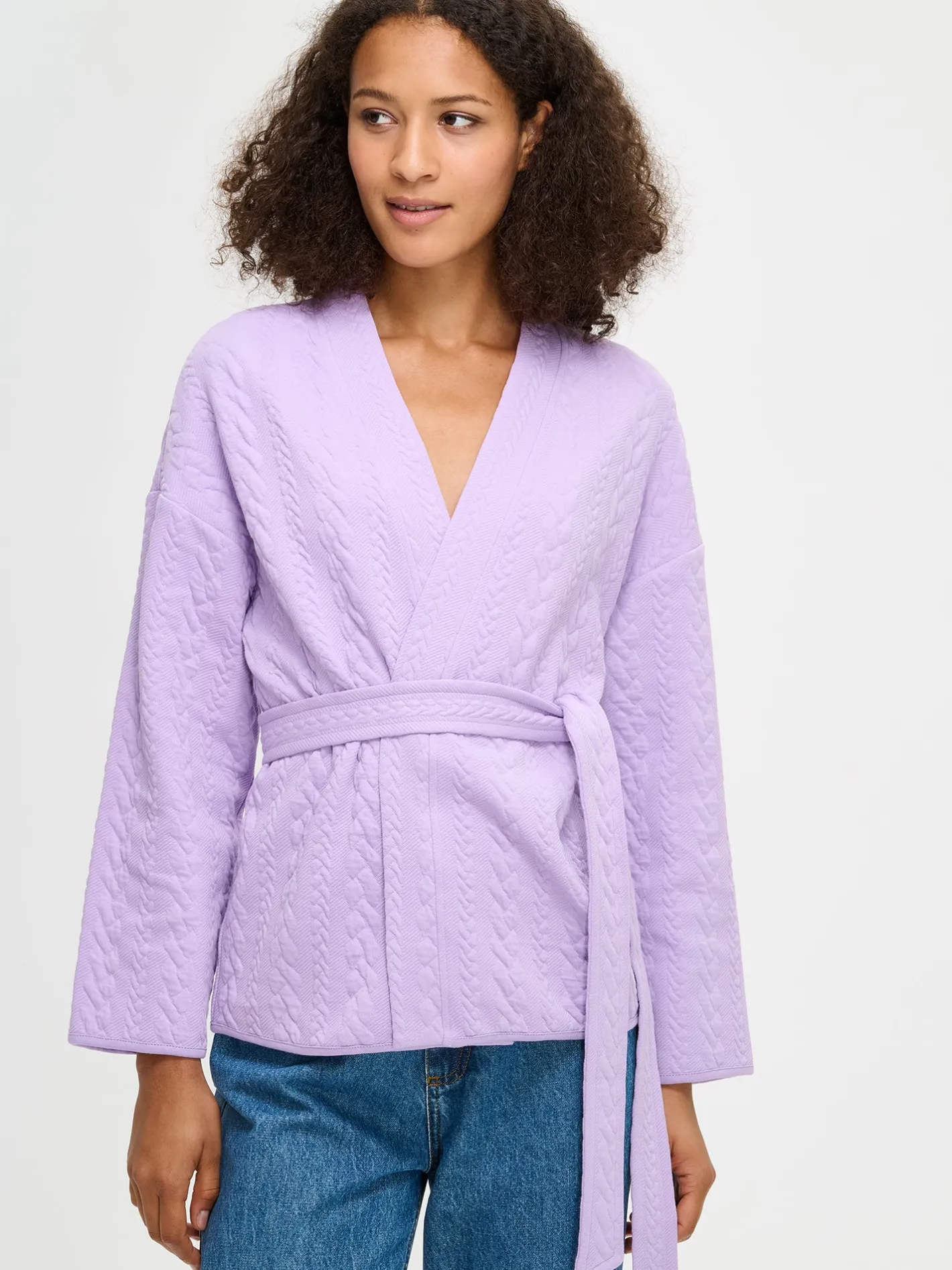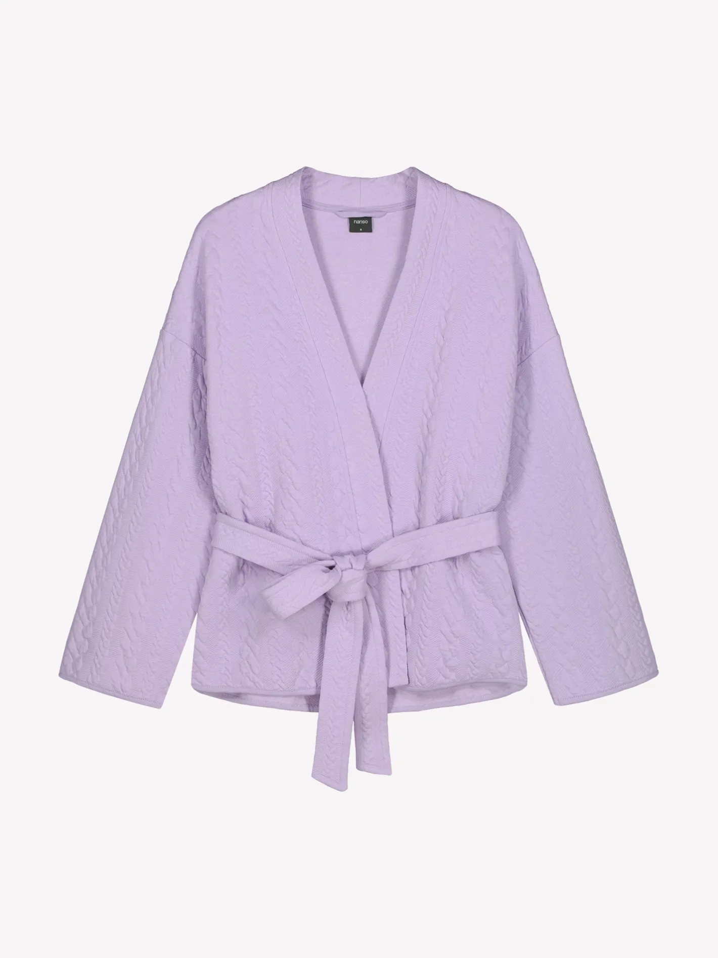 Naisten mukava lila Letti-jakku irtovyöllä. Suoralinjaisen jakun etureuna on huoliteltu leveällä kaitaleella, joka nousee niskassa kaulukseksi. Hihat ovat täyspitkät. Jakun pituus koossa M on noin 69 cm. Ryhdikäs palmikkomaisesti pintakuvioitu materiaali on miellyttävää puuvilla-elastaanineulosta. Materiaalille on ominaista 3-5 % kutistuminen ensimmäisessä pesussa.
