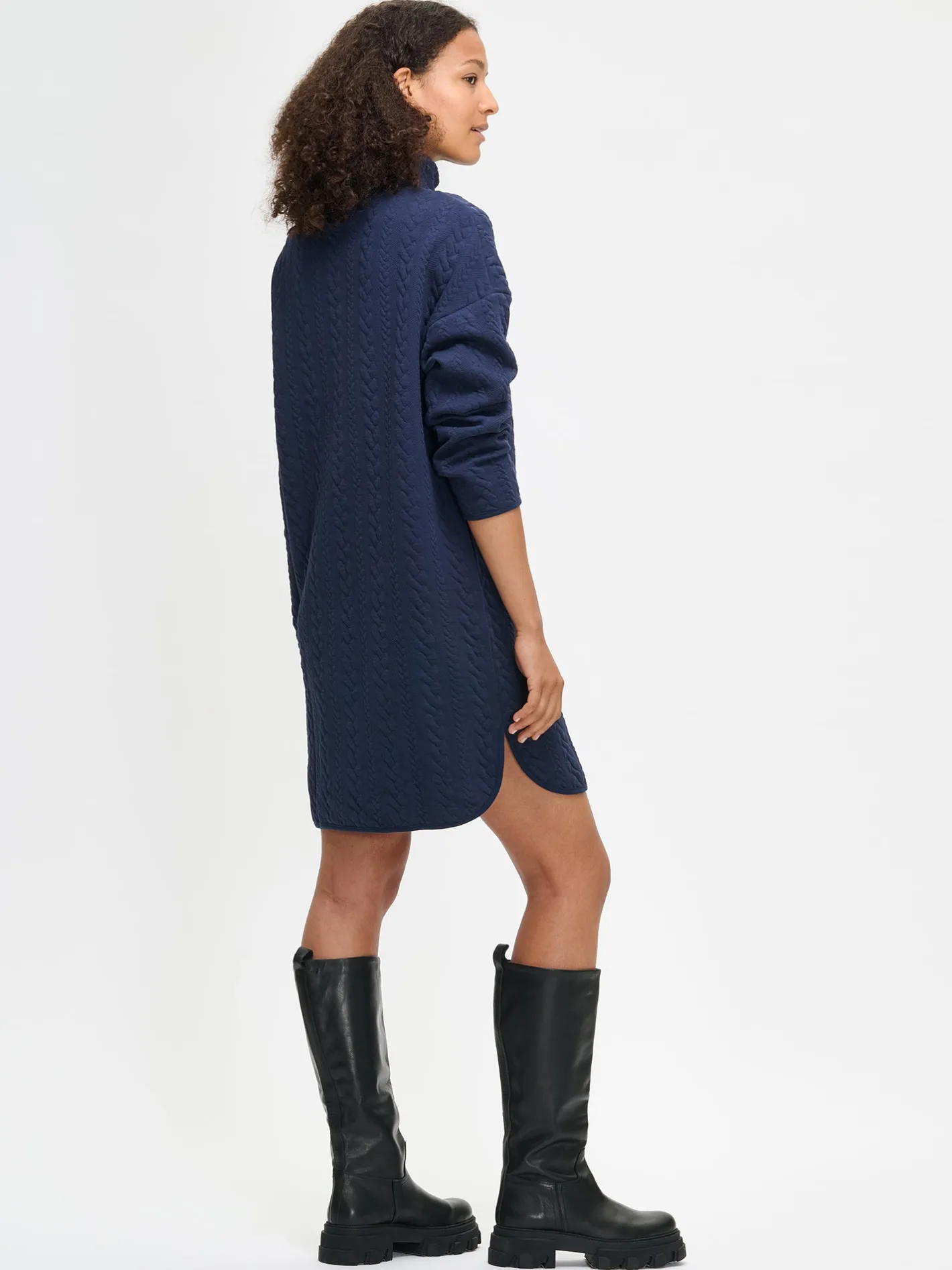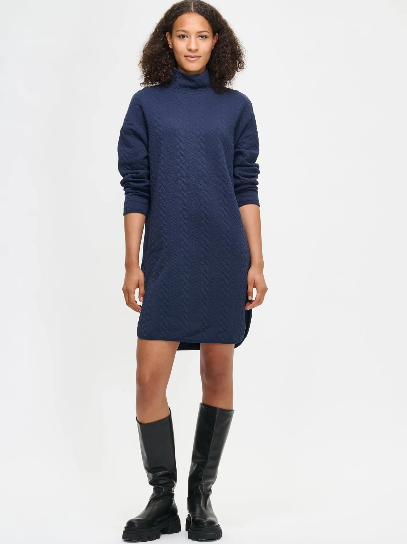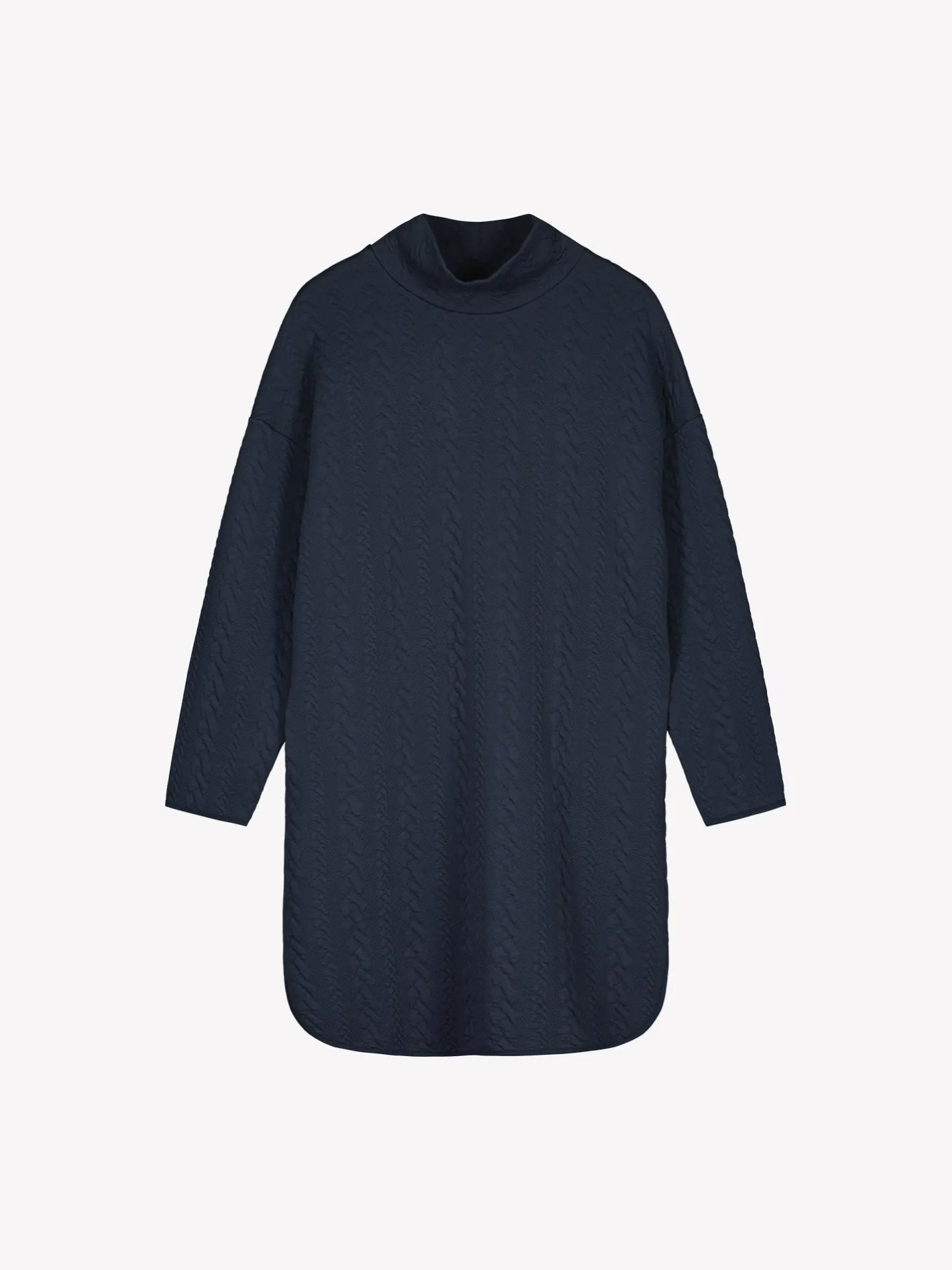 Naisten mukava tummansininen Letti-mekko poolokauluksella. Mekossa on pudotettu olkalinja, täyspitkät hihat ja sivutaskut. Helmassa on pyöristetyt halkiot. Mekon pituus koossa M on noin 97 cm. Ryhdikäs palmikkomaisesti pintakuvioitu materiaali on miellyttävää puuvilla-elastaanineulosta. Materiaalille on ominaista 3-5% kutistuminen ensimmäisessä pesussa.