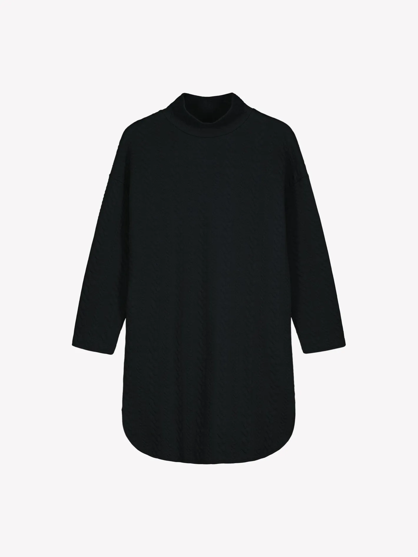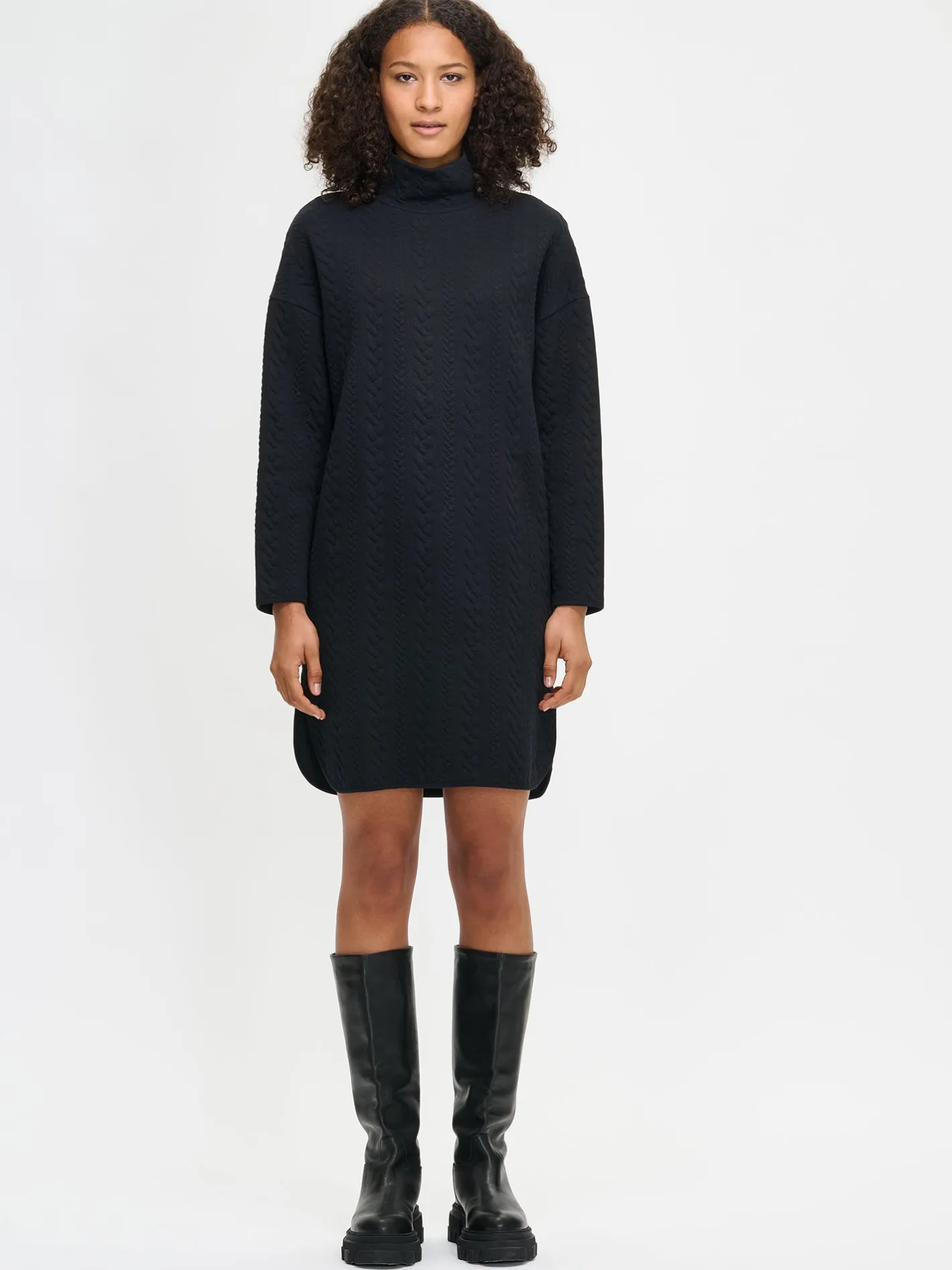Naisten mukava musta Letti-mekko poolokauluksella. Mekossa on pudotettu olkalinja, täyspitkät hihat ja sivutaskut. Helmassa on pyöristetyt halkiot. Mekon pituus koossa M on noin 97 cm. Ryhdikäs palmikkomaisesti pintakuvioitu materiaali on miellyttävää puuvilla-elastaanineulosta. Materiaalille on ominaista 3-5% kutistuminen ensimmäisessä pesussa.