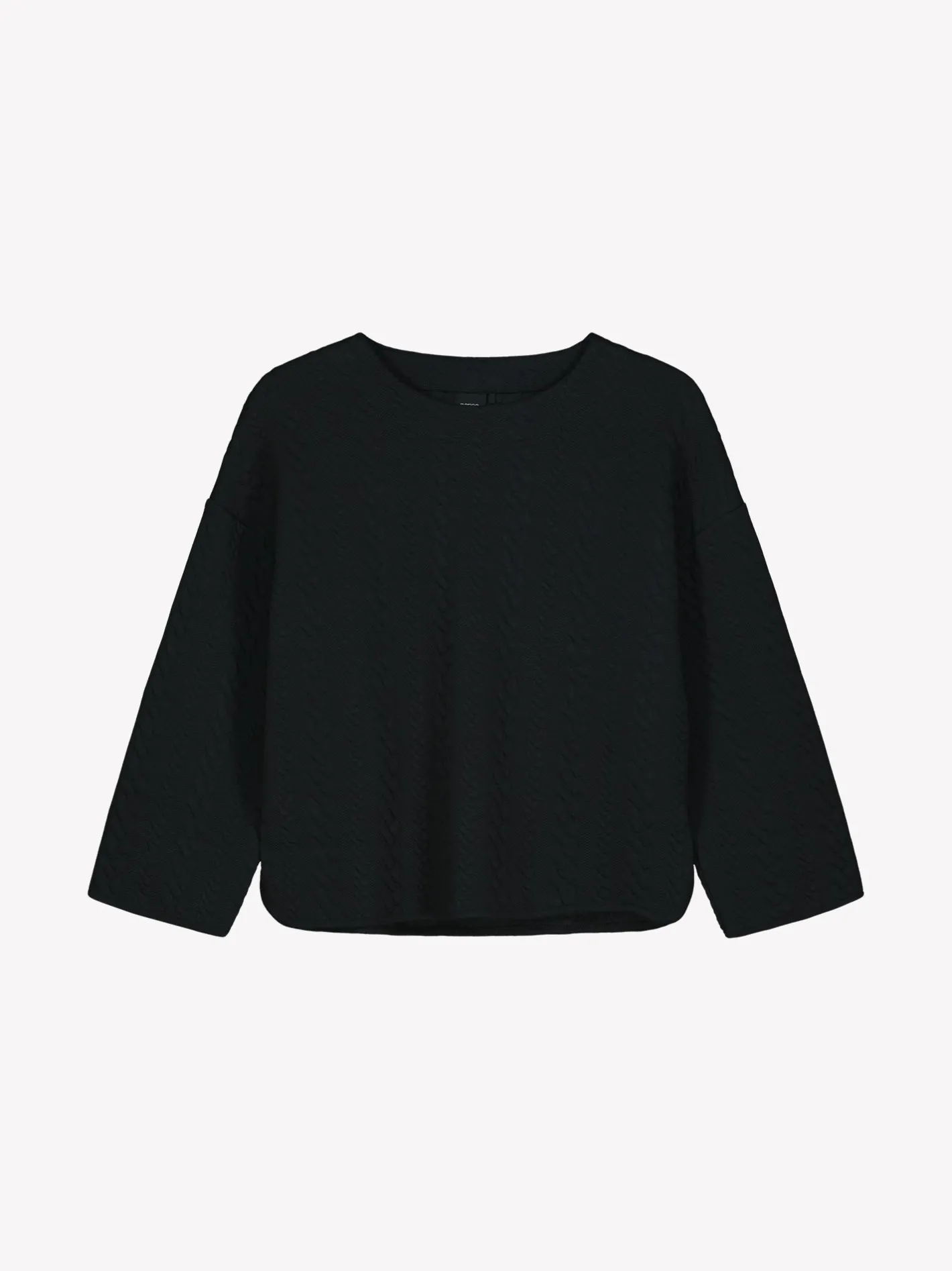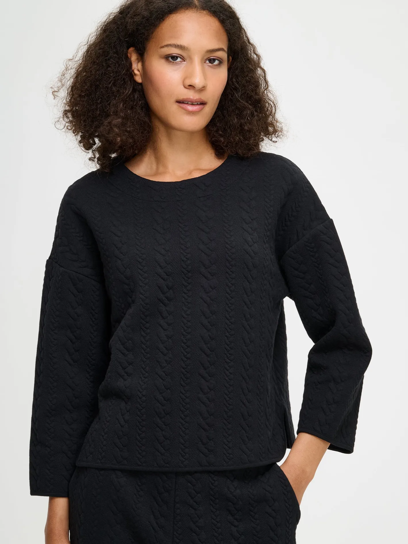 Naisten mukava musta Letti-pusero. Puserossa on alavaralla viimeistelty pyöreä pääntie, pudotettu olkalinja ja pitkät hihat. Puseron helmassa pyöristetyt halkiot. Puseron pituus koossa M on noin 64 cm. Ryhdikäs palmikkomaisesti pintakuvioitu materiaali on miellyttävää puuvilla-elastaanineulosta. Materiaalille on ominaista 3-5% kutistuminen ensimmäisessä pesussa.