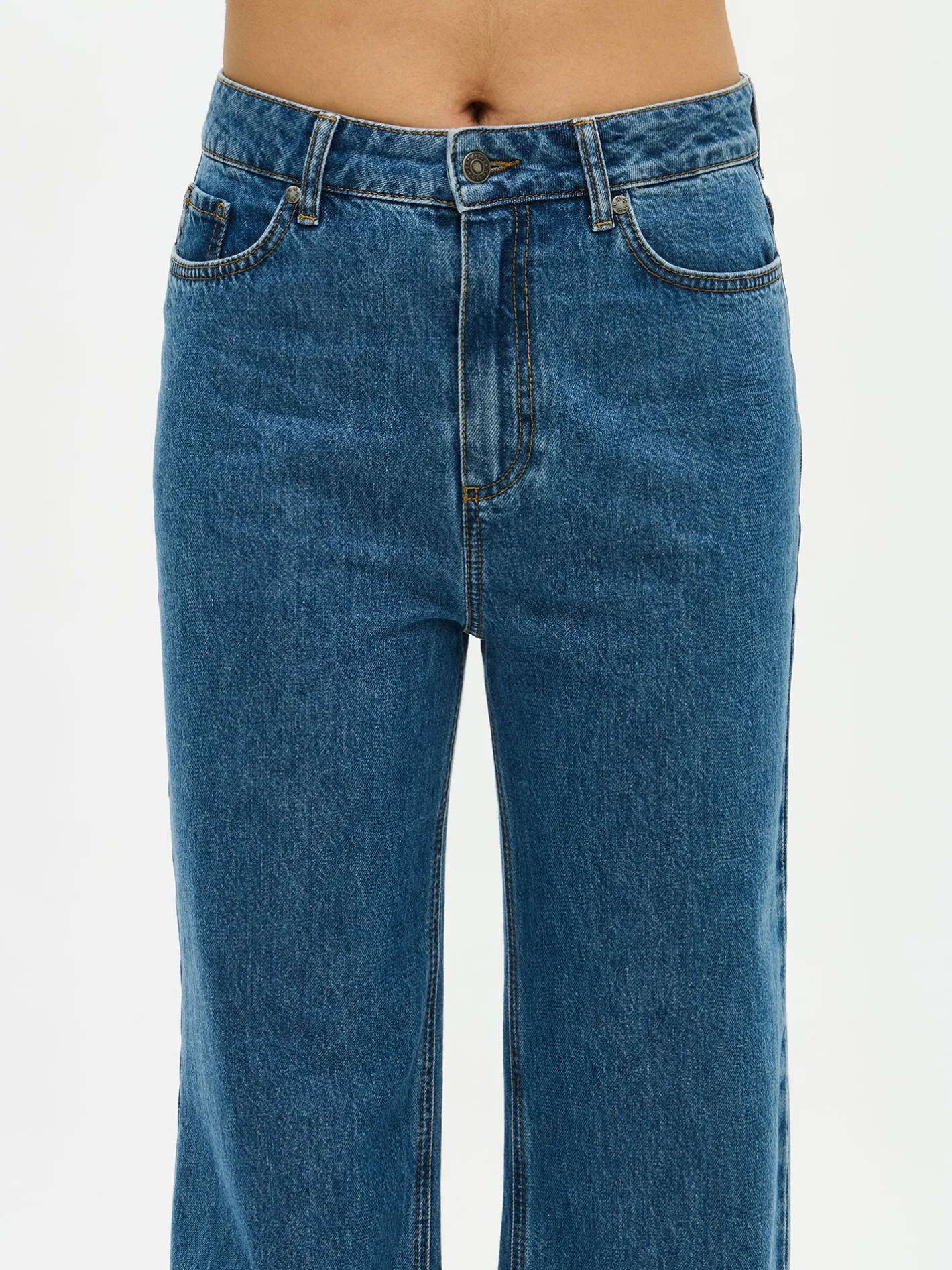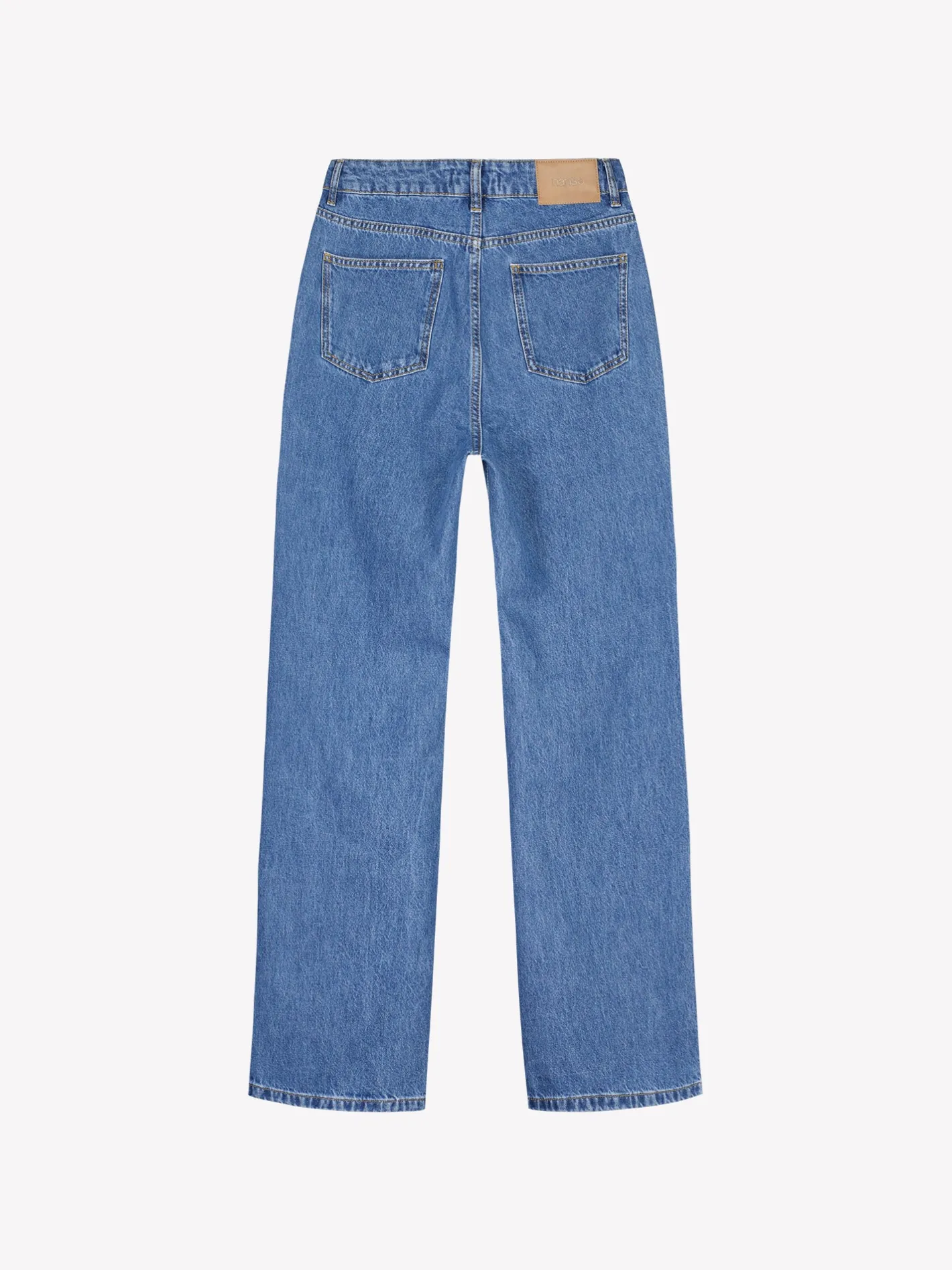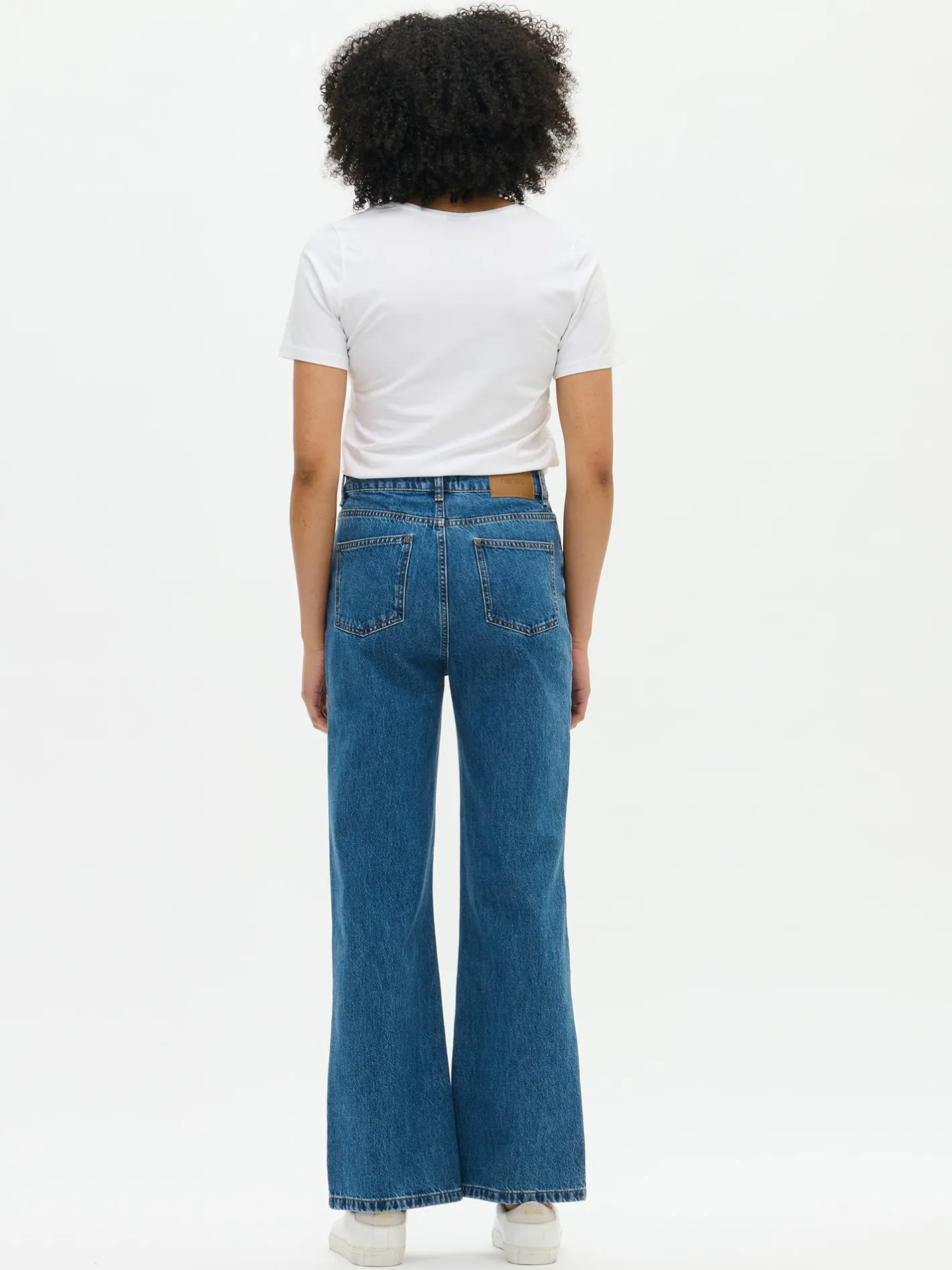 Naisten trendikkäät siniset Levee-farkut korkealla vyötäröllä. Farkut ovat arjen luottovaate, joka ei koskaan poistu muodista. Leveälahkeisissa farkuissa on vyötärökaitale, edessä vetoketju ja nappikiinnitys. Farkuissa on taskut edessä ja takana, sekä pieni kolikkotasku. Farkkujen lahkeet ovat levenevät ja lahkeen sisäpituus koossa 38 on noin 79 cm. Materiaali on kudottua twillsidoksista puuvilla-denimkangasta ja 20 % kankaaseen käytetystä puuvillasta on kierrätettyä.