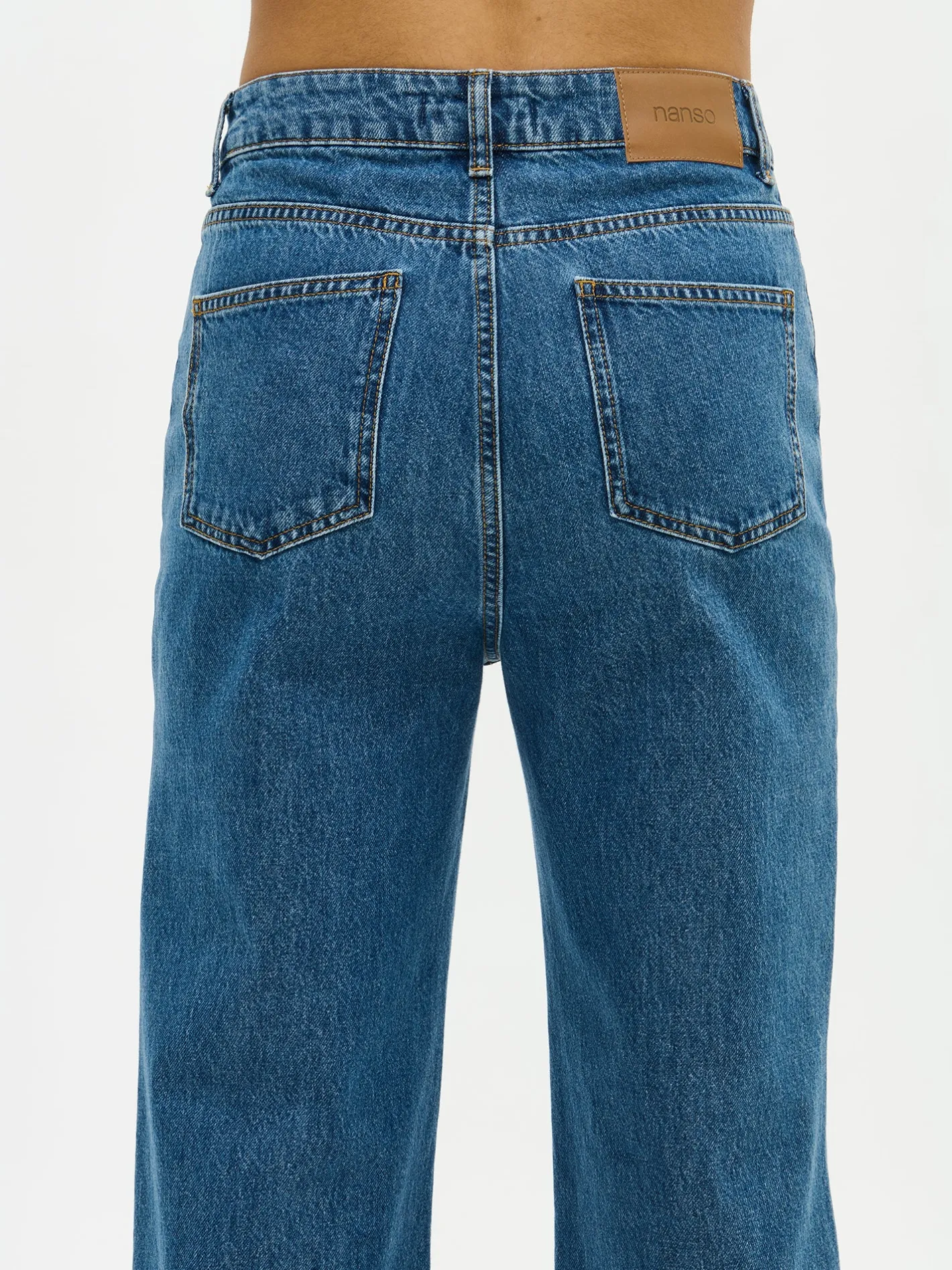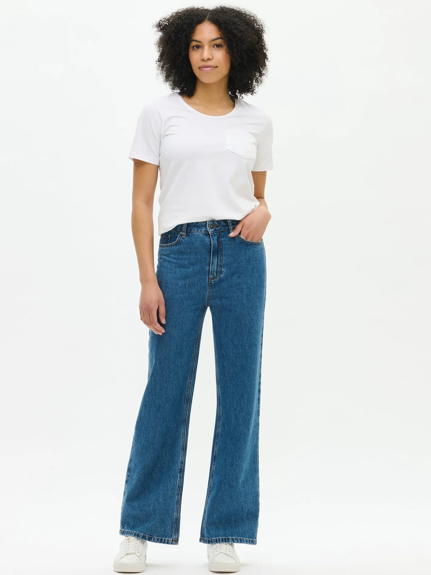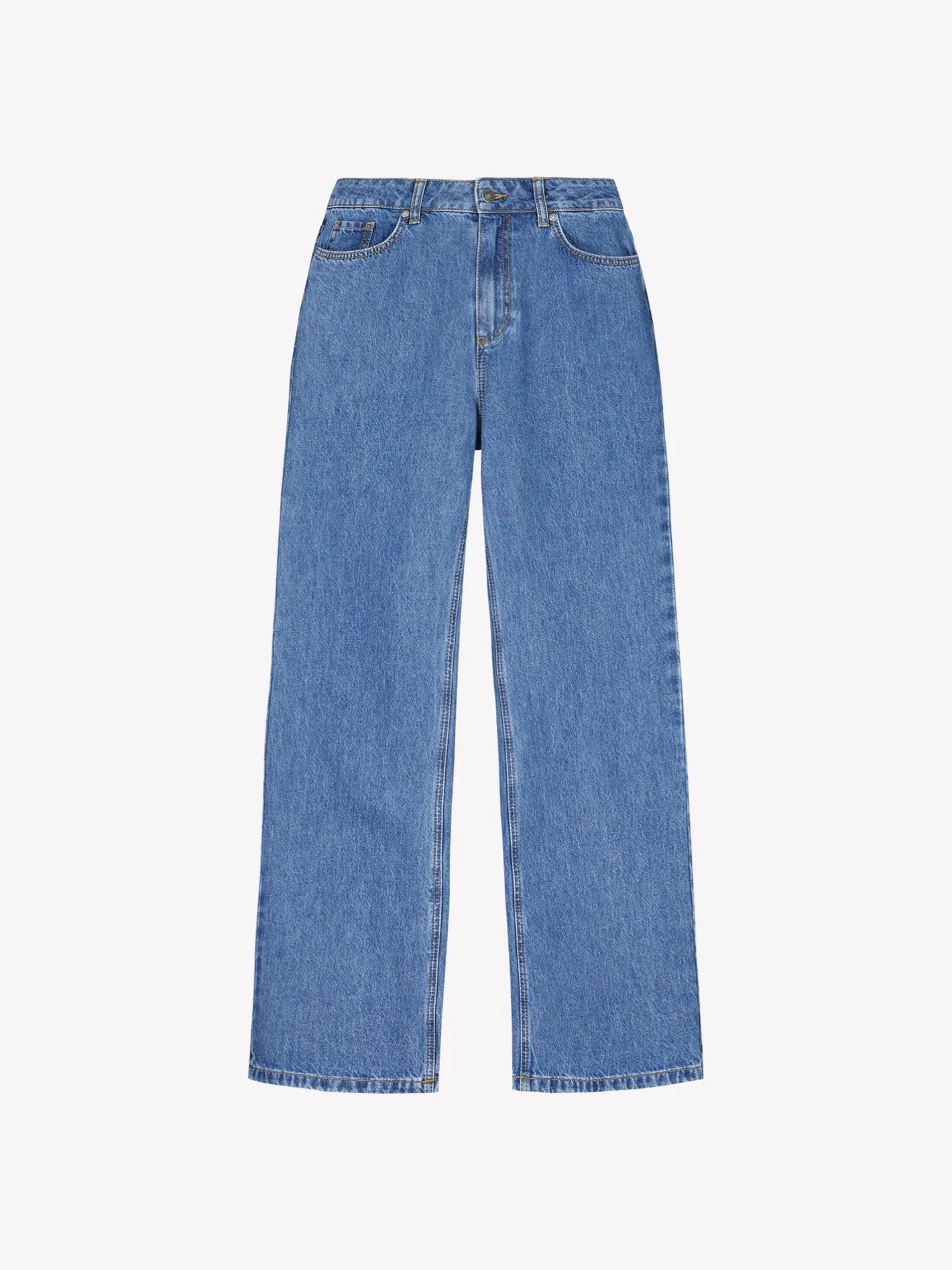 Naisten trendikkäät siniset Levee-farkut korkealla vyötäröllä. Farkut ovat arjen luottovaate, joka ei koskaan poistu muodista. Leveälahkeisissa farkuissa on vyötärökaitale, edessä vetoketju ja nappikiinnitys. Farkuissa on taskut edessä ja takana, sekä pieni kolikkotasku. Farkkujen lahkeet ovat levenevät ja lahkeen sisäpituus koossa 38 on noin 79 cm. Materiaali on kudottua twillsidoksista puuvilla-denimkangasta ja 20 % kankaaseen käytetystä puuvillasta on kierrätettyä.
