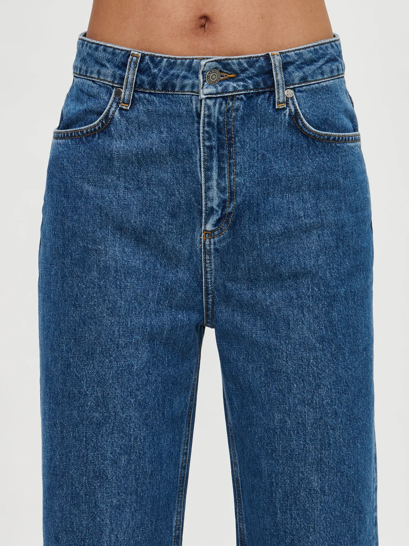 Naisten trendikkäät siniset Levee-farkut korkealla vyötäröllä. Leveälahkeisissa farkuissa on vyötärökaitale, edessä vetoketju ja nappikiinnitys. Farkuissa on taskut edessä ja takana. Farkkujen lahkeet ovat levenevät. Lahkeen sisäpituus koossa 38 on noin 79 cm. Materiaali on kudottua twillsidoksista puuvilla-denimkangasta. 20% kankaaseen käytetystä puuvillasta on kierrätettyä.