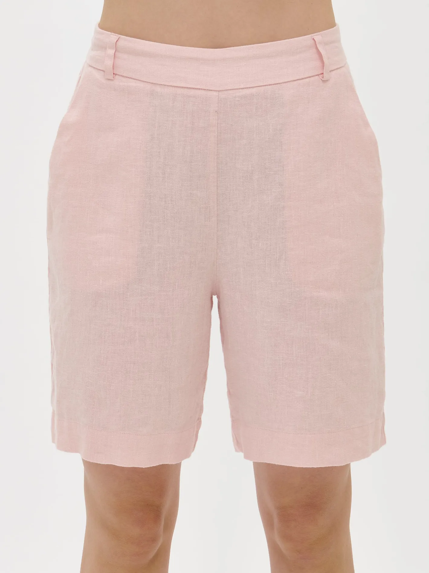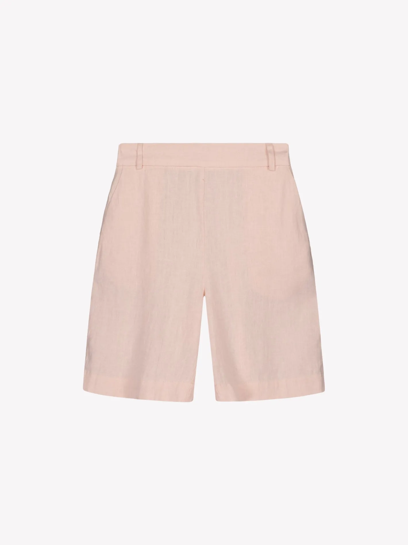 Naisten klassiset vaaleanpunaiset Liine-pellavashortsit. Tyylikkäät ja ajattomat pellavashortsit ovat kesän luottovaate. Shortseissa on leveä vyötärökaitale ja takana kuminauha. Shortseissa on sivuissa taskut ja leveä käänne lahkeensuissa. Shortsien lahkeen sisäpituus koossa 38 on noin 24 cm. Materiaali on kudottua pellavakangasta, joka on kestävää ja hengittävää. Pellavalle on ominaista luonnollinen pieni rypistyminen. Tuote on esipesty tuotannossa, joten se ei kutistu ensimmäisessä pesussa.