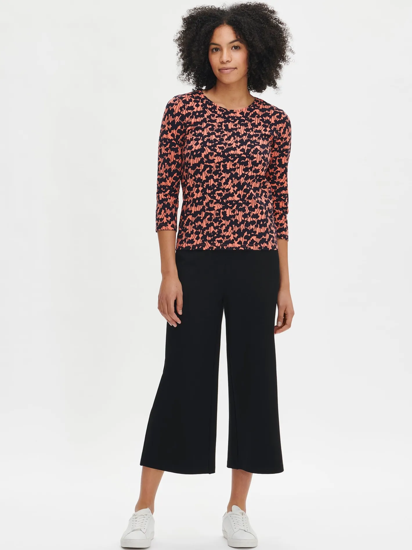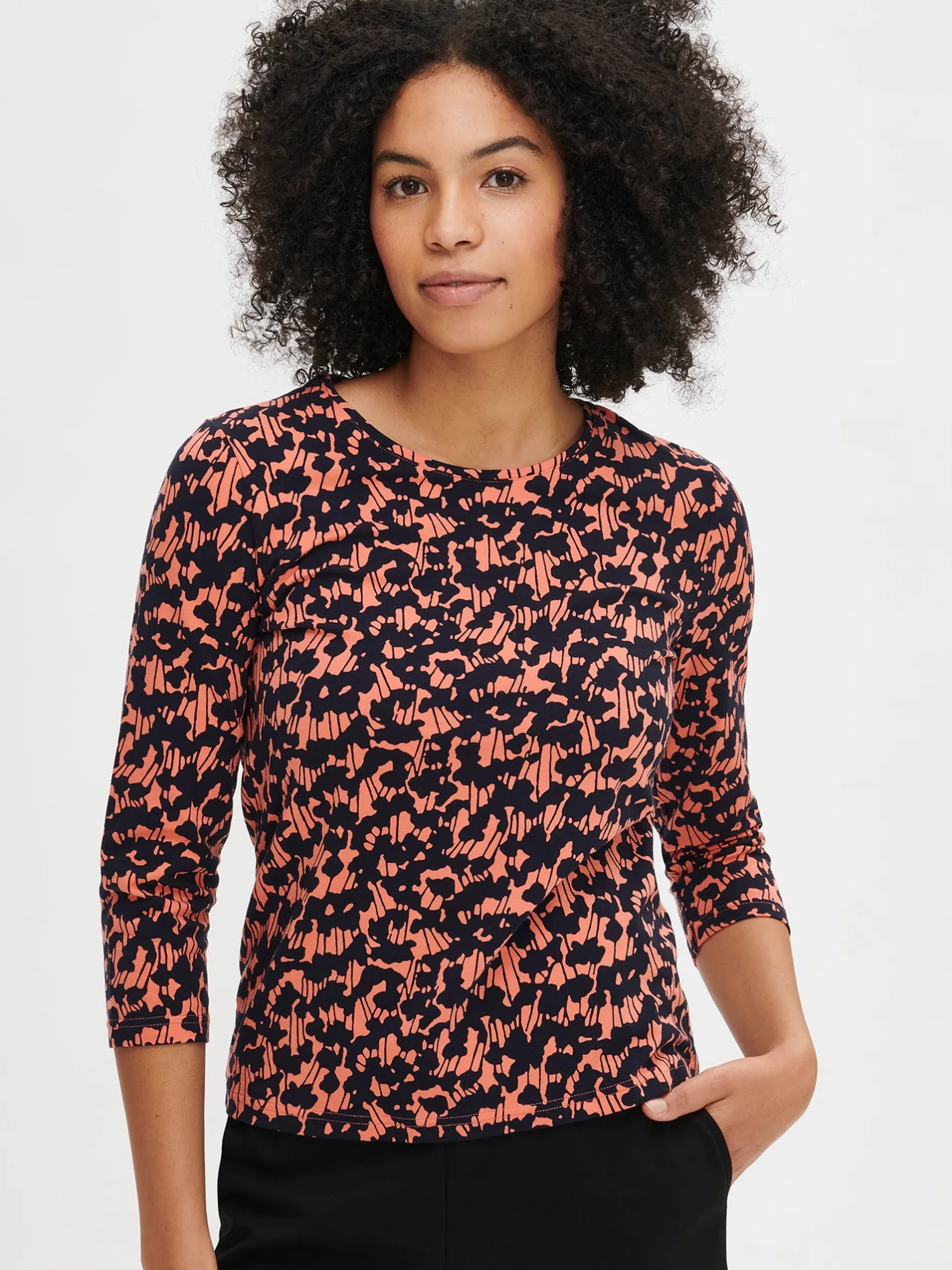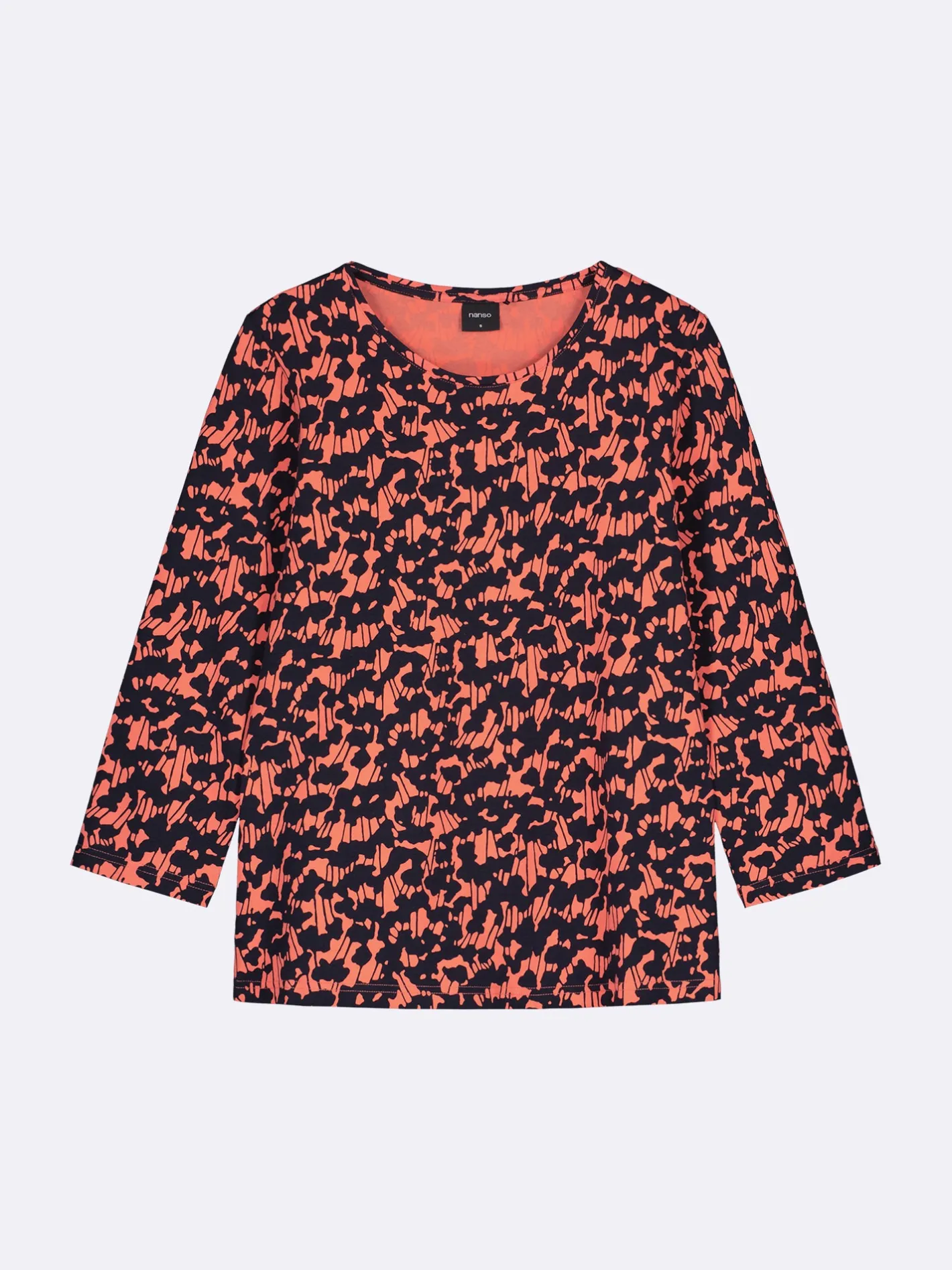 Naisten kuosillinen Liito-pusero. Istuvassa puserossa on pyöreä tereellä viimeistelty pääntie ja 3/4 pituiset hihat. Puseron pituus koossa M on noin 65 cm. Materiaali on miellyttävän tuntuista ja helppohoitoista puuvilla-elastaani-neulosta.