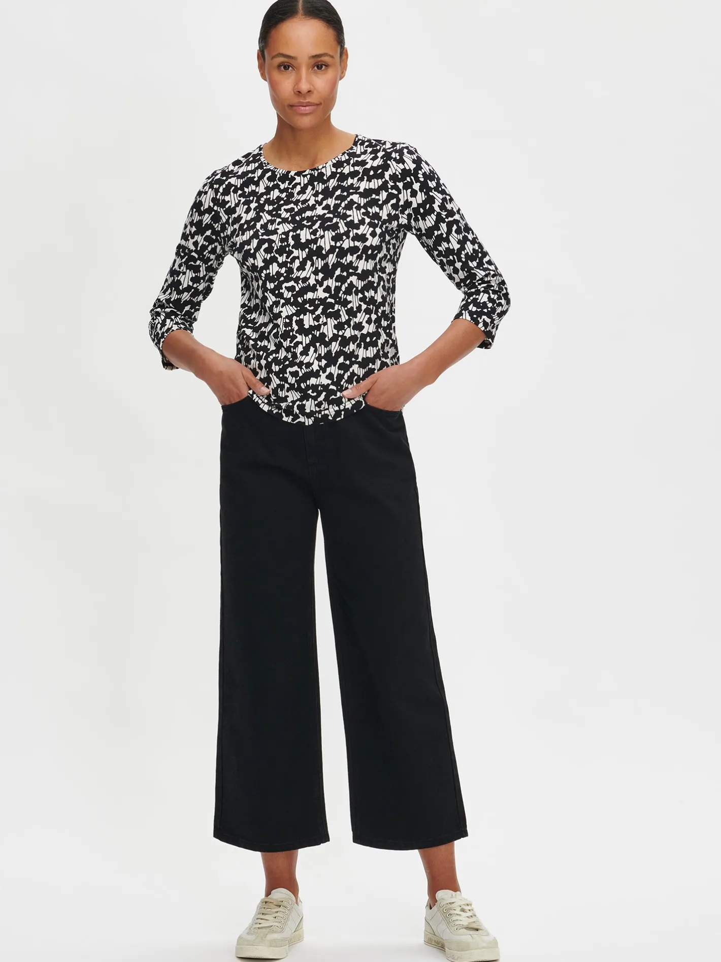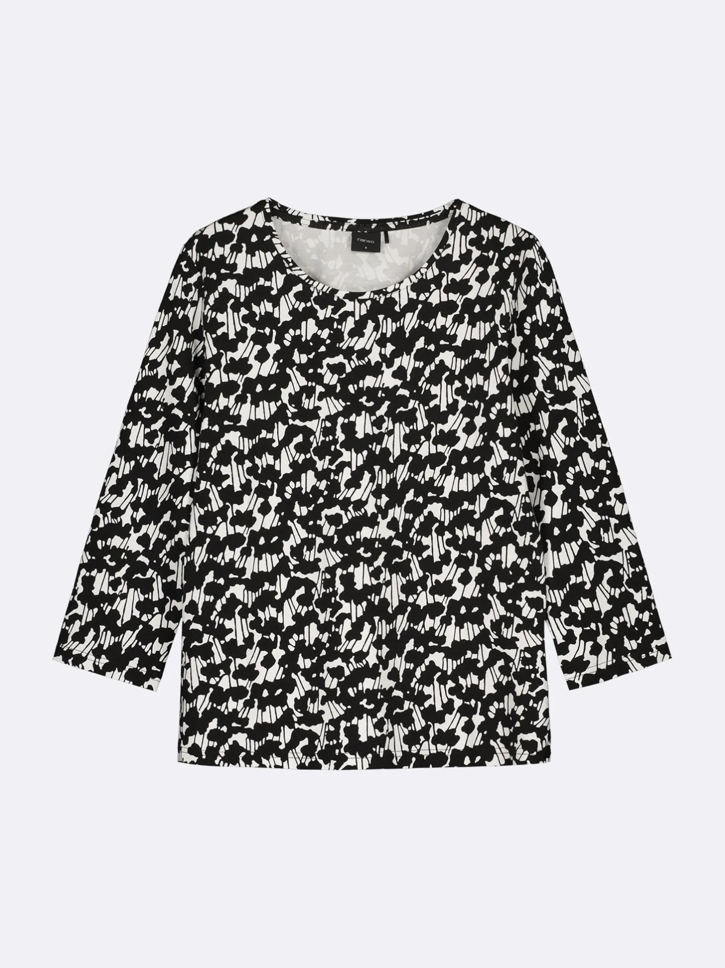 Naisten kuosillinen mustavalkoinen Liito-pusero. Istuvassa puserossa on pyöreä tereellä viimeistelty pääntie ja 3/4 pituiset hihat. Puseron pituus koossa M on noin 65 cm. Materiaali on miellyttävän tuntuista ja helppohoitoista puuvilla-elastaani-neulosta.