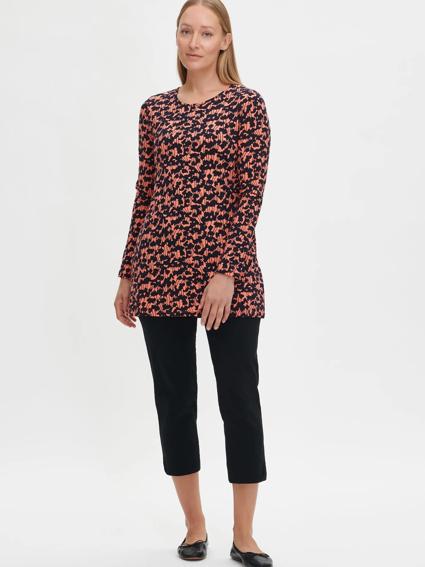 Naisten pitkähihainen punainen Liito-tunika kauniilla kuosilla. Tunikassa on pyöreä tereellä viimeistelty pääntie, sivuissa taskut ja täyspitkät hihat. Tunikan pituus koossa M on noin 80 cm. Materiaali on miellyttävän tuntuista ja helppohoitoista puuvilla-elastaani-neulosta.