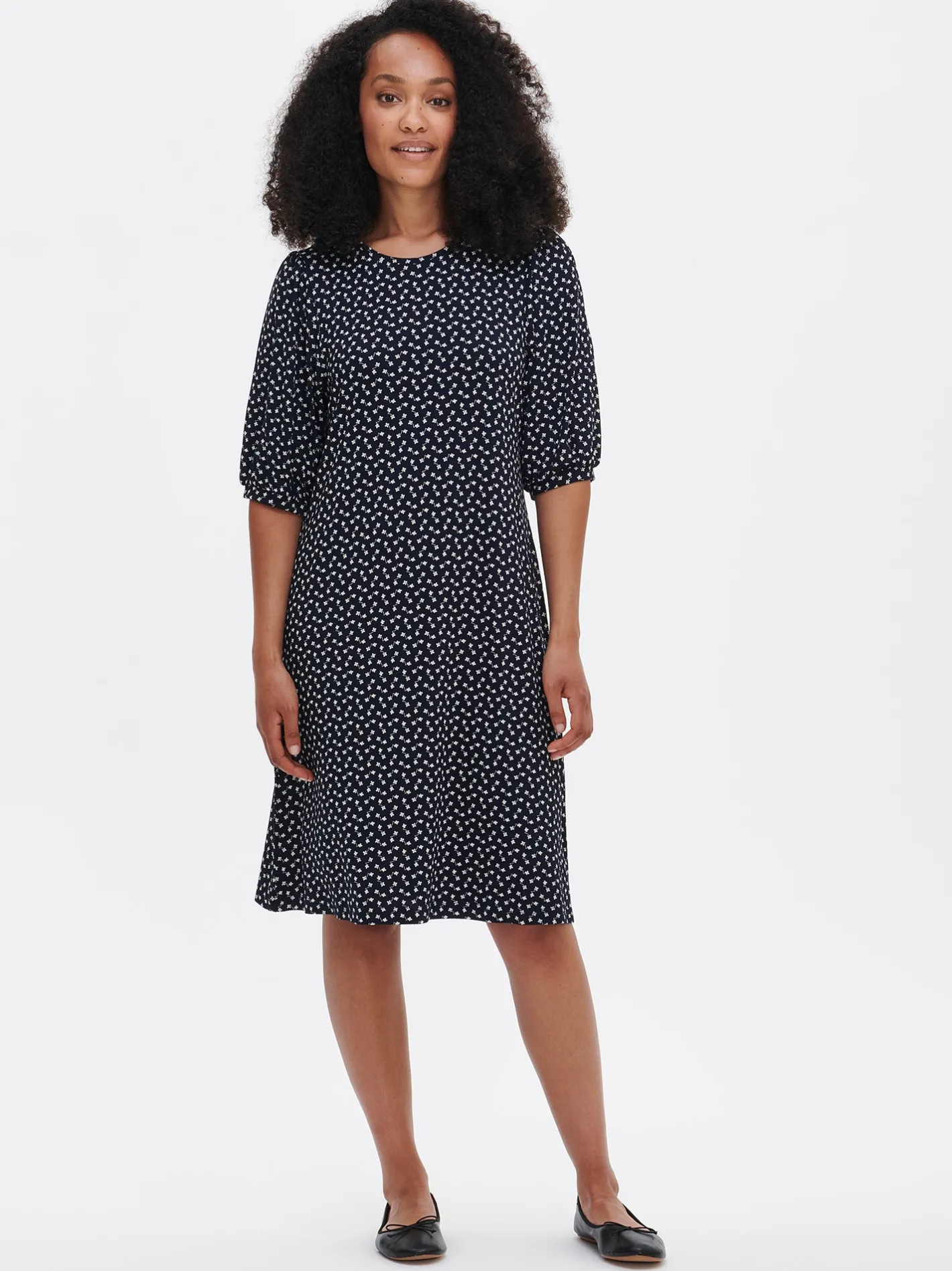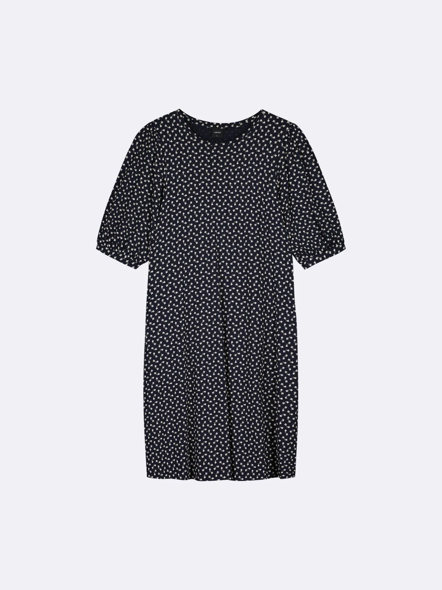 Naisten kuosillinen tummansininen lyhyt Liliana-mekko. Mekossa on tereellä viimeistelty pyöreä pääntie, sivutaskut ja kevyesti kellottuva helma. 2/4 pituiset hihat poimuttuvat olalta sekä hihansuun kaitaleen yläpuolelta. Mekon pituus koossa M on noin 95 cm. Kauniisti laskeutuvan mekon materiaali on laadukasta ja miellyttävän tuntuista viskoosi-elastaani-neulosta. Viskoosineulos on sähköistymätöntä ja helppohoitoista. Tuote on valmistettu LENZING™ ECOVERO™ -viskoosista. Materiaalille on ominaista 3-5 % kutistuminen ensimmäisessä pesussa.
