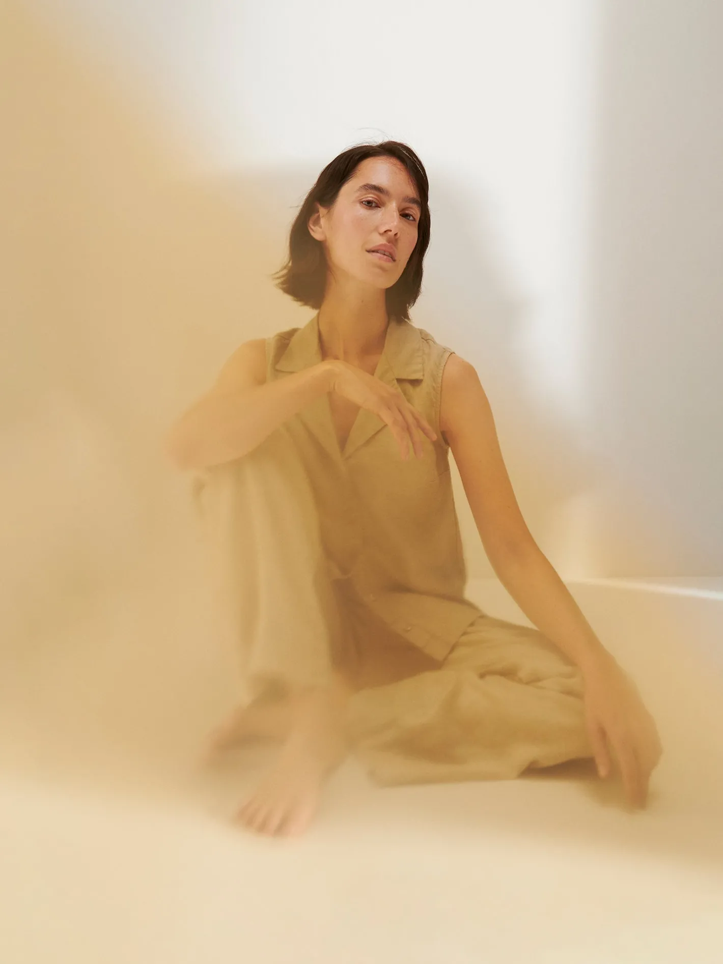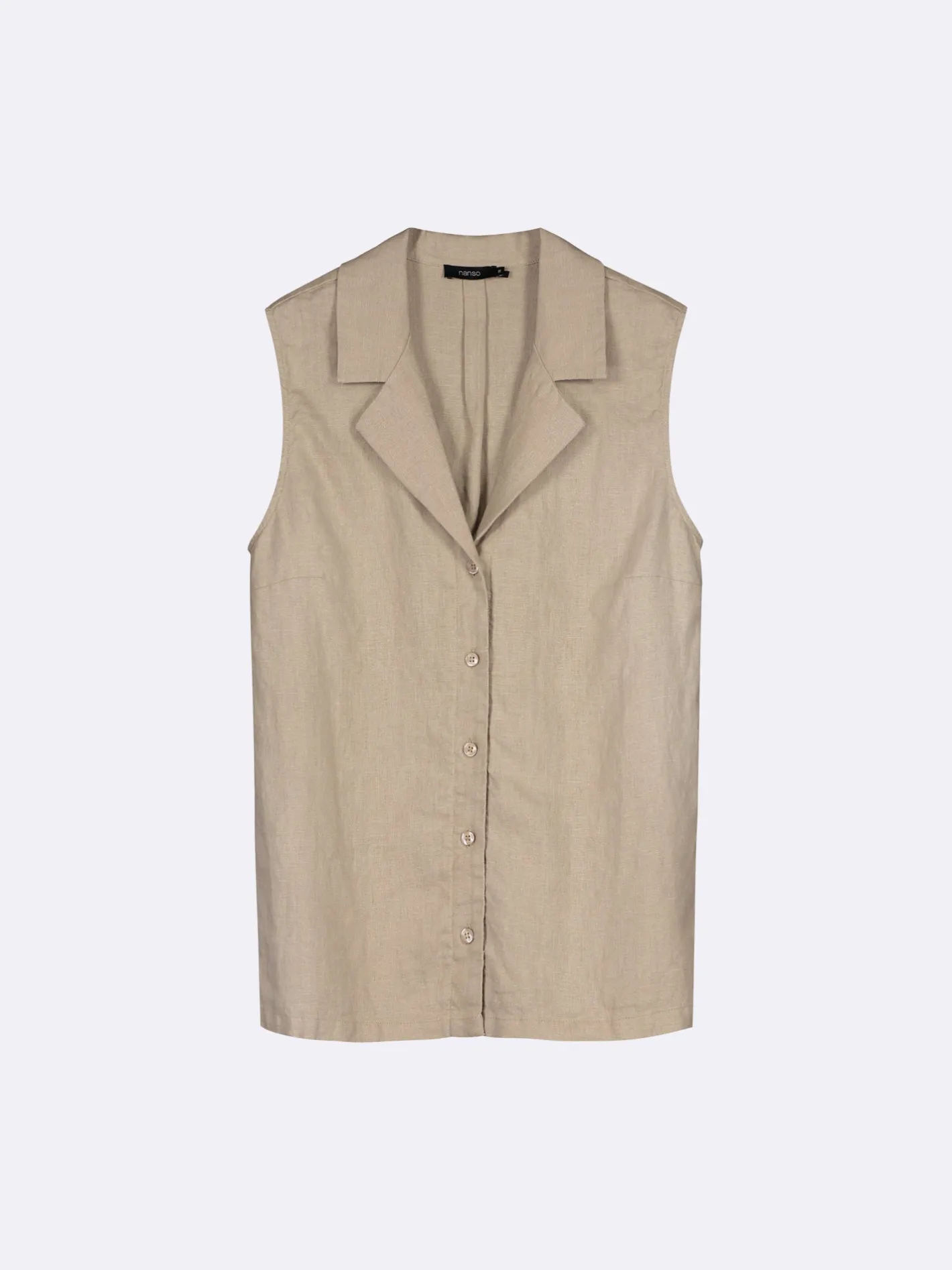 Naisten tyylikäs beige Lin-pellavatoppi. Ajaton pellavatoppi on ihana vaate vuoden ympäri. Yhdistä Lin-toppi samanvärisiin ja viimeistele asu . Lin-topissa on kauniisti muotoiltu kaulus, nappilista edessä ja sivuhalkiot. Topin pituus koossa 38 on noin 65 cm. Materiaali on kudottua pellavakangasta, joka on kestävää ja hengittävää. Pellavalle on ominaista luonnollinen pieni rypistyminen. Tuote on esipesty tuotannossa, joten se ei kutistu ensimmäisessä pesussa.