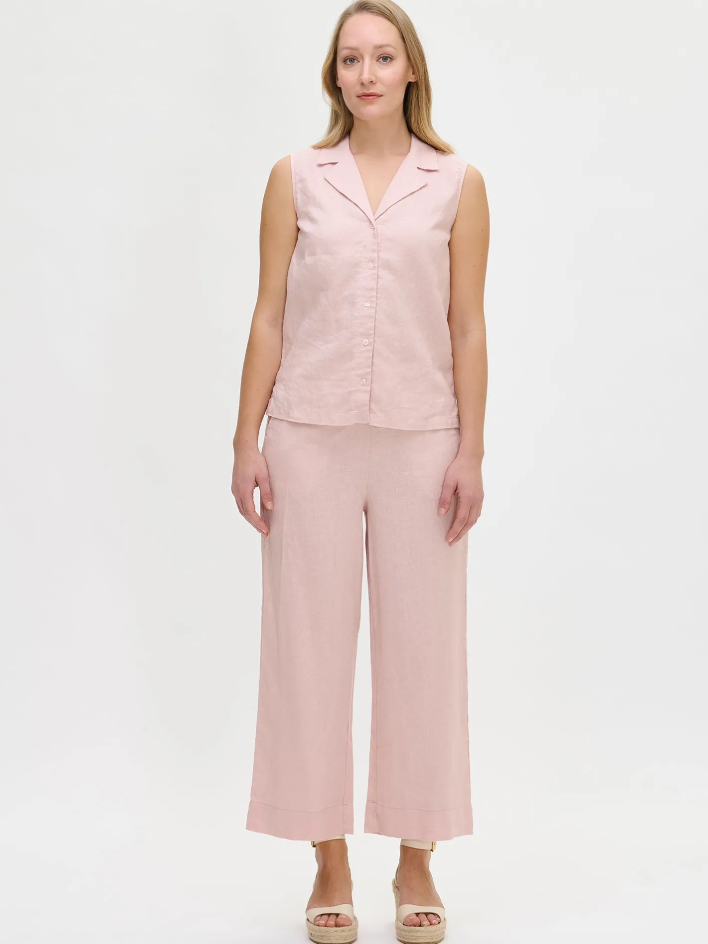 Naisten tyylikäs vaaleanpunainen Lin-pellavatoppi. Ajaton pellavatoppi on ihana vaate vuoden ympäri. Yhdistä Lin-toppi samanvärisiin ja viimeistele asu . Lin-topissa on kauniisti muotoiltu kaulus, nappilista edessä ja sivuhalkiot. Topin pituus koossa 38 on noin 65 cm. Materiaali on kudottua pellavakangasta, joka on kestävää ja hengittävää. Pellavalle on ominaista luonnollinen pieni rypistyminen. Tuote on esipesty tuotannossa, joten se ei kutistu ensimmäisessä pesussa.