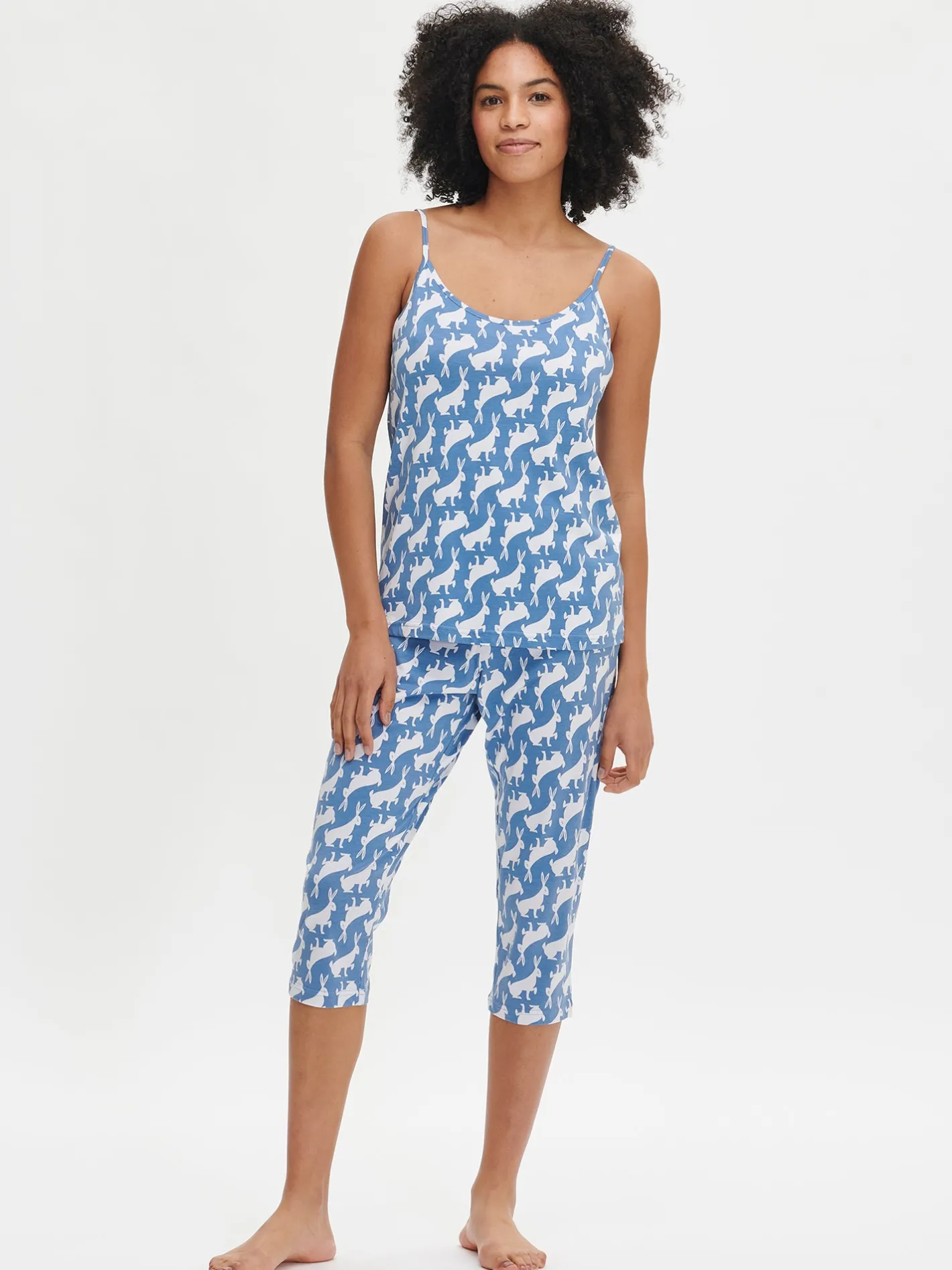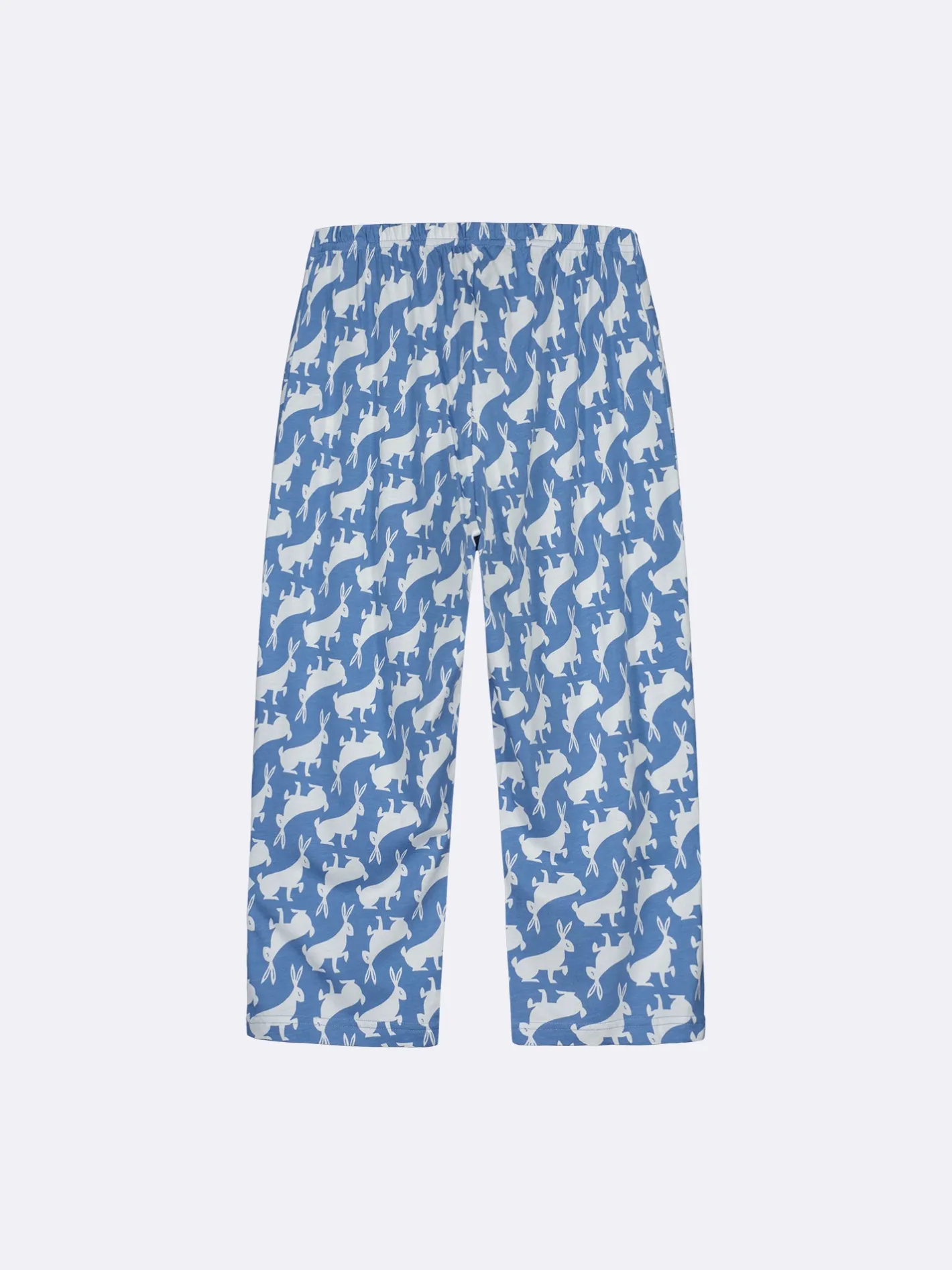 Naisten kuosilliset siniset Loikka-housut. Rennot, suoralahkeiset housut ovat 3/4-pituiset. Lahkeen sisäpituus koossa M on noin 50 cm. Materiaali on laadukasta, iholla miellyttävän pehmeältä tuntuvaa ja helppohoitoista puuvilla-modaalia, joka pysyy hyvänä pesusta toiseen. Täydellinen valinta rentoihin päiviin, joissa mukavuus ja tyyli ovat etusijalla.
