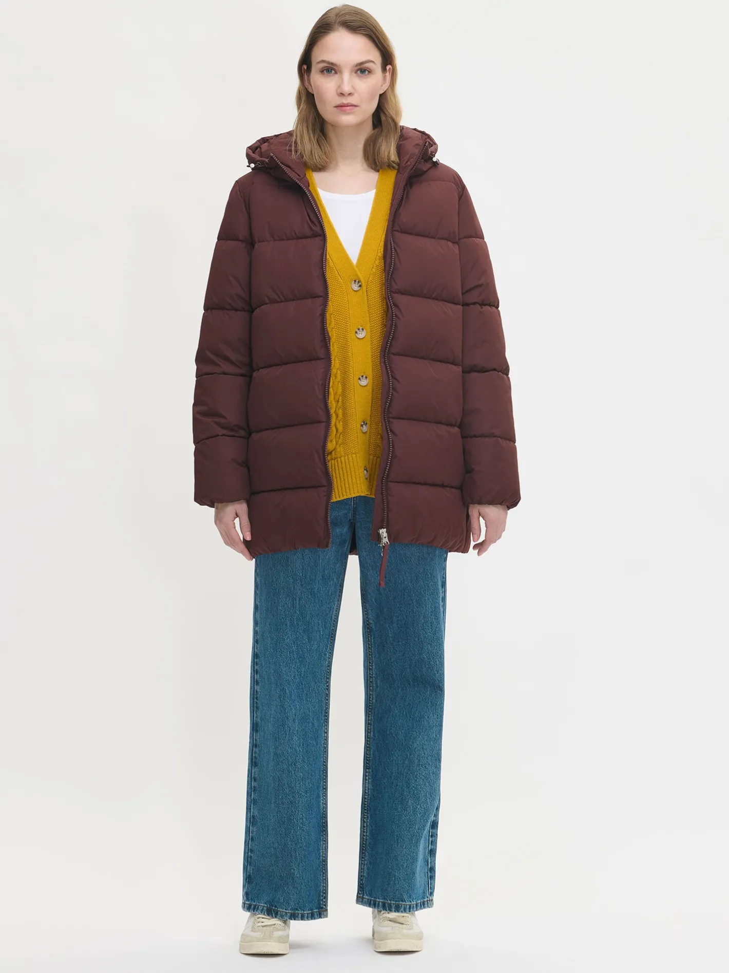 Lämmin ja muhkea tummanruskea Lumi-toppatakki miellyttävän kevyellä vanuvuorella. Takissa on lämmin huppu, jossa kiristysmahdollisuus. Hihansuissa ja helmassa on kuminauhareunus. Takissa on sivutaskut ja tuulilistallinen kaksisuuntainen vetoketjukiinnitys. Takin pituus koossa M on noin 85 cm. Materiaali on laadukasta, vettähylkivää ja kierrätyspolyesteria. Takissa on Sorona-vanu.
