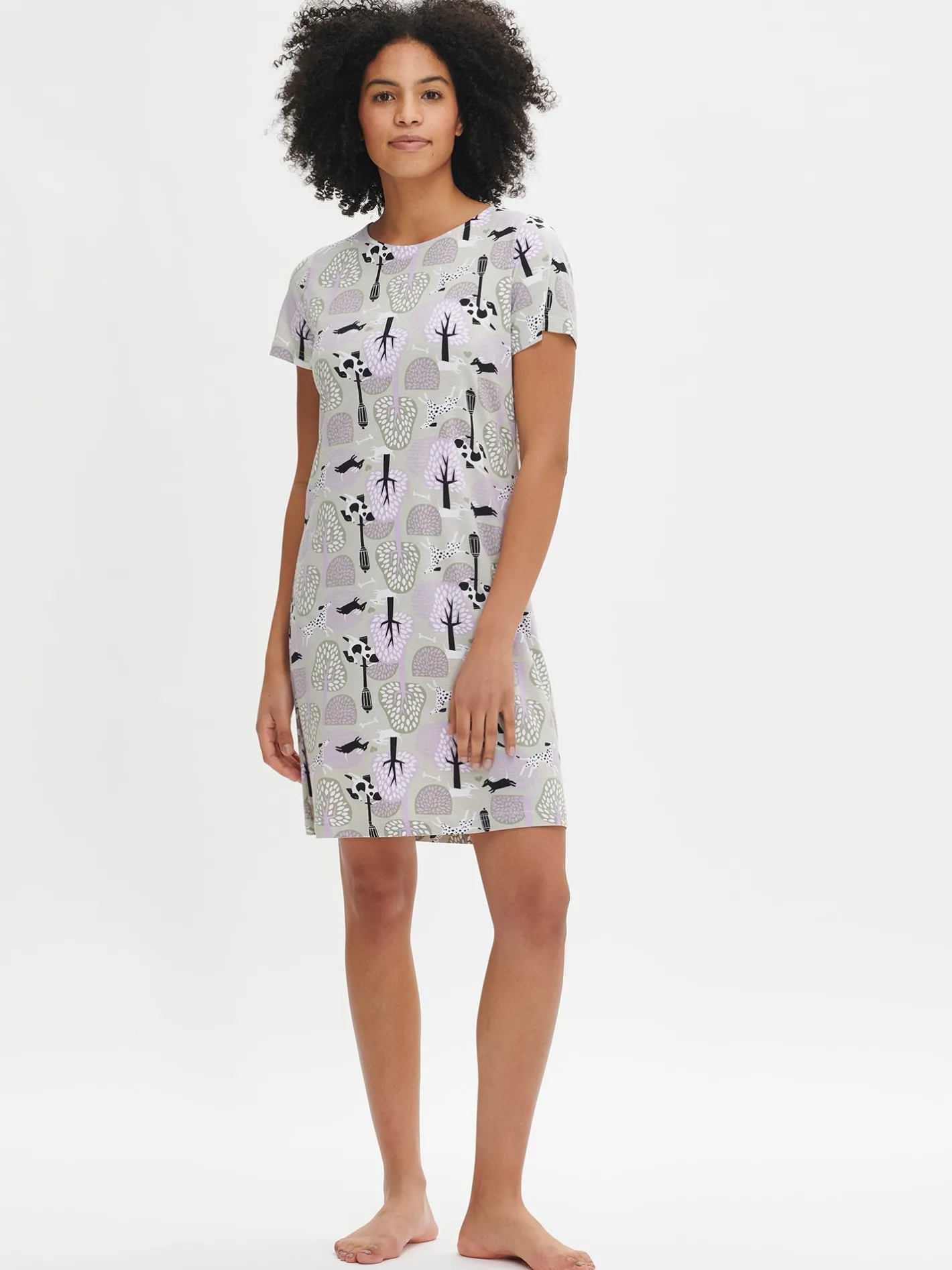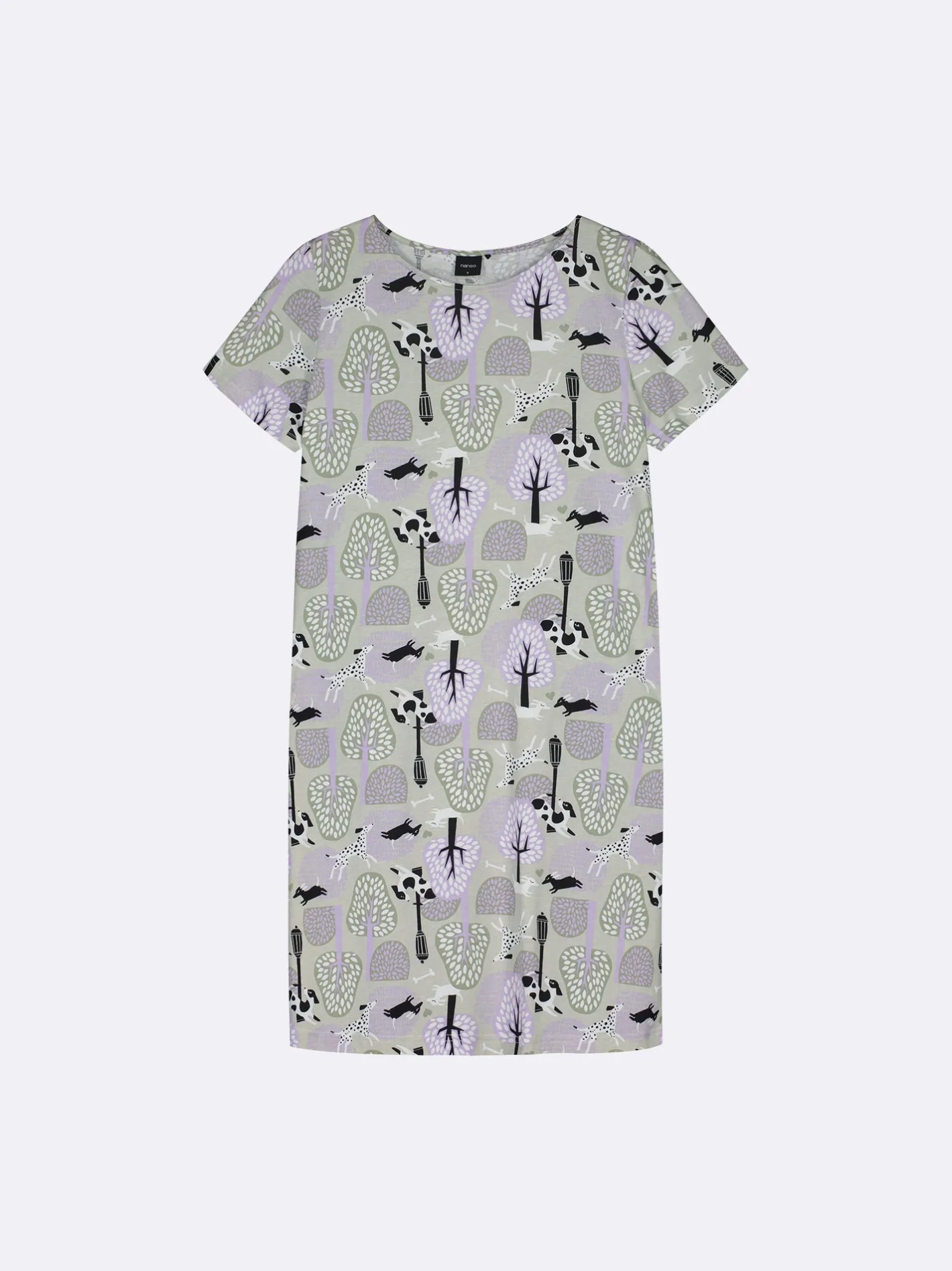 Naisten kuosillinen vihreä Luna-yöpaita lyhyillä hihoilla ja ovaalilla pääntiellä. Yöpaidan pituus koossa M on noin 95 cm. Materiaali on laadukasta, iholla miellyttävän pehmeältä tuntuvaa ja helppohoitoista puuvilla-modaalia, joka pysyy hyvänä pesusta toiseen.