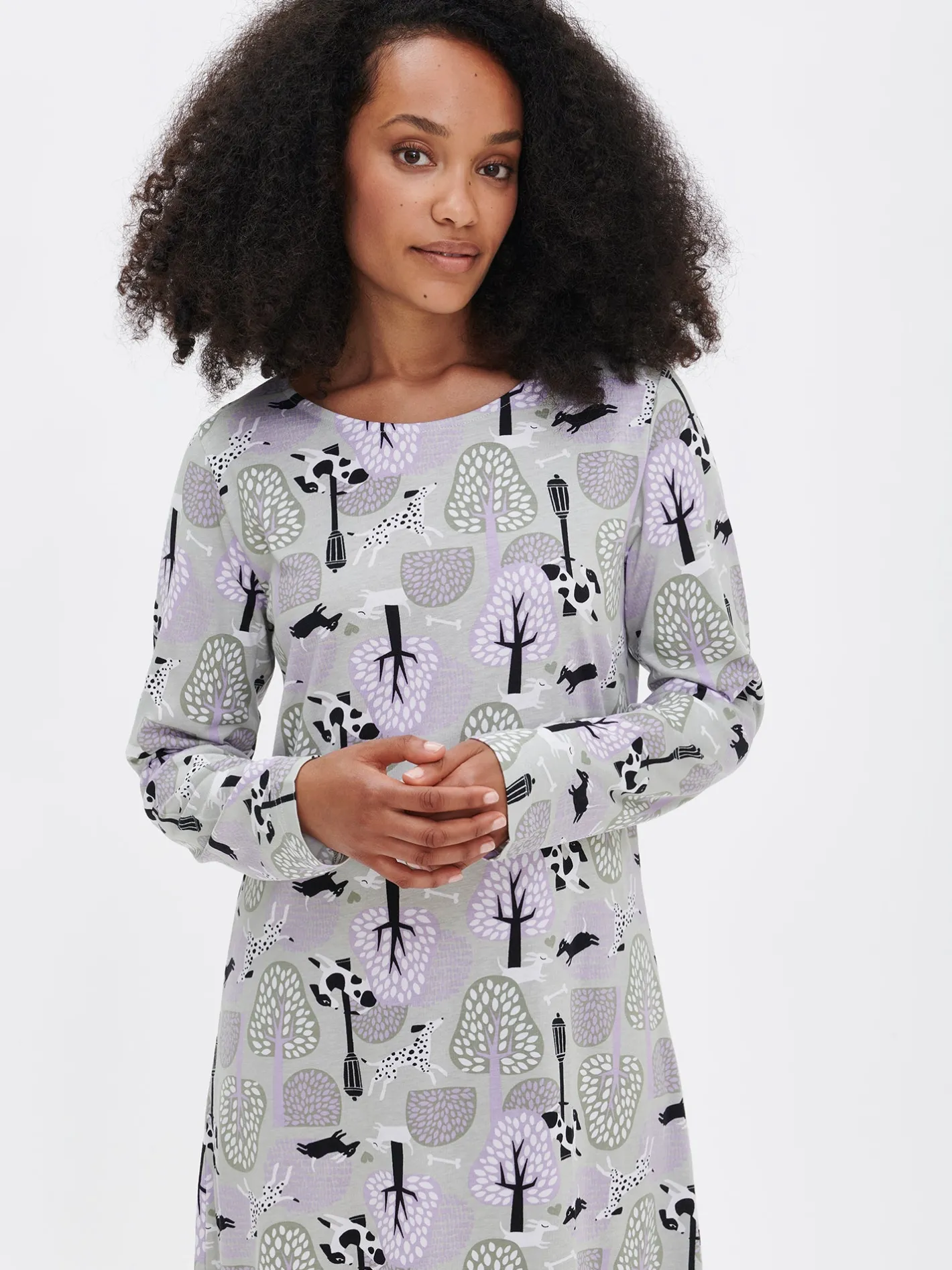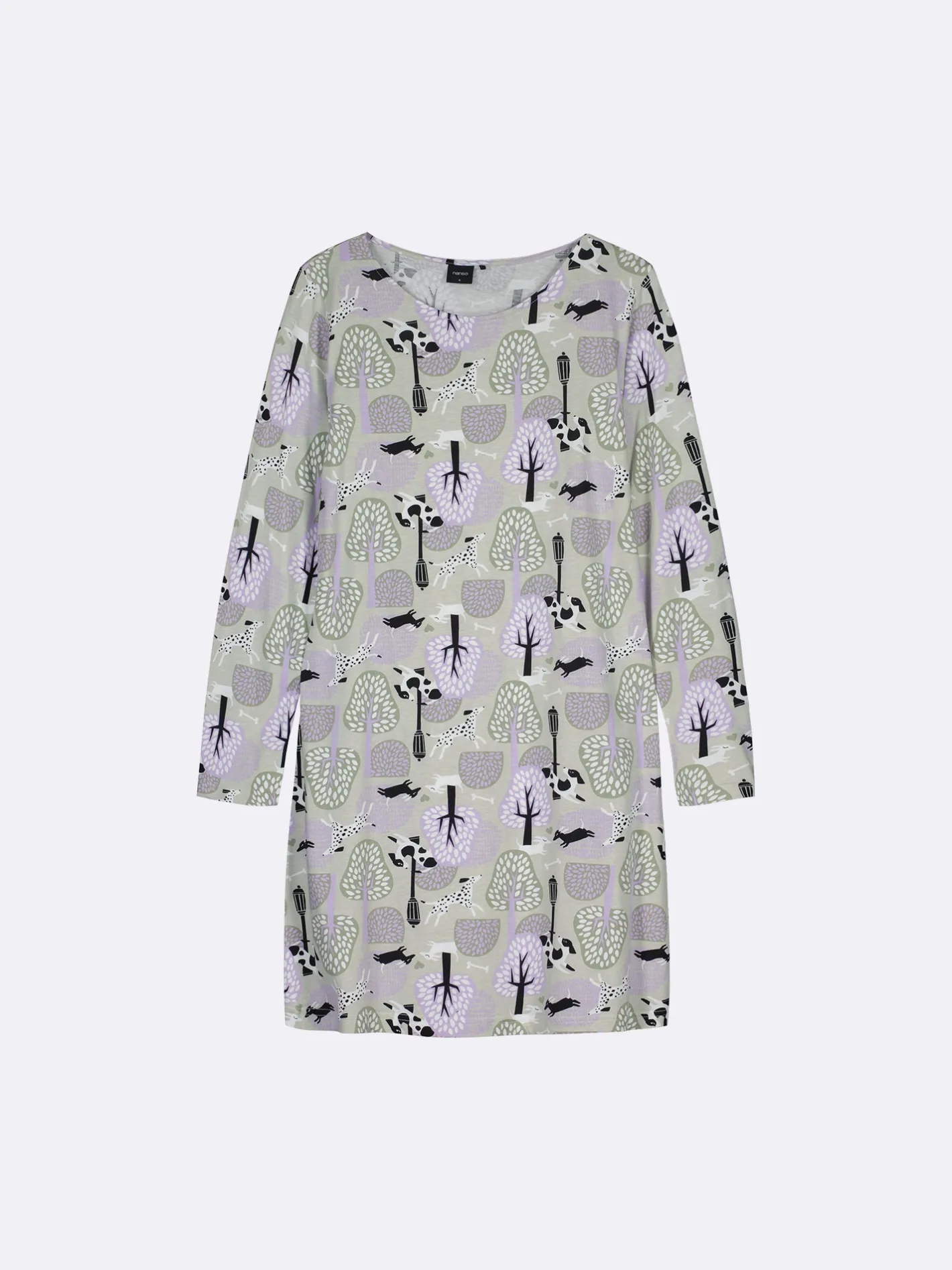 Naisten kuosillinen vihreä Luna-yöpaita pitkillä hihoilla ja ovaalilla pääntiellä. Yöpaidan pituus koossa M on noin 95 cm. Materiaali on laadukasta, iholla miellyttävän pehmeältä tuntuvaa ja helppohoitoista puuvilla-modaalia, joka pysyy hyvänä pesusta toiseen.