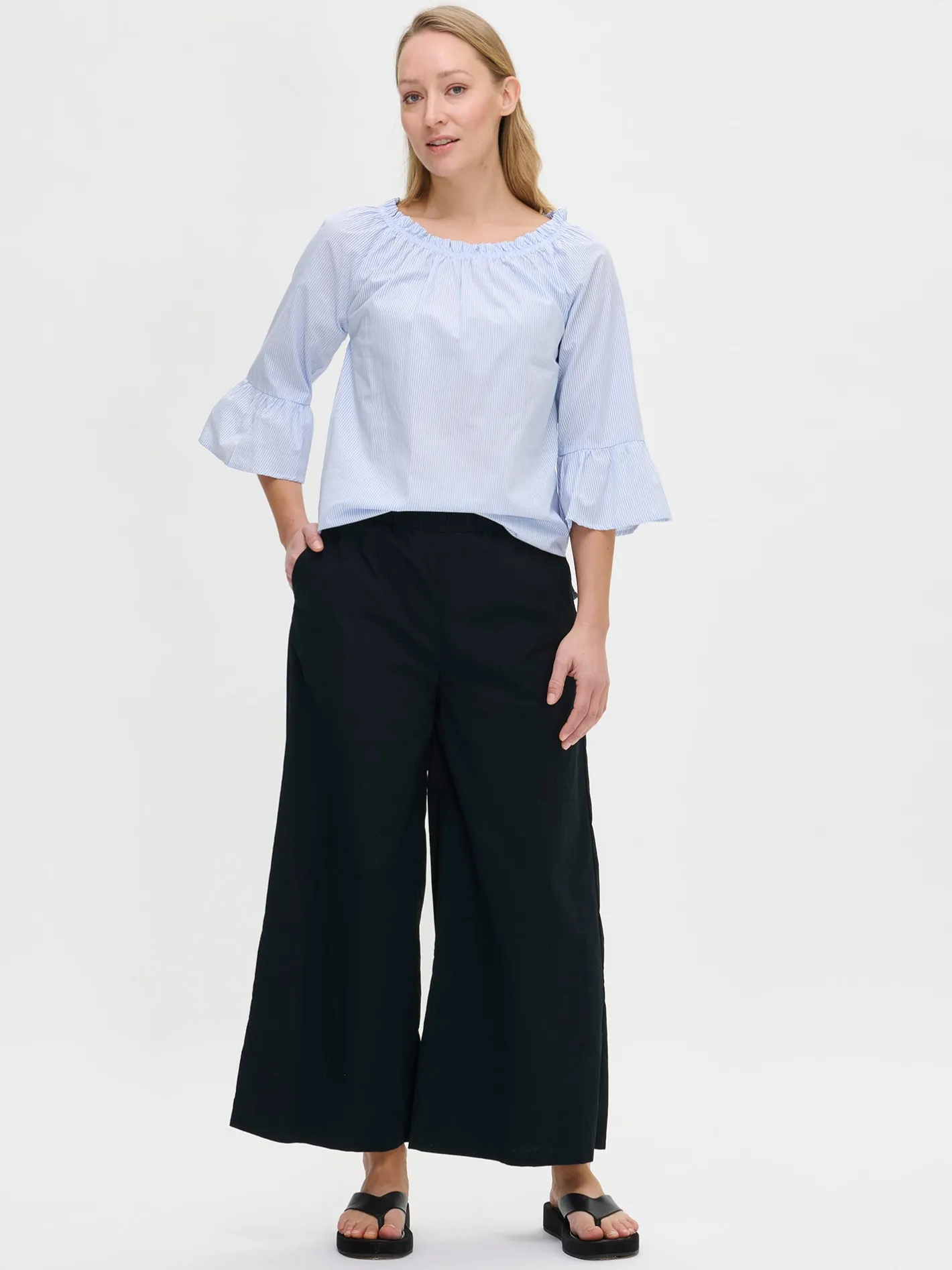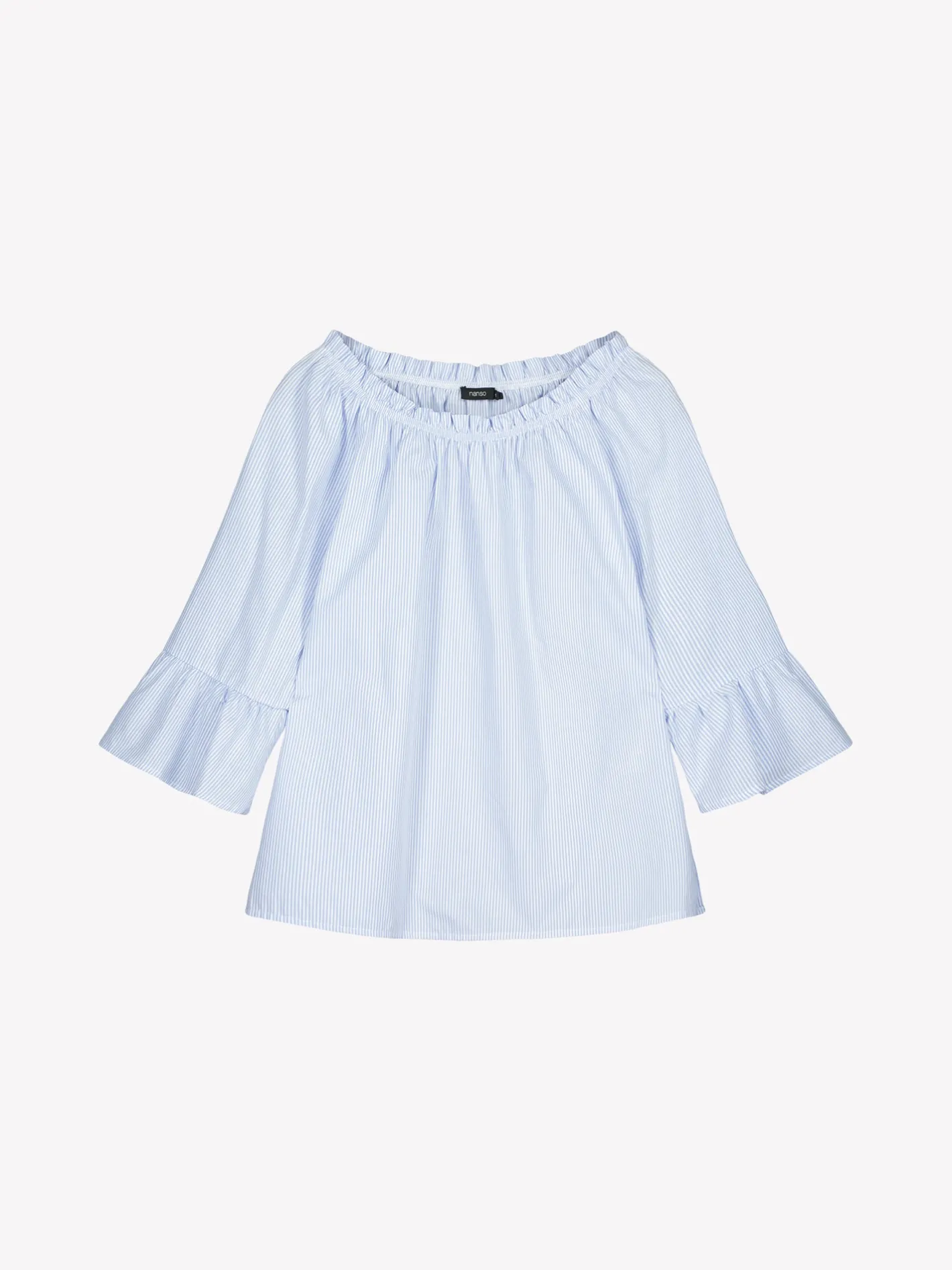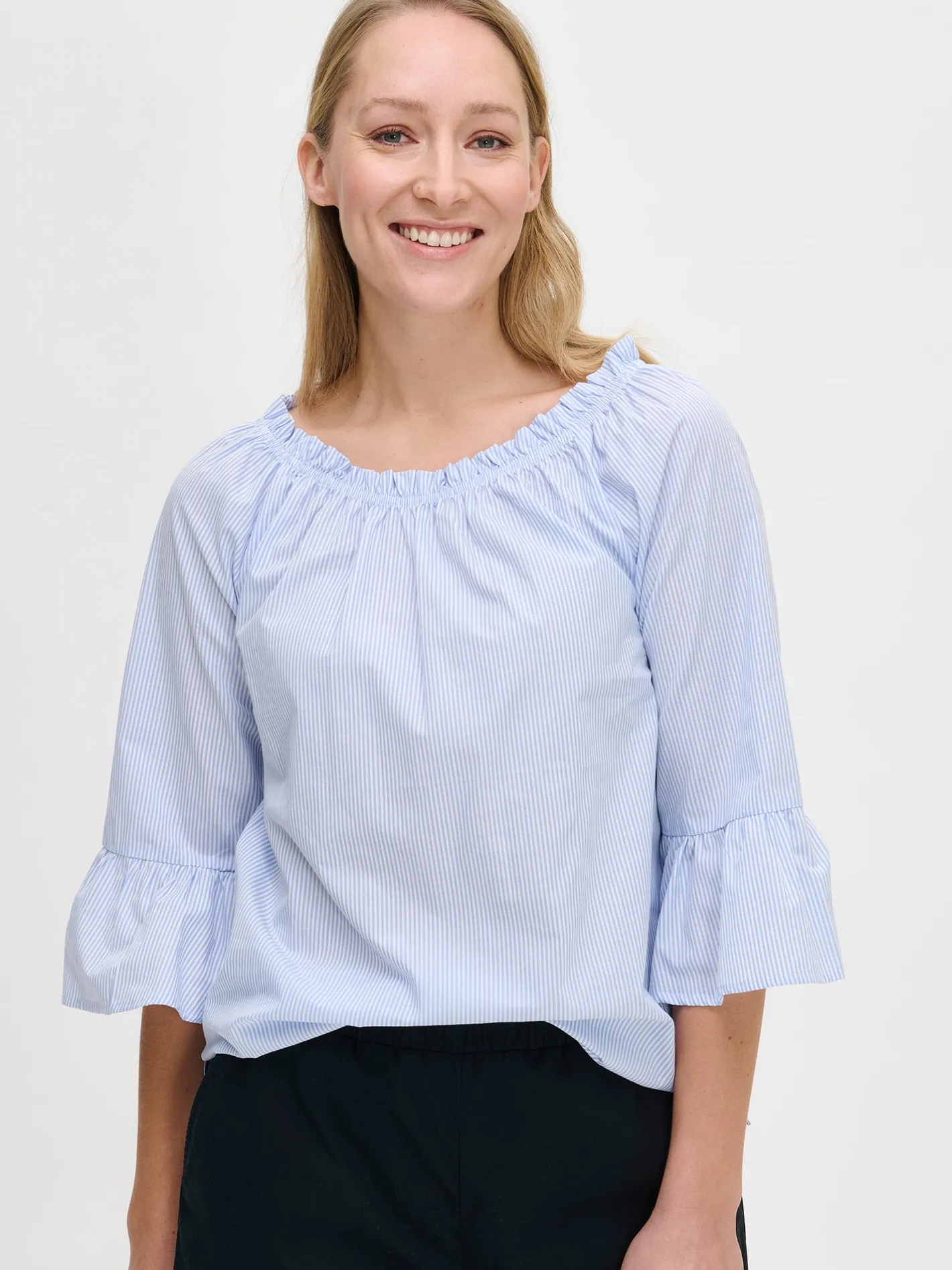 Naisten raidallinen sininen Luotsi-pusero. Kauniissa puserossa on joustava rypytetty pääntie. Puseron 3/4 pituisissa raglanhihoissa on poimutetut kaitaleet hihansuissa ja helmassa on halkiot sivuissa. Puseron pituus koossa 38 on noin 64 cm. Materiaali on kevyttä, mutta ryhdikästä kudottua puuvillakangasta.