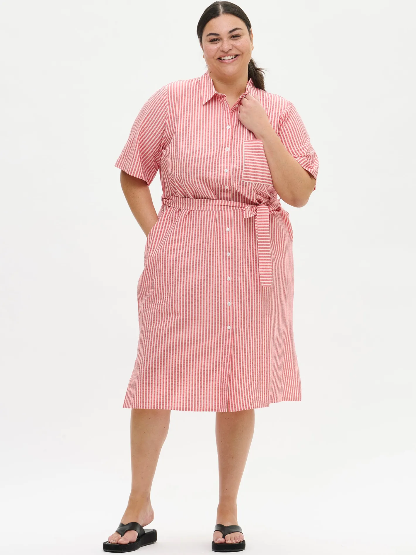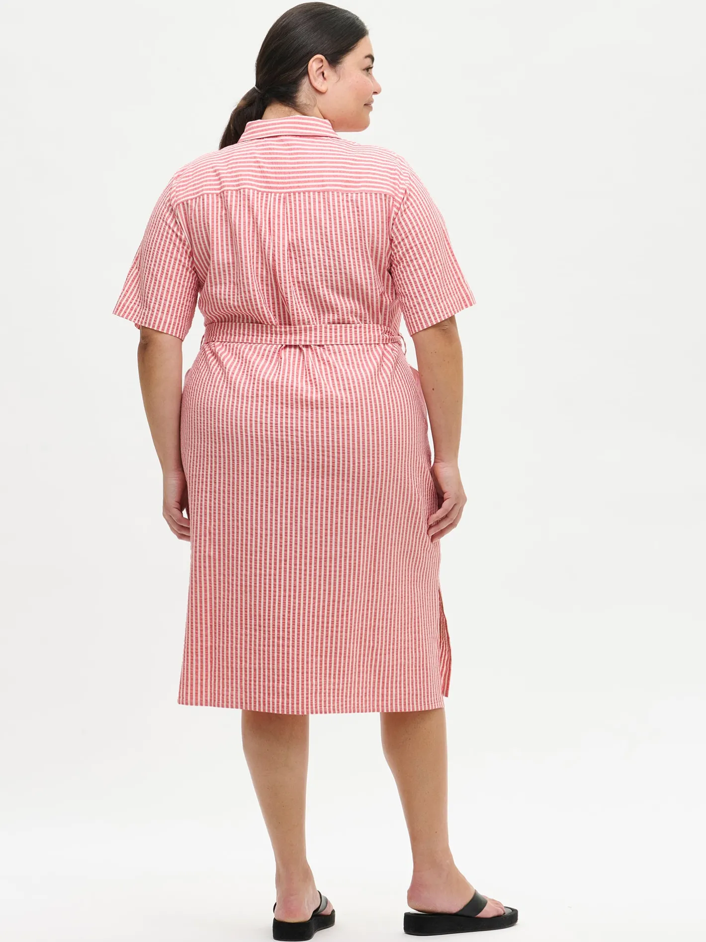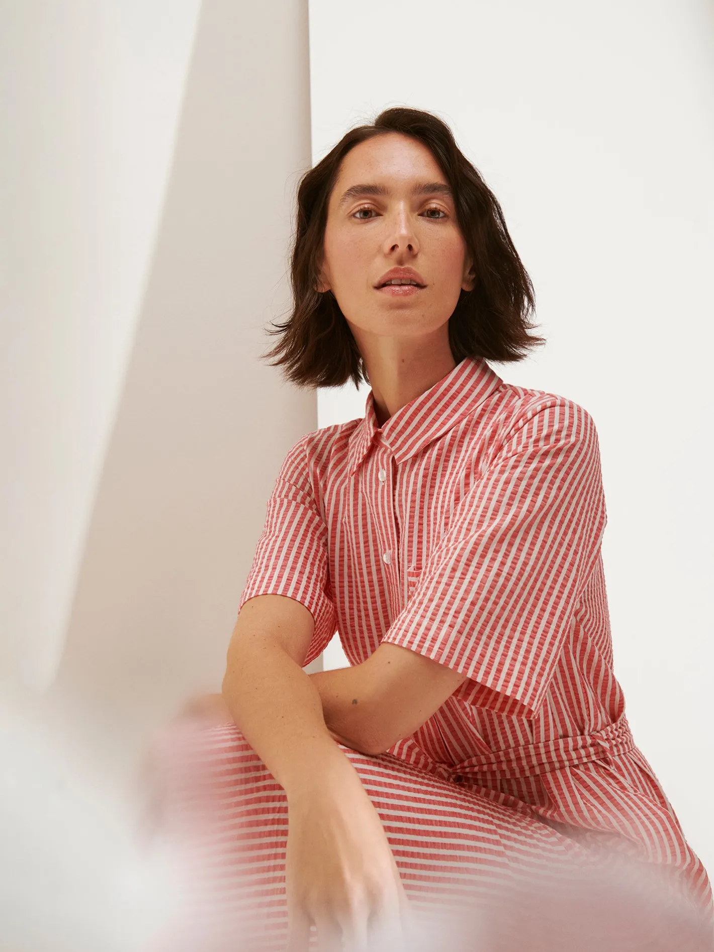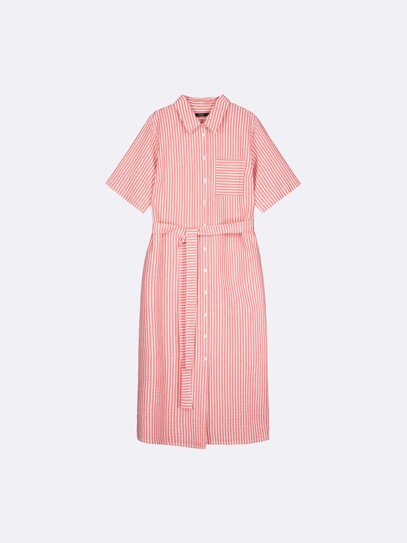 Naisten raidallinen punainen Marea-paitamekko. Raikas raitamekko on klassinen ja ajaton luottovaate kesään. Rennossa mekossa on pudotettu olkalinja, kaulus ja napit edessä. Mekossa on yksi rintatasku ja sivutaskut. Leveät hihat ovat 2/4 pituiset. Vyötäröllä on irrotettava vyö ja helmassa pitkät halkiot. Mekon pituus koossa 38 on noin 120 cm. Materiaali on kevyttä kudottua puuvilla-viskoosi-elastaanikangasta, jossa on kaunis pintastruktuuri.
