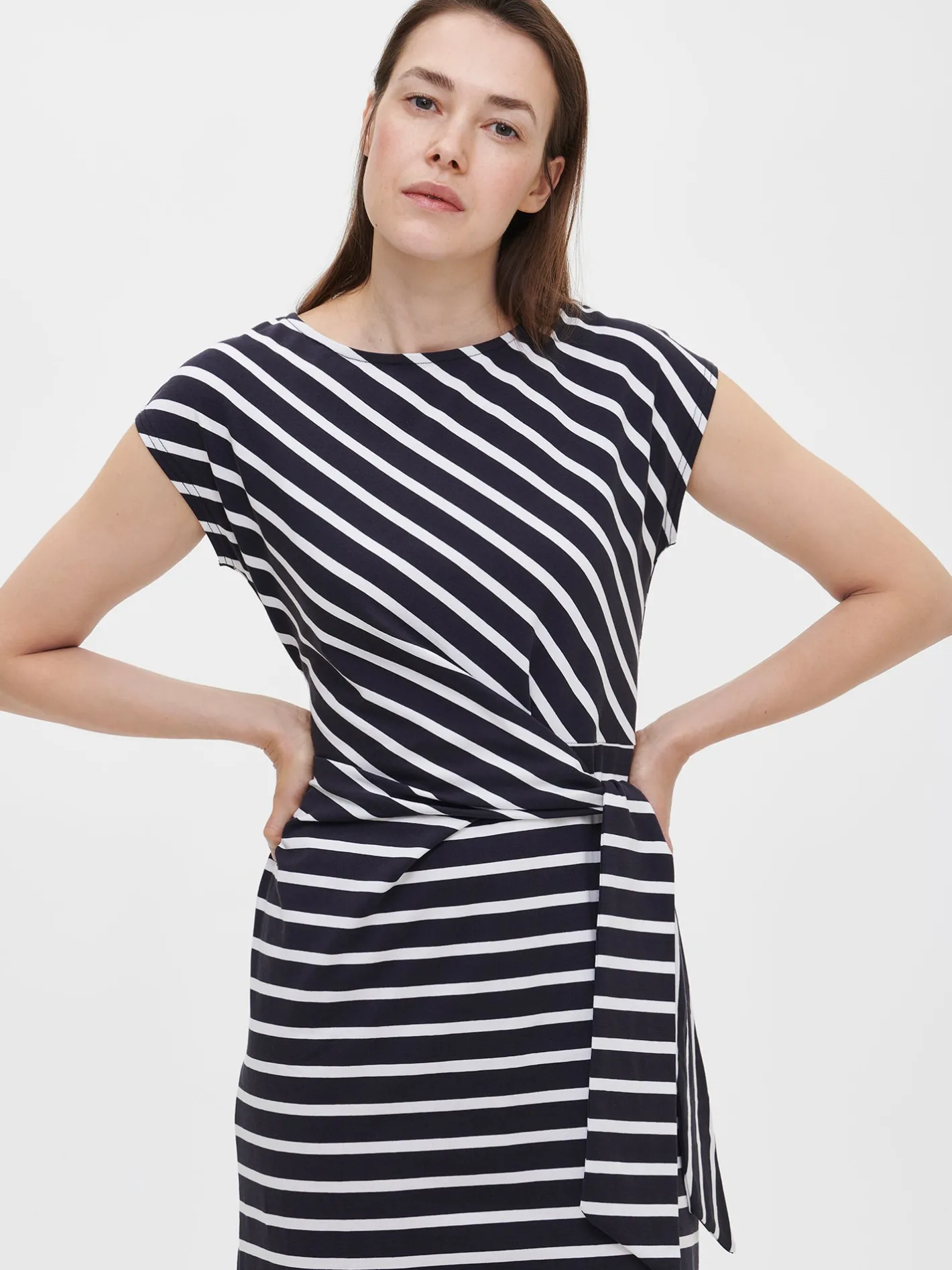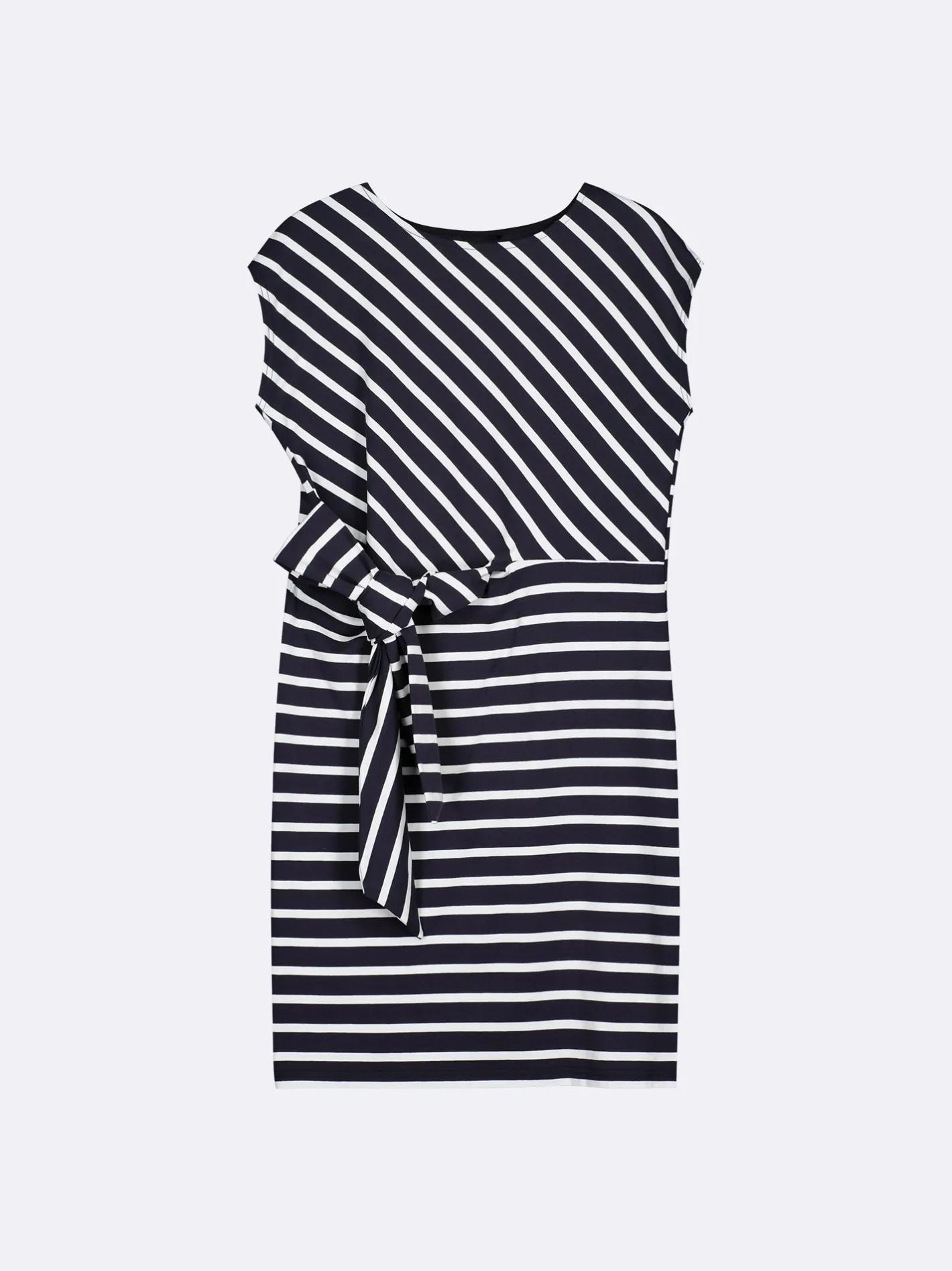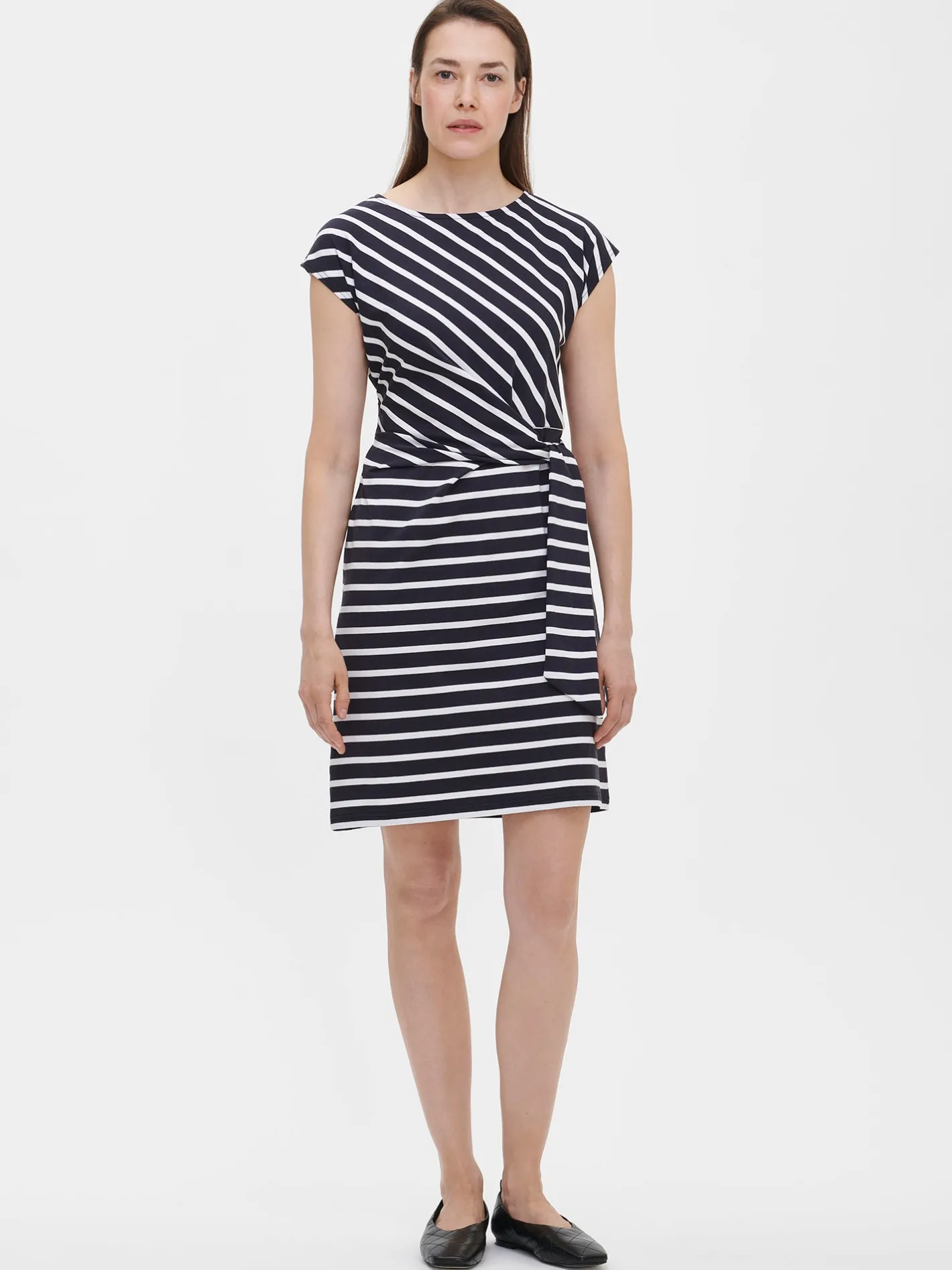 Naisten tummansininen raidallinen Marianne-mekko. Mekossa on kantilla viimeistelty venepääntie ja holkkihihat. Suoralinjaisessa mekossa on kauniina yksityiskohtana vyötärölle muotoa tuova nauhoilla solmittava solmuke. Mekon pituus koossa M on noin 95 cm. Materiaali on laadukasta ja helppohoitoista puuvilla-elastaani-neulosta, joka pysyy hyvänä pesusta toiseen. Tämä kaunis mekko yhdistää tyylikkyyden ja mukavuuden, ja vyö tuo ilmettä sekä muotoa, tehden siitä täydellisen valinnan niin rentoihin hetkiin kuin tyylikkäisiin tilaisuuksiin.