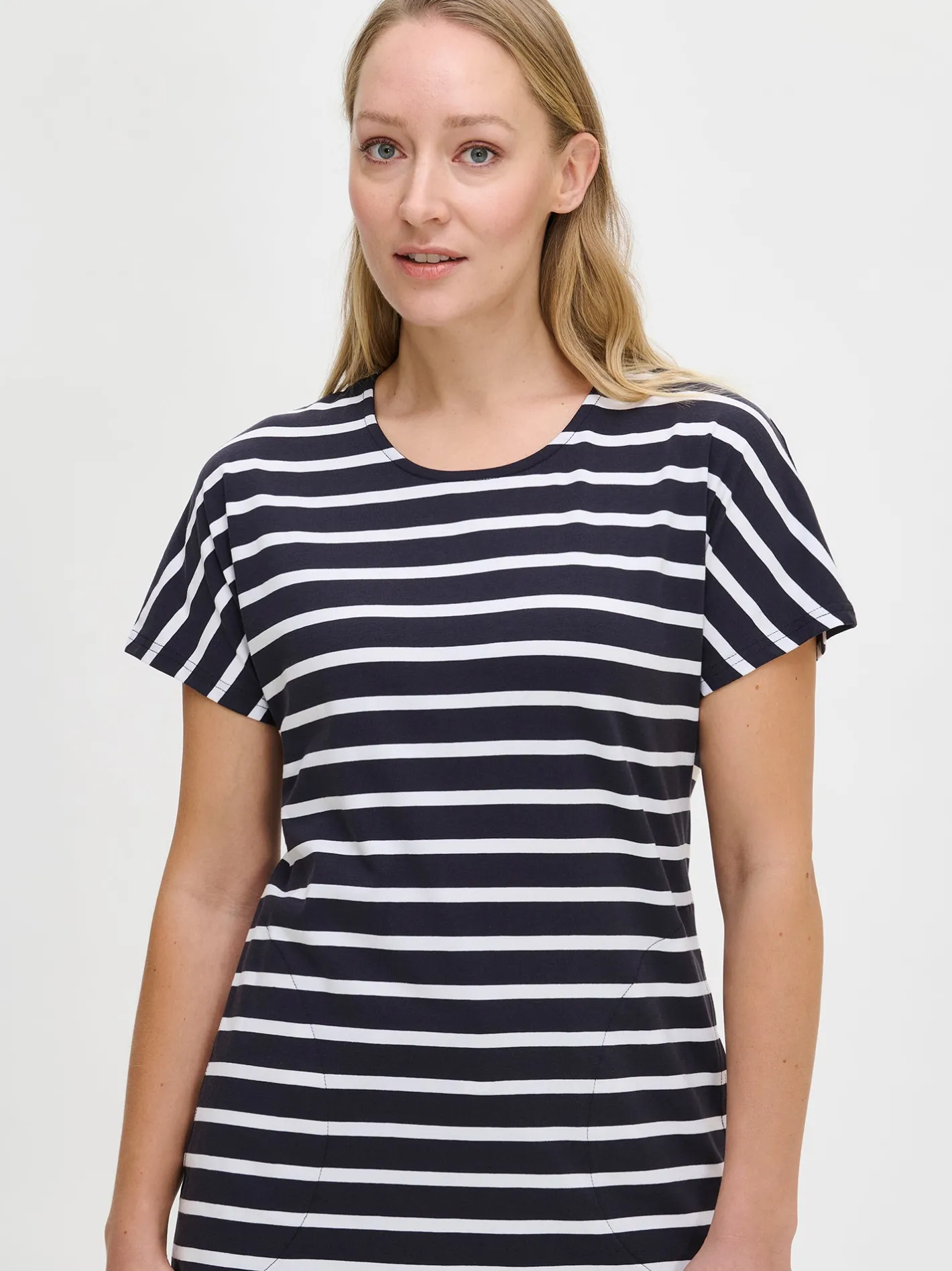 Naisten tummansininen raidallinen Marianne-tunika. Suoralinjaisessa tunikassa on kantilla viimeistelty avara pyöreä pääntie, sivuissa taskut ja holkkihihat. Tunikan pituus koossa M on noin 80 cm. Materiaali on laadukasta ja helppohoitoista puuvilla-elastaani-neulosta, joka pysyy hyvänä pesusta toiseen. Tämä kauniisti laskeutuva tunika tuo rentoutta ja tyylikkyyttä päivittäisiin asuihin, täydellinen valinta kesäpäiviin tai rennolle päivälle kaupungilla.