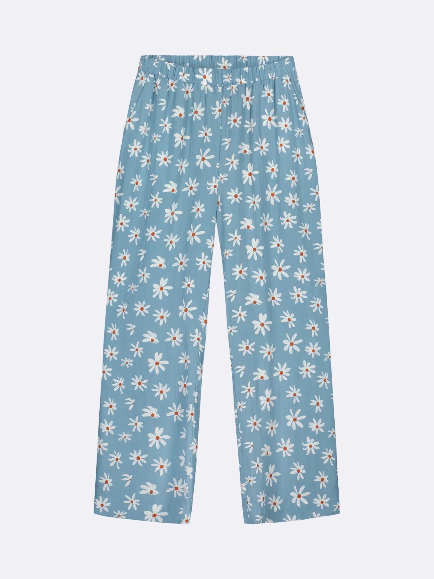 Naisten kuosilliset siniset Marketta-housut sivutaskuilla. Vyötäröllä on mukava ja siisti kuminauharakenne. Housuissa on suorat 7/8 pituiset lahkeet. Materiaali on ylellistä ja ihanan kevyttä kudottua lyocell-popliinikangasta. Materiaalille on ominaista 3-5% kutistuminen ensimmäisessä pesussa.