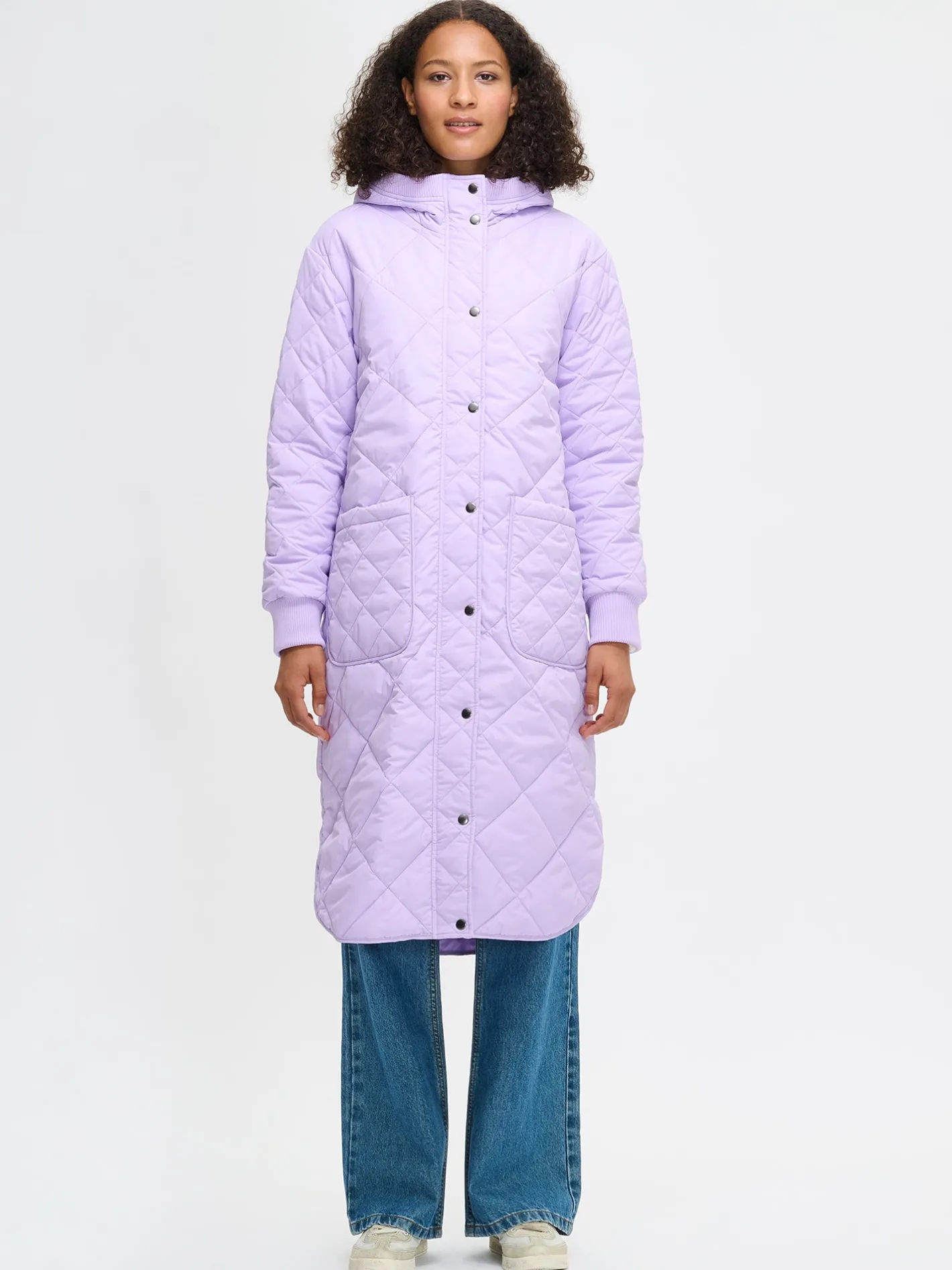 Naisten rennon tyylikäs lila Maxi Hood-tikkitakki kevyellä vanulla ja lämpimällä hupulla. Ajaton tikkitakki on ehdoton vaatekaapin kulmakivi ja luottovaate, joka sopii kaudesta toiseen. Hupullinen tikkitakki on täydellinen valinta välikauteen, sillä se on kevyt ja lämmin vaihtelevassa säässä. Pitkässä hupullisessa takissa on edessä kaksisuuntainen vetoketju ja nepparikiinnitteinen tuulilista. Hupun reunassa ja hihansuissa on mukava neulosresori. Takissa on pudotettu olkalinja, päällitaskut ja pyöristetty helma. Takin pituus koossa M on noin 115 cm. Materiaali on laadukasta vettähylkivää kierrätyspolyesteria ja takissa on Sorona-vanu.